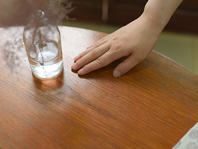 水気が付いたらすぐに拭き取り、熱い物を置く時には下にコースターやクロスを敷くなどのこまめなケアも大切です。