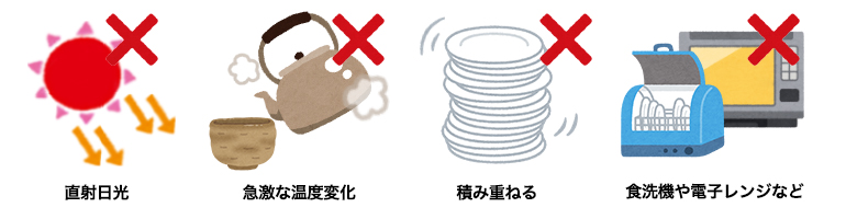 直射日光・温度変化・食器の積み重ね・食洗機・電子レンジ・オーブンに要注意