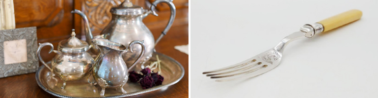 銀のカトラリーには、持ち手部分が木製や象牙などの異素材で作られているものも豊富にありますよね。異素材との継ぎ目部分が水に浸かり過ぎると持ち手がグラつく原因となりますので、洗う際はその箇所をなるべく水に浸けないようご注意ください。