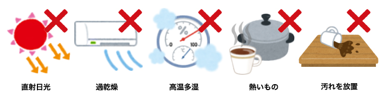 直射日光・過乾燥・高温多湿・熱い物の直置きは避け、汚れたらすぐに対処する