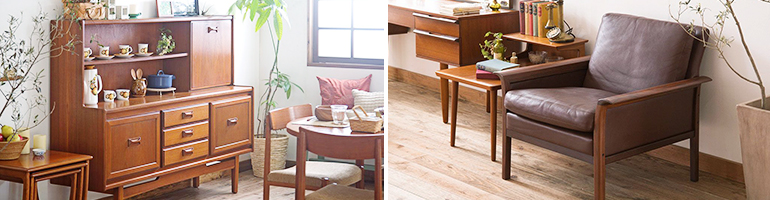 またアンティーク家具と同様、無垢材だけでなく突板が多用されているのも特徴のひとつ。突板家具の場合は、先述のようにキッチン周りやお風呂場などの多湿な環境に置くことは避けてください。チーク材などの高級な美しい木目を活かした家具がたくさんあるので、適正なケアでなるべく美しさをキープしていきたいですね。