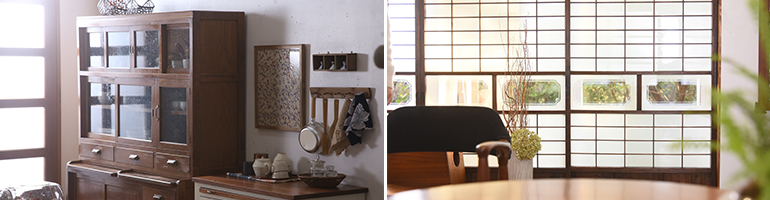 日本(和製)ヴィンテージ家具でも、天然木材を使用した無垢材家具や突板家具がたくさんあります。例えば和箪笥・座卓・レトロガラス戸が付いた食器棚などが挙げられますが、どのアイテムも重厚感のあるアンティーク品と比べるとシンプルでカジュアルなデザインのものが多い印象です。