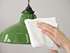 布やブラシなどを使ってシェード・電球・コードなどのホコリを取り除くだけでも十分ですが、汚れが強い場合は中性洗剤を薄めた水に布を浸け、かたく絞って水拭きをし、最後に乾拭きをします。この方法でシェードも電球も綺麗になりますよ。お手入れをする時は、感電しないよう必ず電気を消し、少し時間を置いてから始めましょう。