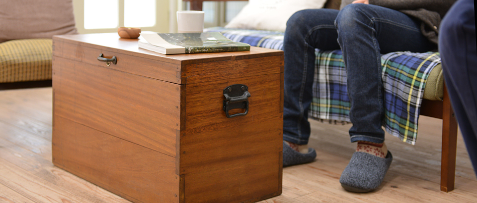 実はスタイルや革製など素材もいろいろあり、蓋部分が丸みを帯びているもの、補強のための帯が四方に巡らされているものなどありますが、テーブルとして利用するにはシンプルな木箱状のものが一番ぴったりです。