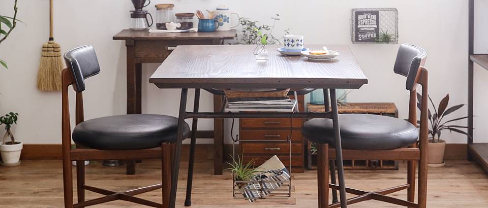 ガレージ風インテリアの定番といえば「古材」と「アイアン」を使うこと。困ったらこれを押さえればOKと言えるほど、いろんな家具と馴染みやすい素材なんです。本当のガレージを思わせる大きな天板と太い鉄脚の作業台は、住まいでは不向きかもしれませんが、華奢な鉄脚であれば気になる圧迫感も軽減できます。コンクリート打ちっぱなしの空間でなくとも、ほど良くガレージ感を出すことができるアイテムですよ。