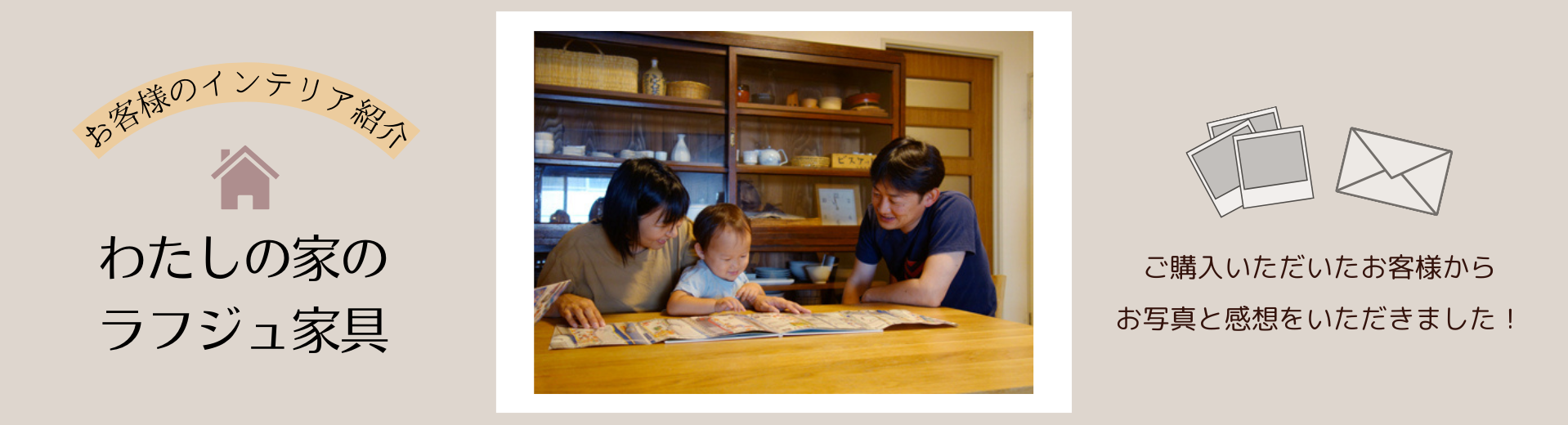 ライター吉沢一人でお伺いした石井さまご一家のお宅。家族団欒の空間を見守るように、ラフジュ工房の収納棚がある様子を拝見してほほえましく幸せな気持ちになりました。小さなお子さまがいるご家庭でも、末永く愛せる家具探しを妥協せずおこなわれてきた石井さま。中に木箱やカゴを入れ、小物をまとめ収納することですっきりとかつお洒落に魅せる技はさすがです。かつての石井さまのように、息子さんが古きよきものの良さを引き継いでいかれることでしょうね。
