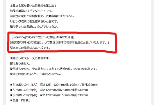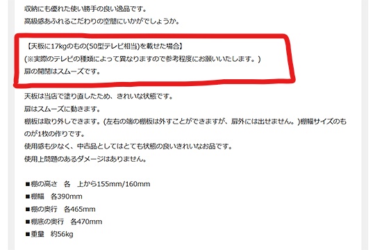 ・テレビ台としての使用が想定される家具は、商品ページ内に【天板に○○㎏のものを載せた場合】という文言があること!