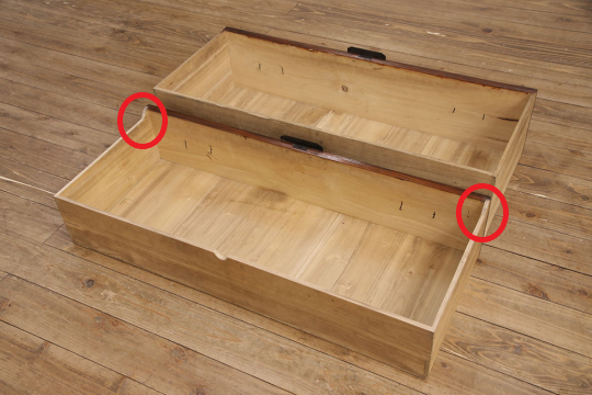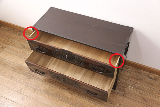 なお、引き出しタイプの家具(チェスト、箪笥など)のように、引き出しと天板の間に補強を入れる隙間がない場合には、引き出しに以下のようなちょっとした加工を施させていただくことがあります。
