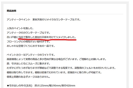 文言に統一性が無く、お客様には少し分かりにくいと感じられてしまうかもしれませんが、要するに「天板をリメイクしています」「天板を取り付けました」という内容が書かれていれば、当店でしっかりと強度のある天板を取り付けたということです。