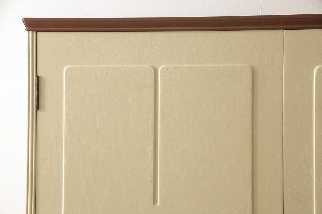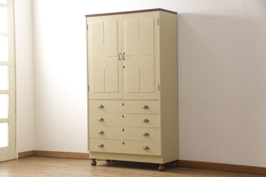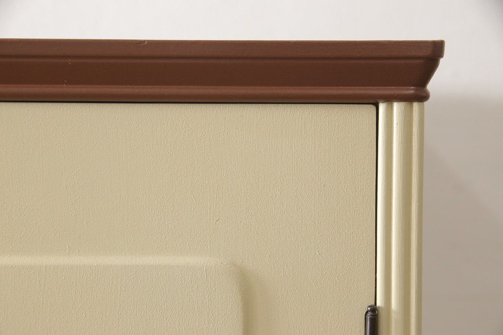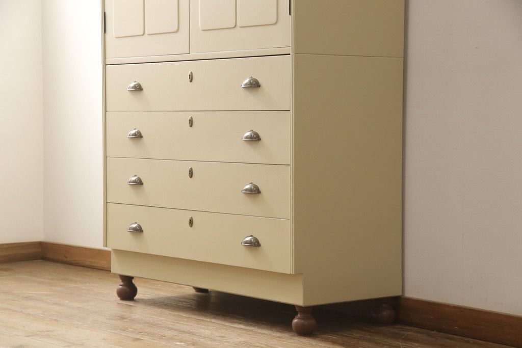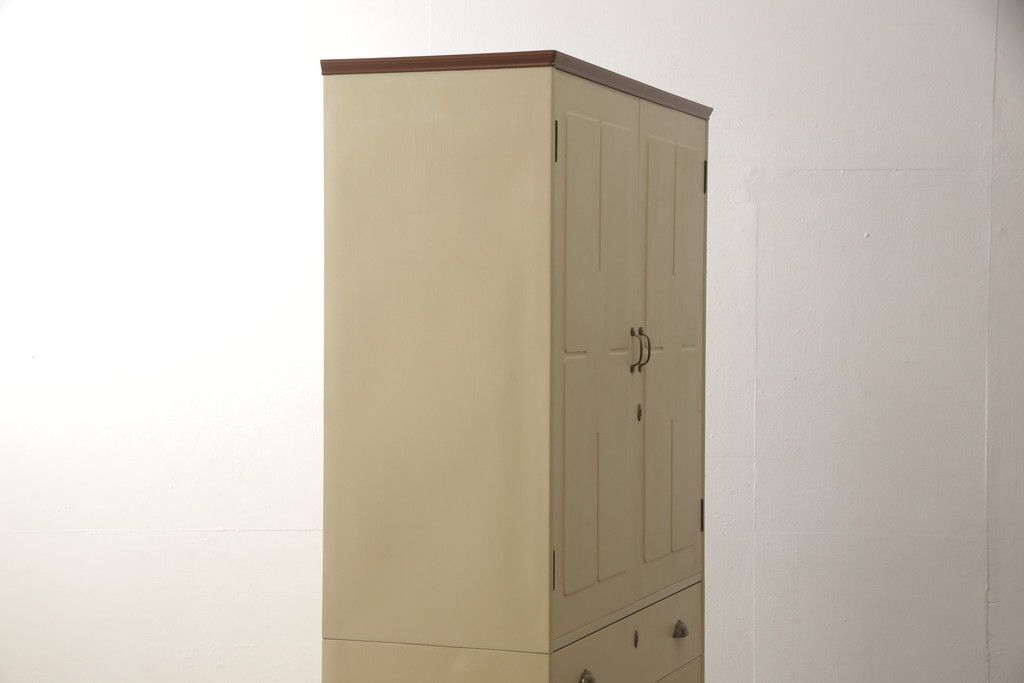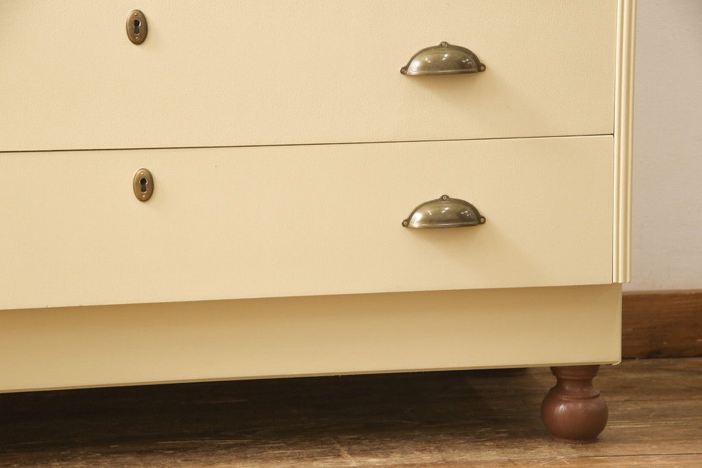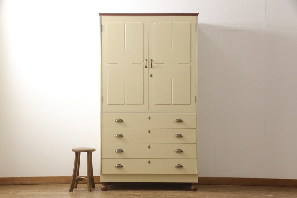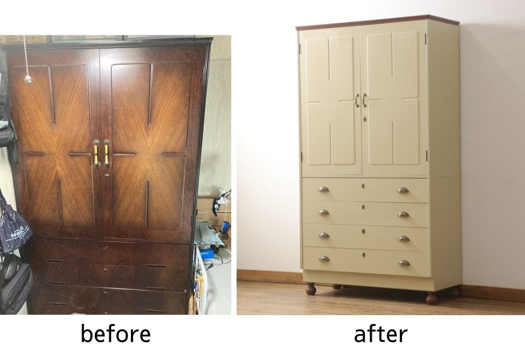 洋服箪笥をペイントリメイク!開き戸と引き出しの取っ手を交換し、鍵穴カバーを取り付け。脚を取り付けて、本体はモカベージュ、天板・脚をシナモンブラウンにペイント仕上げ。