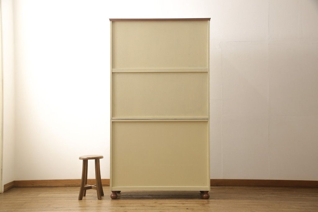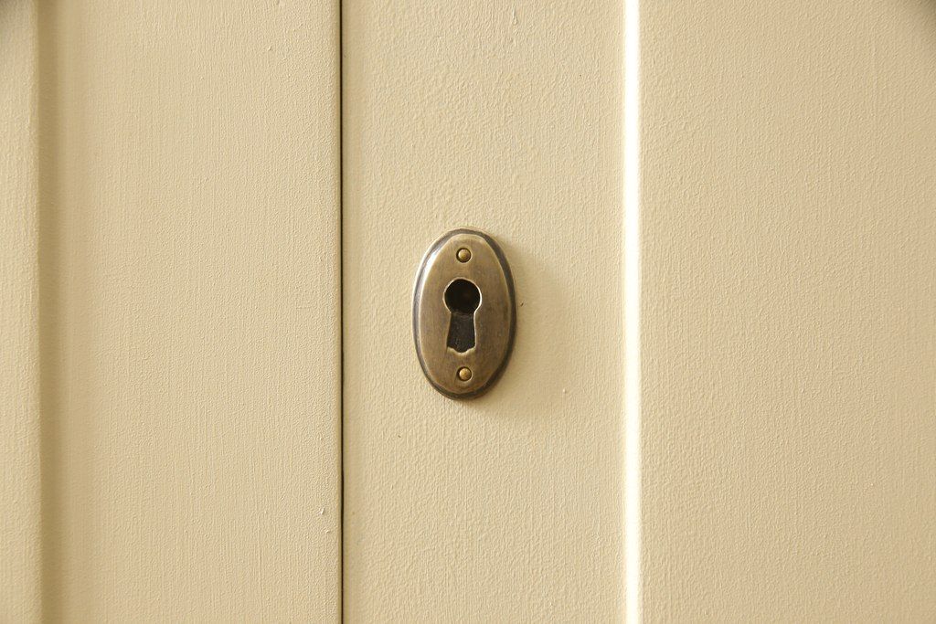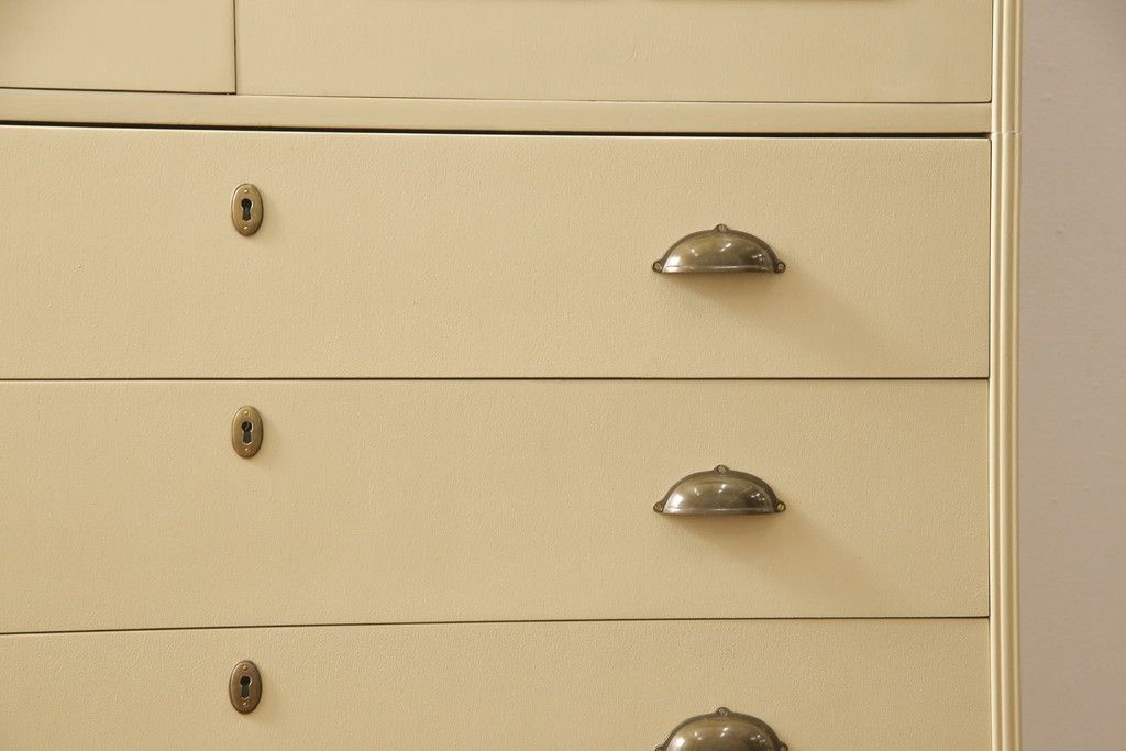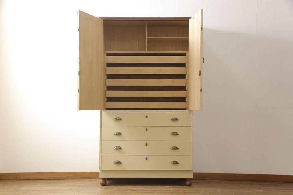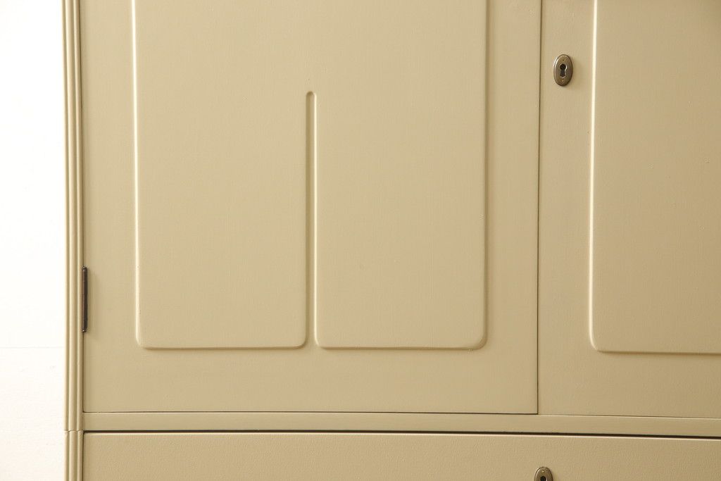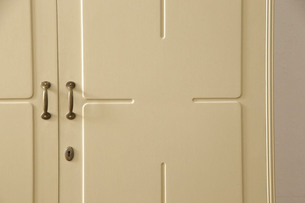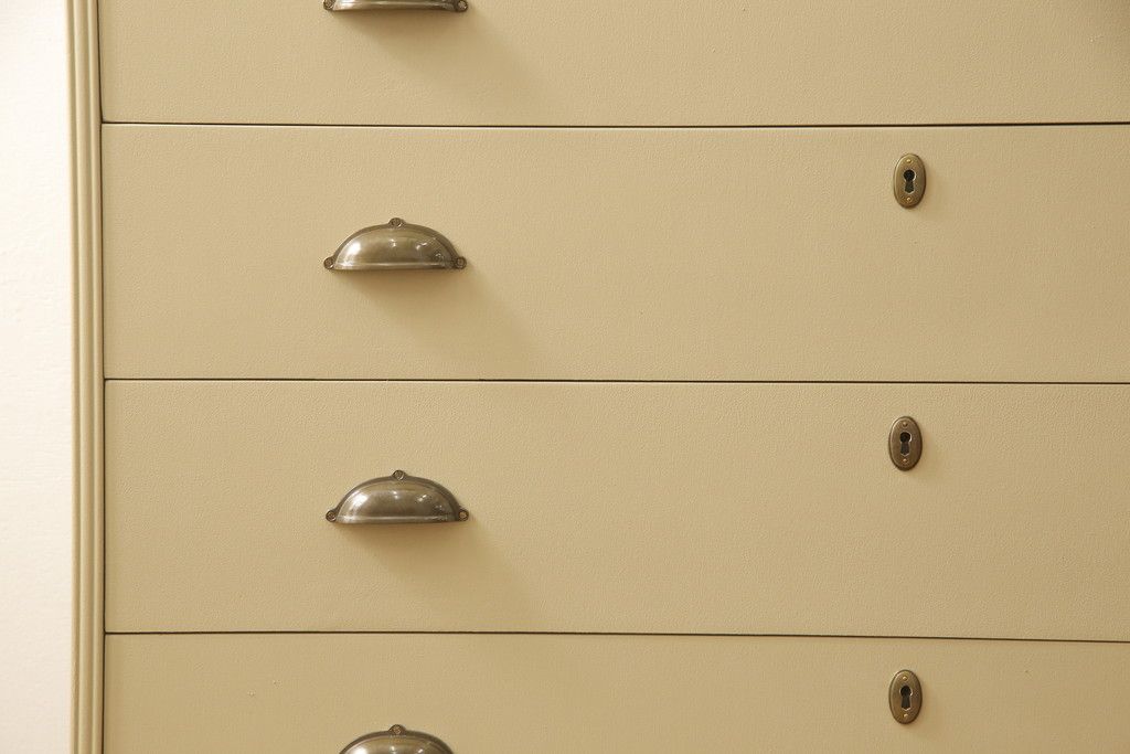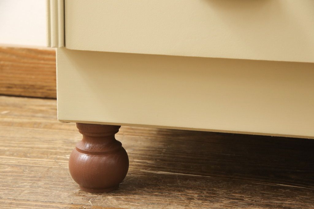 洋服箪笥をペイントリメイク!開き戸と引き出しの取っ手を交換し、鍵穴カバーを取り付け。脚を取り付けて、本体はモカベージュ、天板・脚をシナモンブラウンにペイント仕上げ。