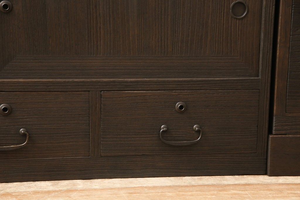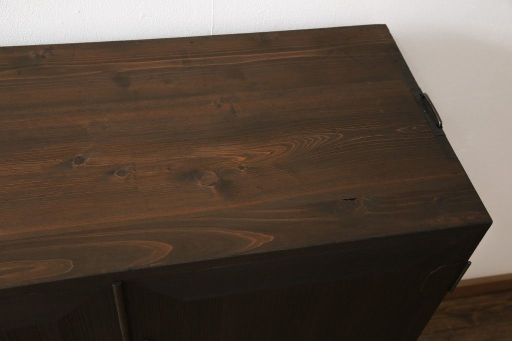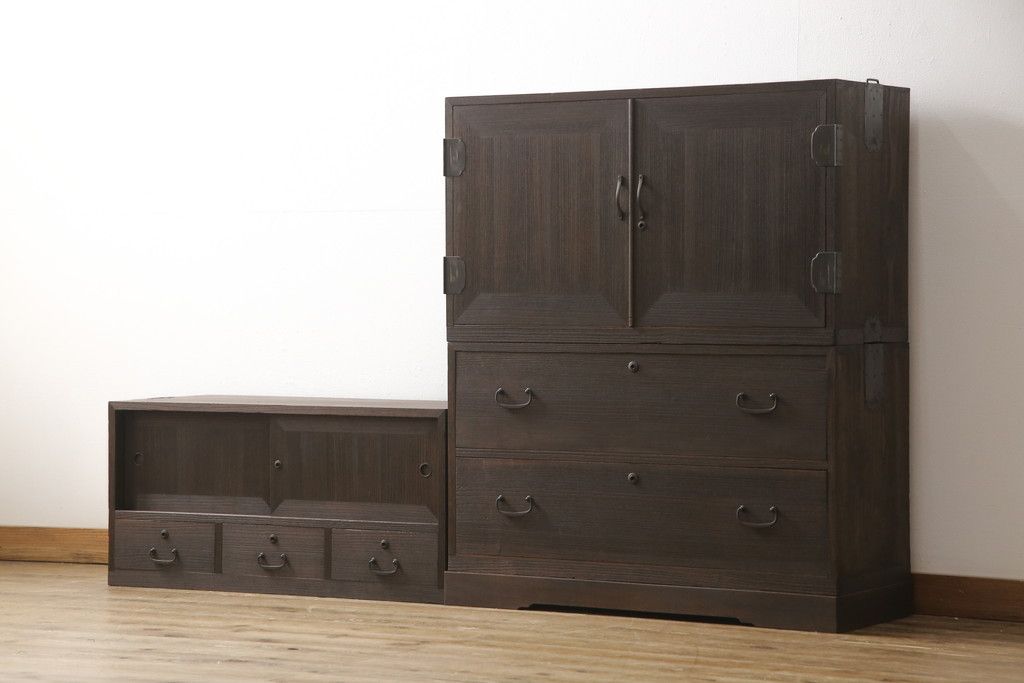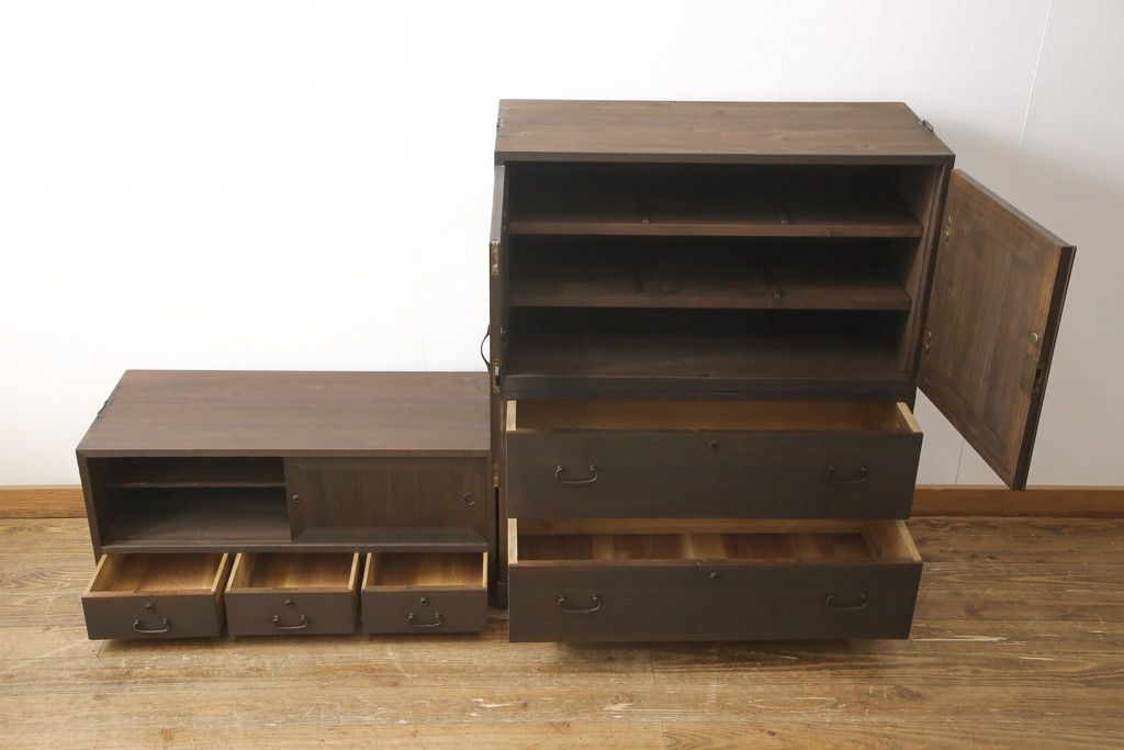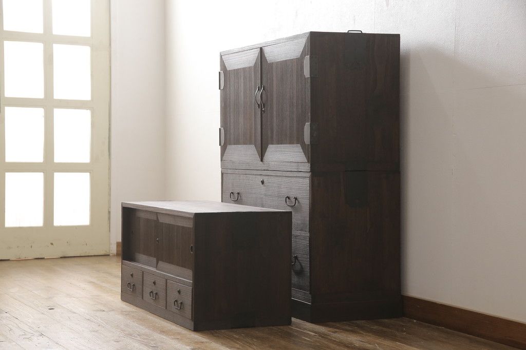 3段重ね桐箪笥をテレビボードと収納箪笥にリメイク!上段は天板を補強しテレビボードに。中段・下段は、観音扉の中に可動式タイプの棚板を設置。どちらもチェスナット系で着色仕上げ。