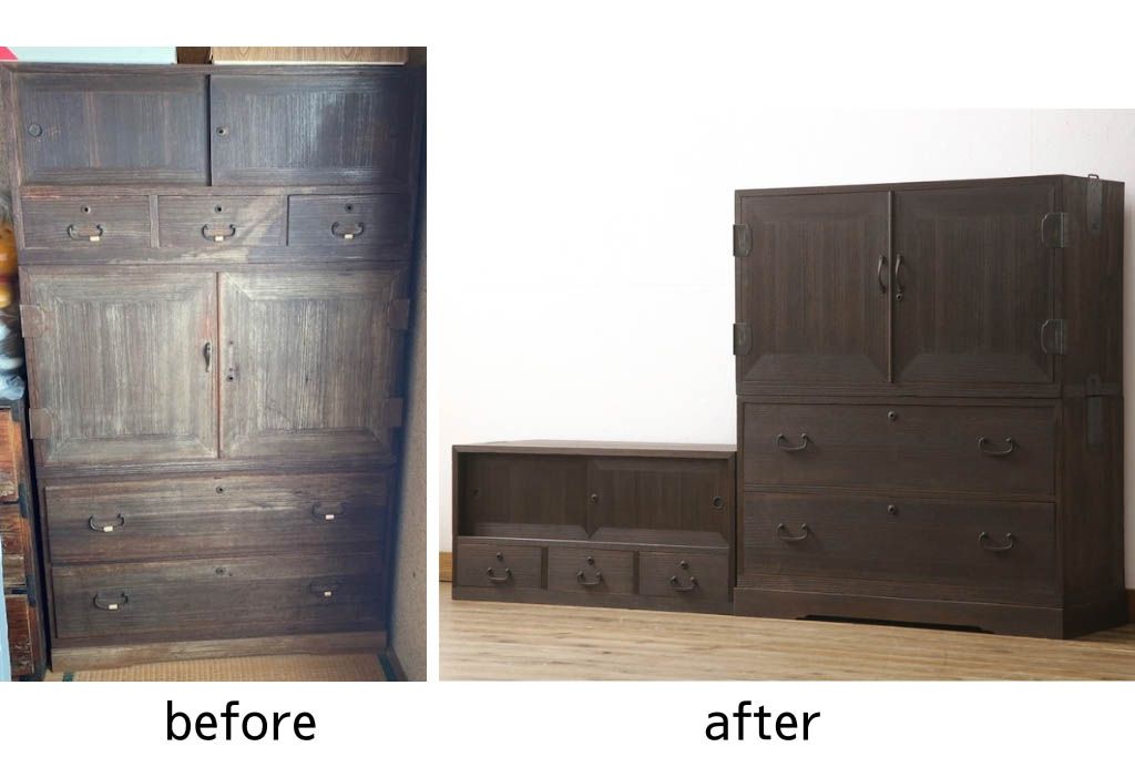 【加工内容】お客様持ち込みの桐箪笥をテレビ台と収納箪笥にリメイク