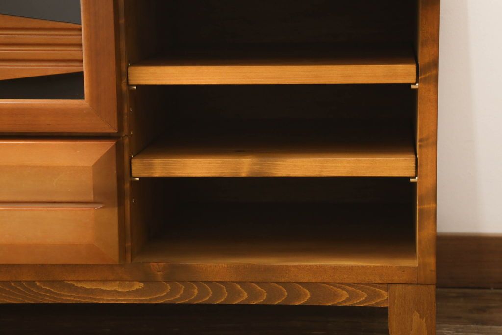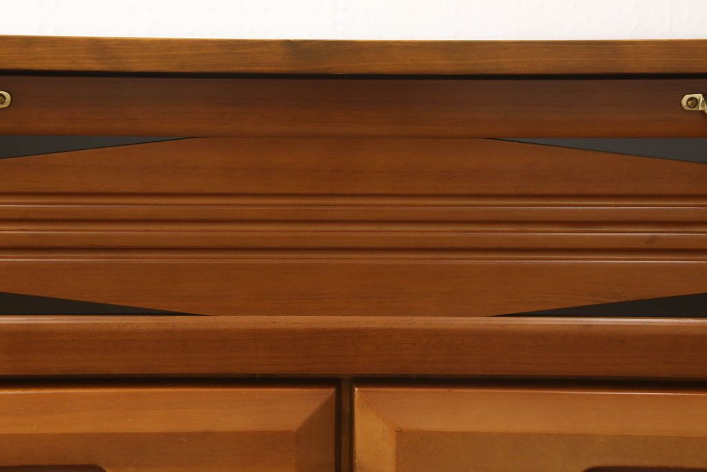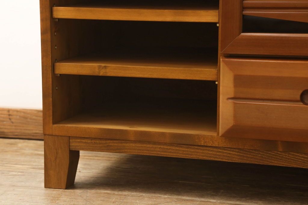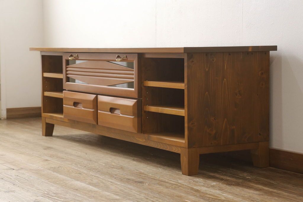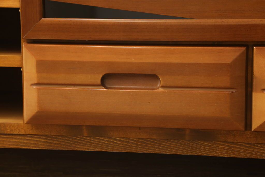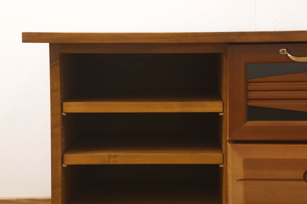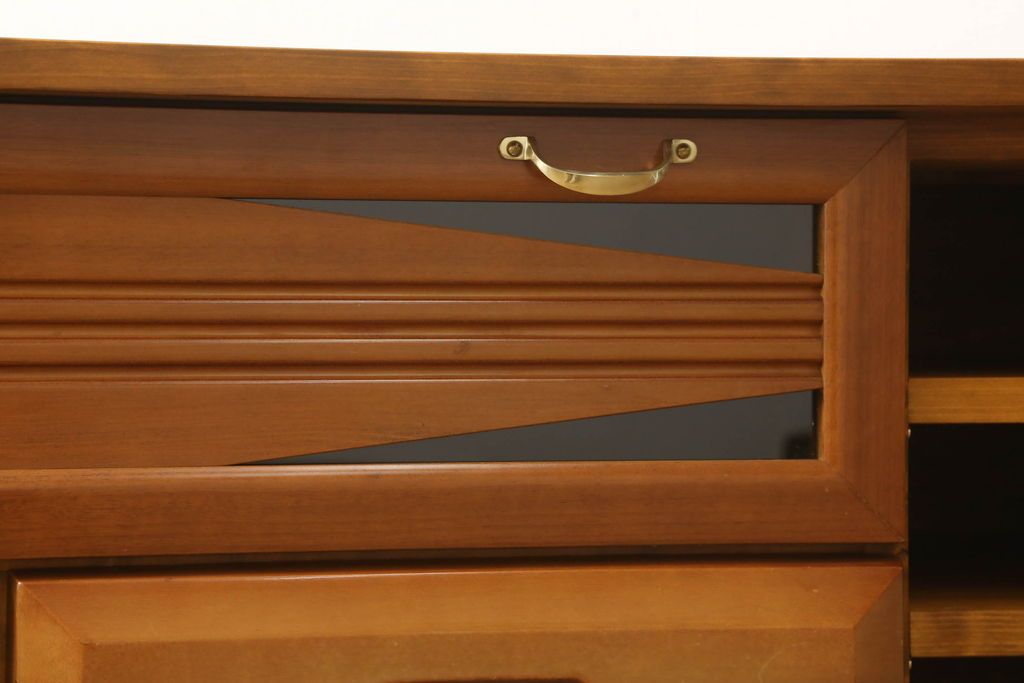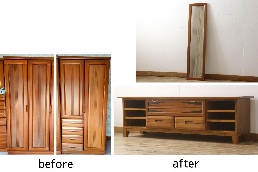 お手持ちの家具・建具リメイク実績> 婚礼家具リメイク実績 > ワードローブをテレビボードとウォールミラーにリメイク!テレビボードのダウン扉に既存の扉とガラスを利用。引き出し2杯を取り付け、両側収納には可動棚を設置。天板と脚を取り付けてテレビボードに。もう一つの扉は内部のミラーをそのまま取り付けてウォールミラーに。