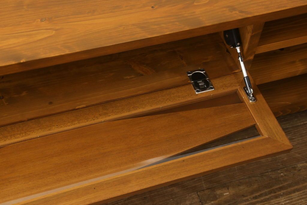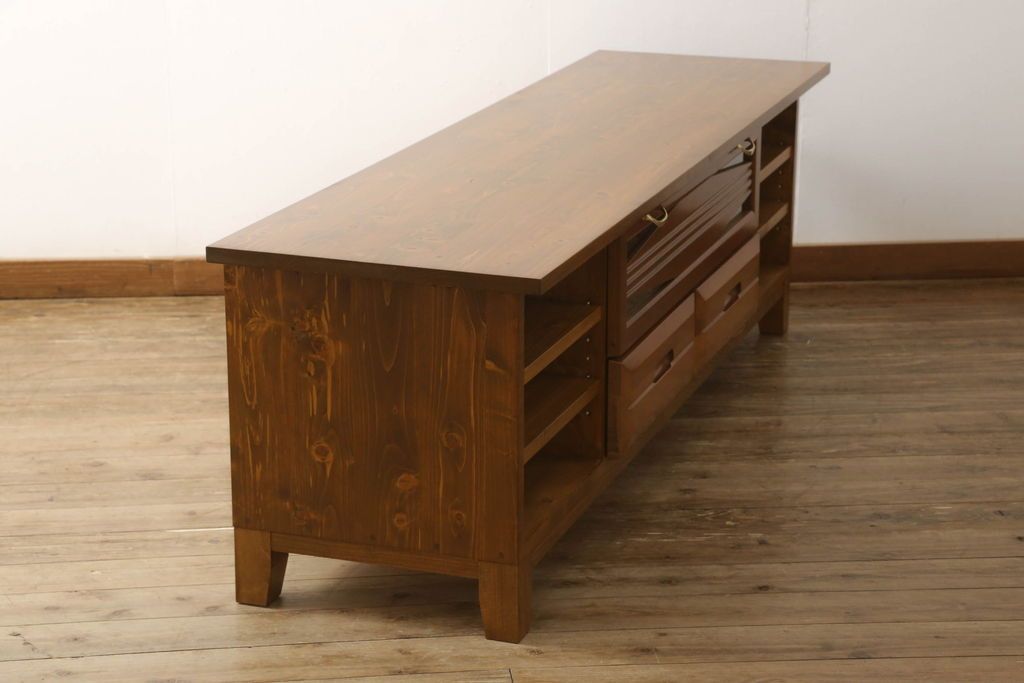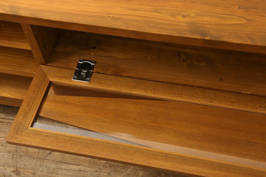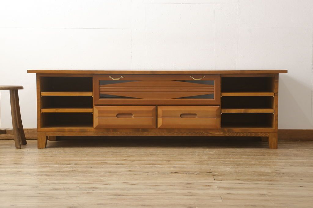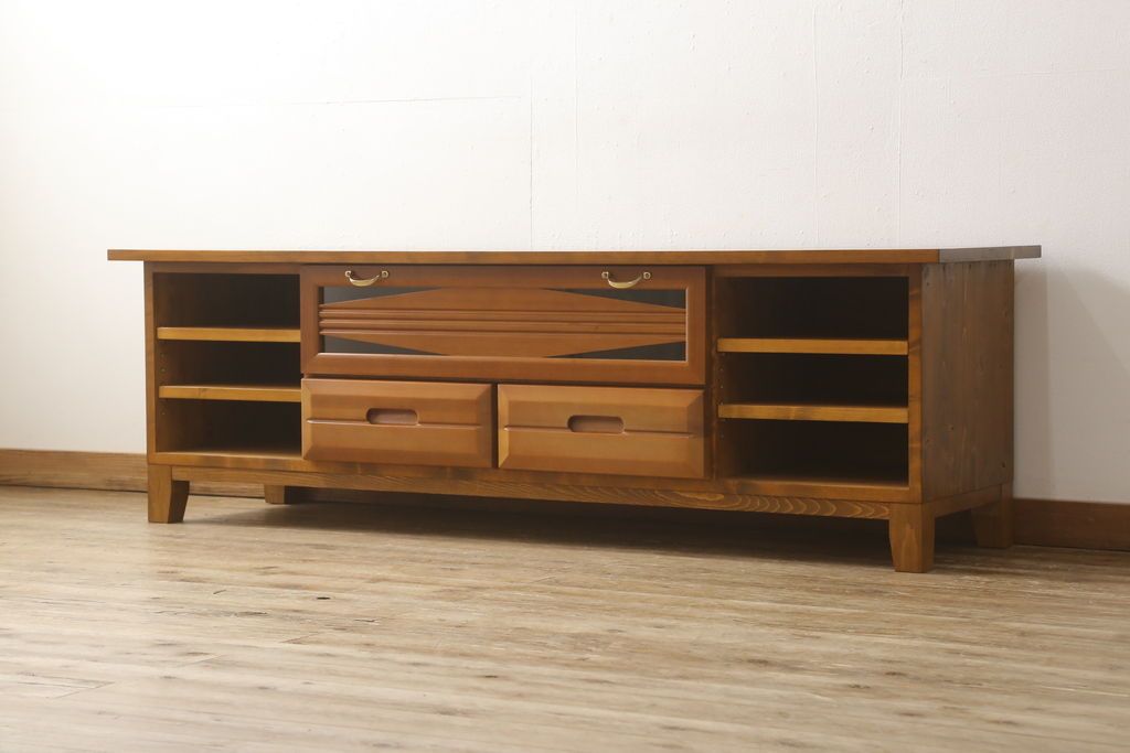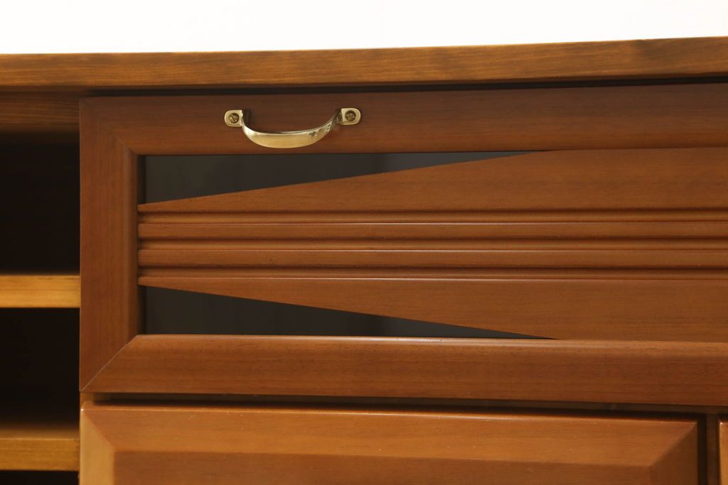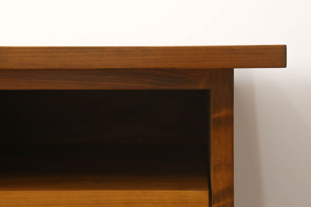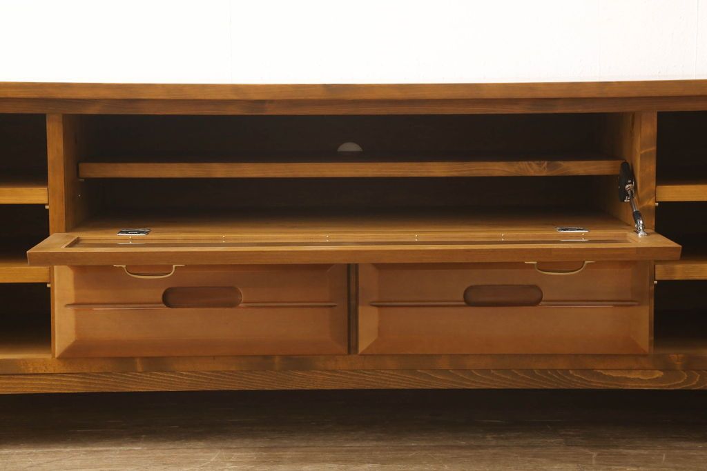 お手持ちの家具・建具リメイク実績> 婚礼家具リメイク実績 > ワードローブをテレビボードとウォールミラーにリメイク!テレビボードのダウン扉に既存の扉とガラスを利用。引き出し2杯を取り付け、両側収納には可動棚を設置。天板と脚を取り付けてテレビボードに。もう一つの扉は内部のミラーをそのまま取り付けてウォールミラーに。