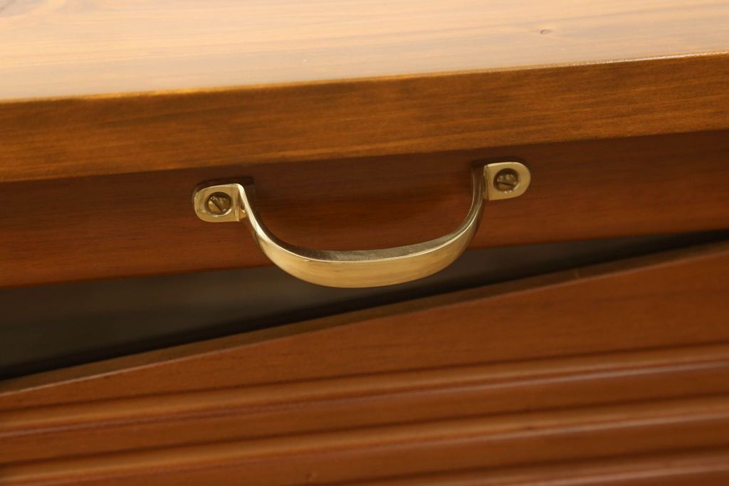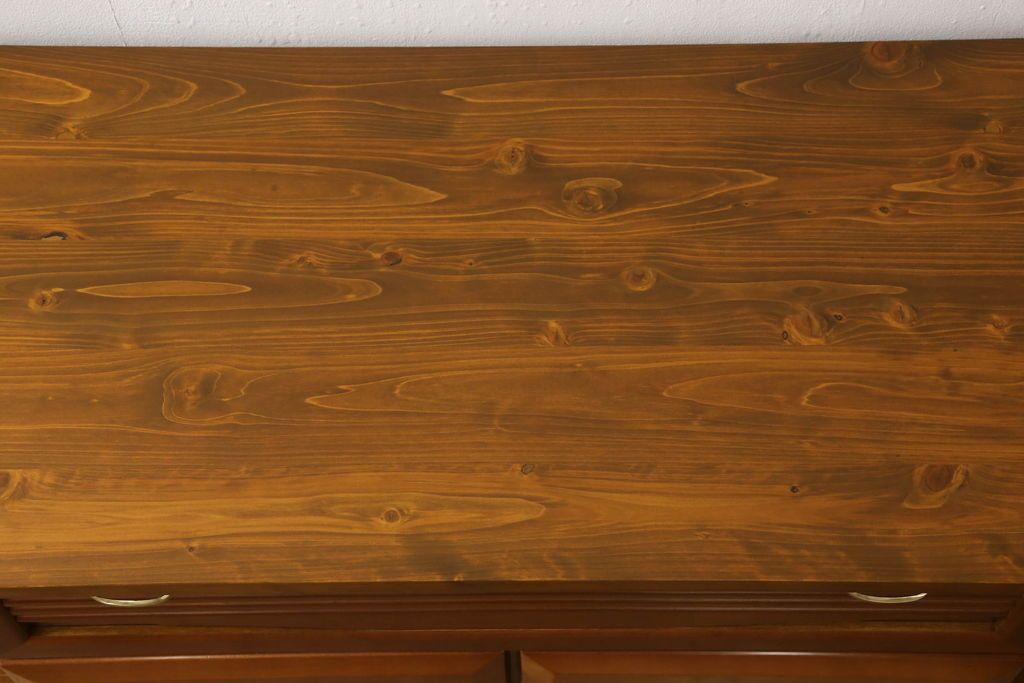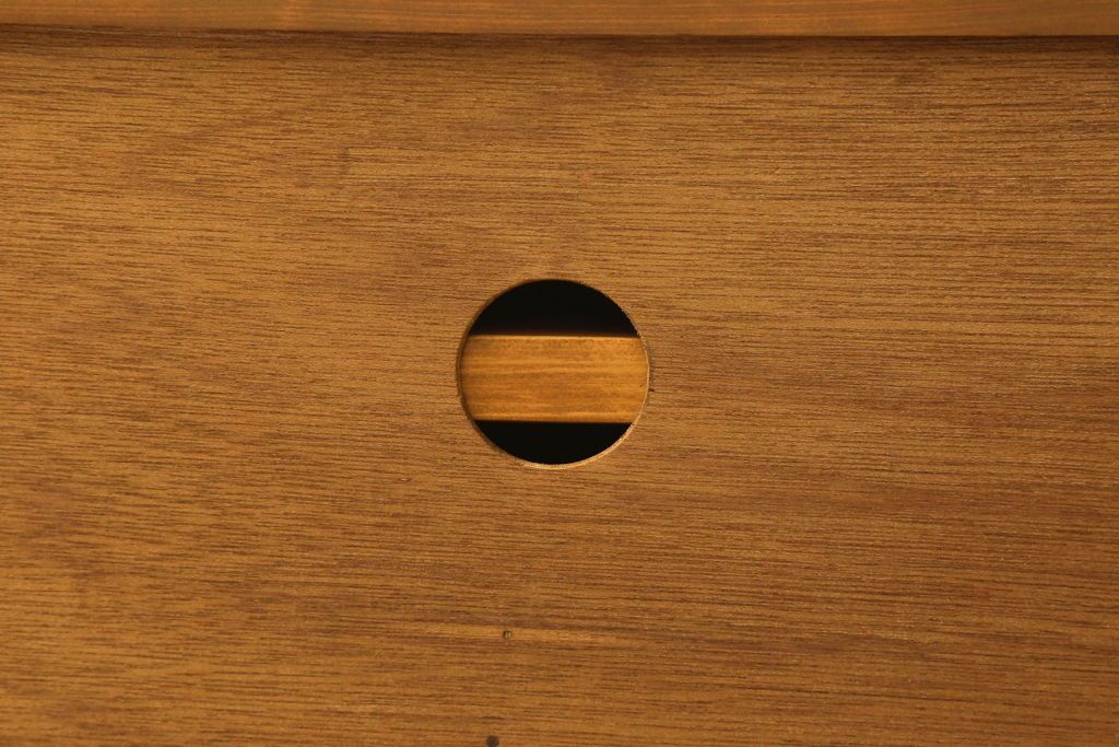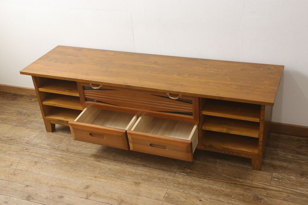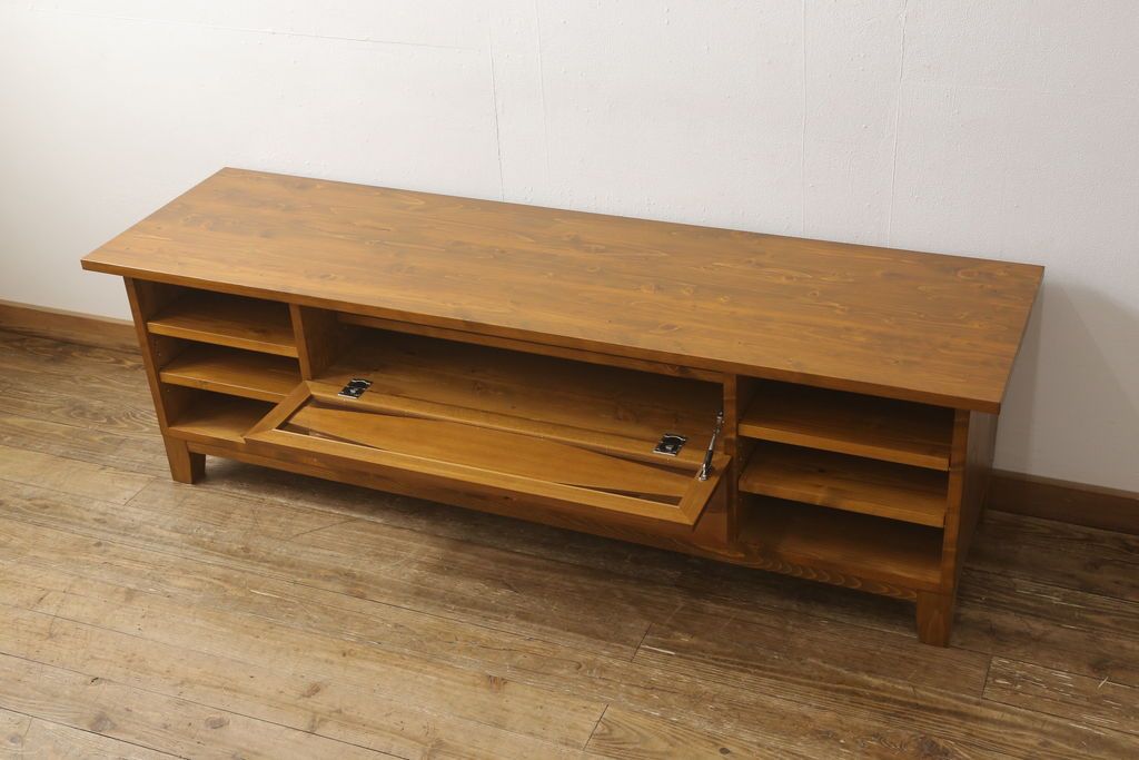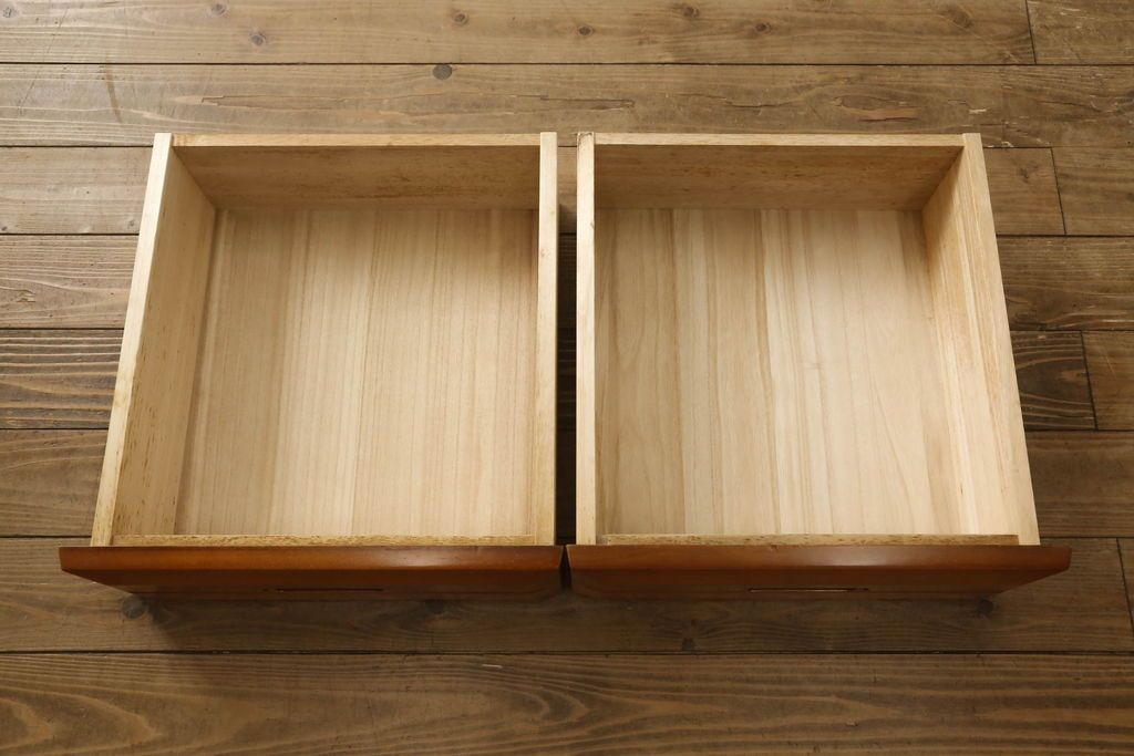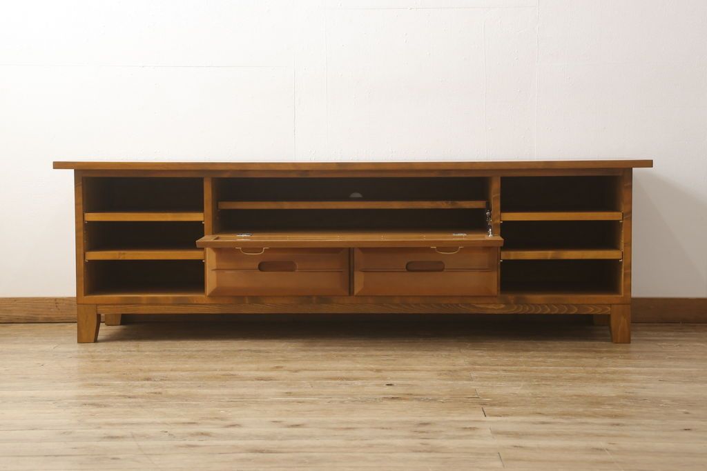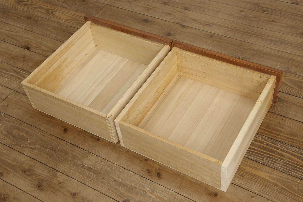 お手持ちの家具・建具リメイク実績> 婚礼家具リメイク実績 > ワードローブをテレビボードとウォールミラーにリメイク!テレビボードのダウン扉に既存の扉とガラスを利用。引き出し2杯を取り付け、両側収納には可動棚を設置。天板と脚を取り付けてテレビボードに。もう一つの扉は内部のミラーをそのまま取り付けてウォールミラーに。