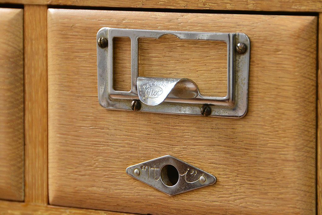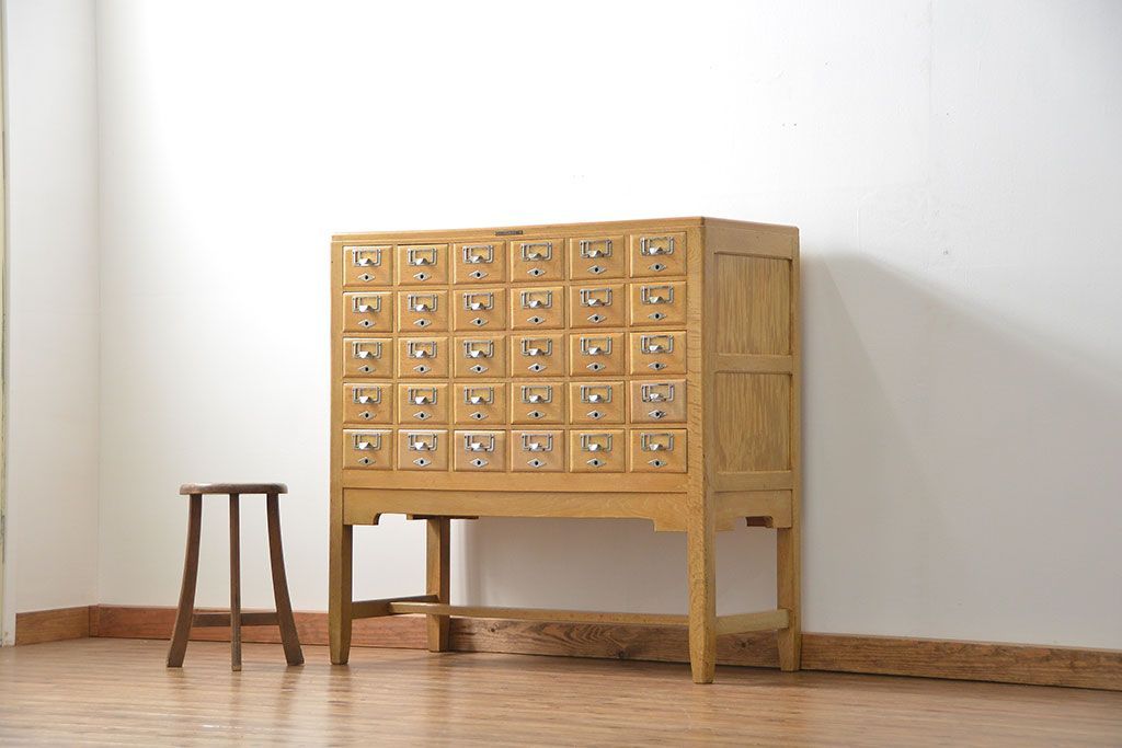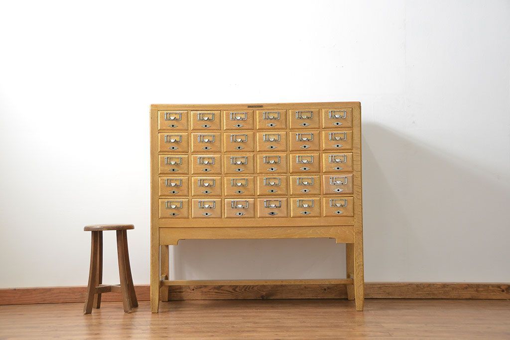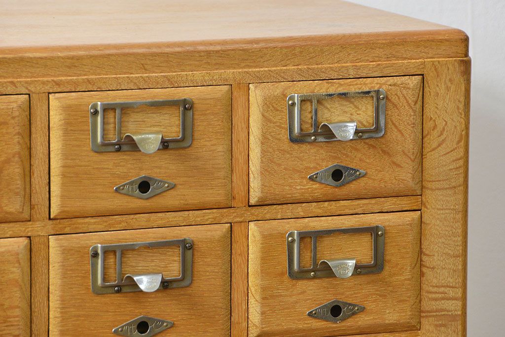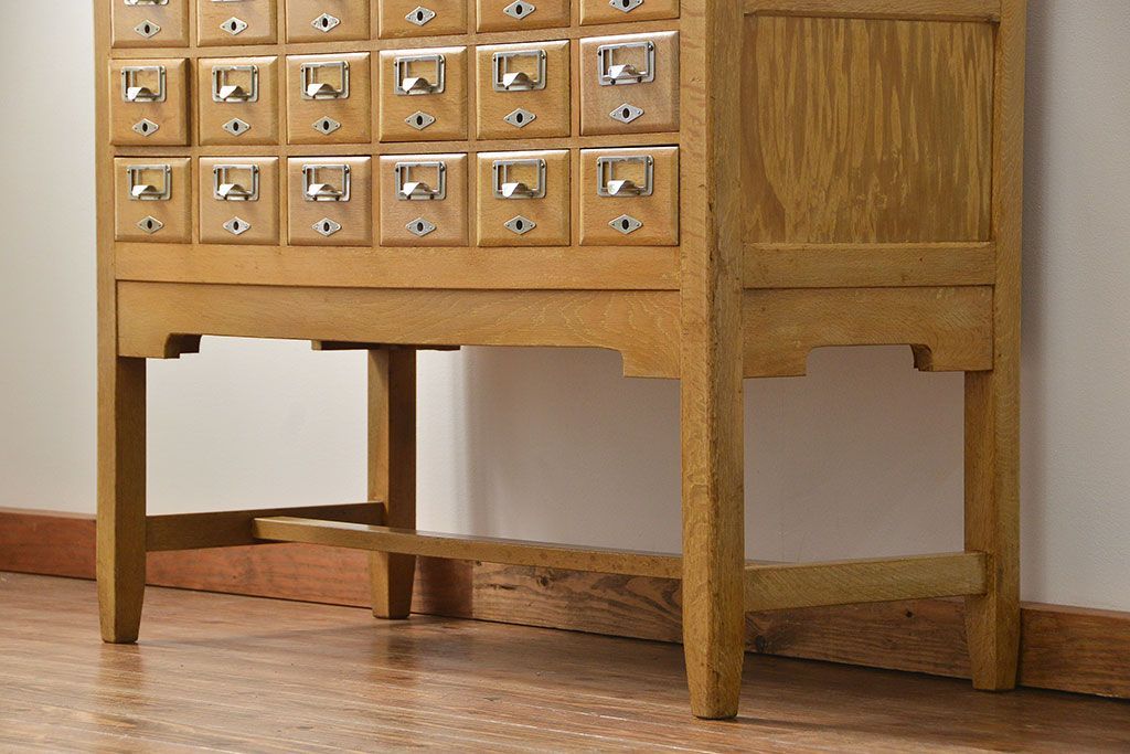 レトロ家具 昭和レトロ 重厚でかわいい脚付きナラ材カードケース(小引き出し、チェスト、ドロワー、図書館、図書室)