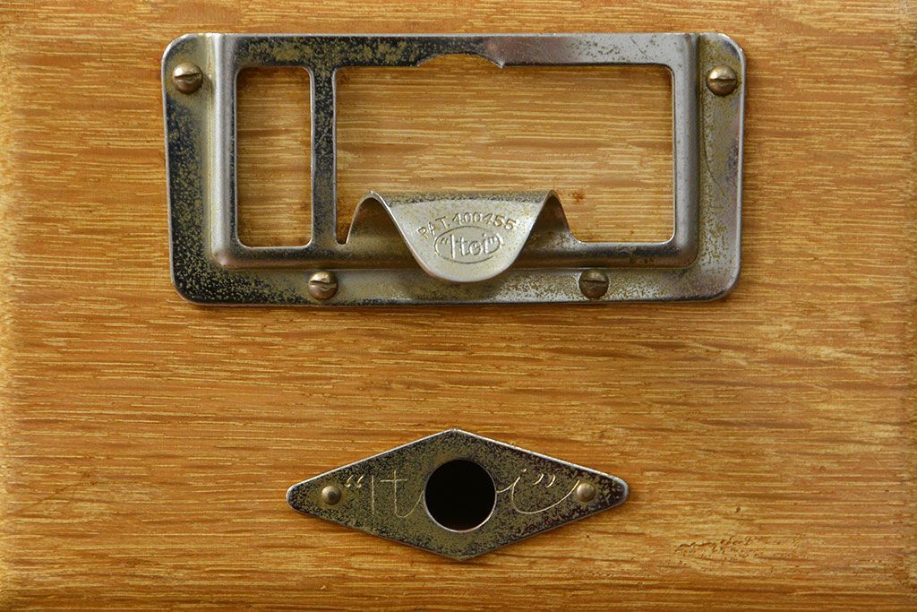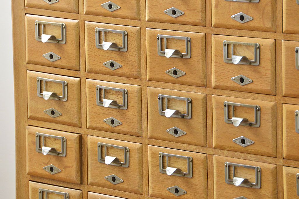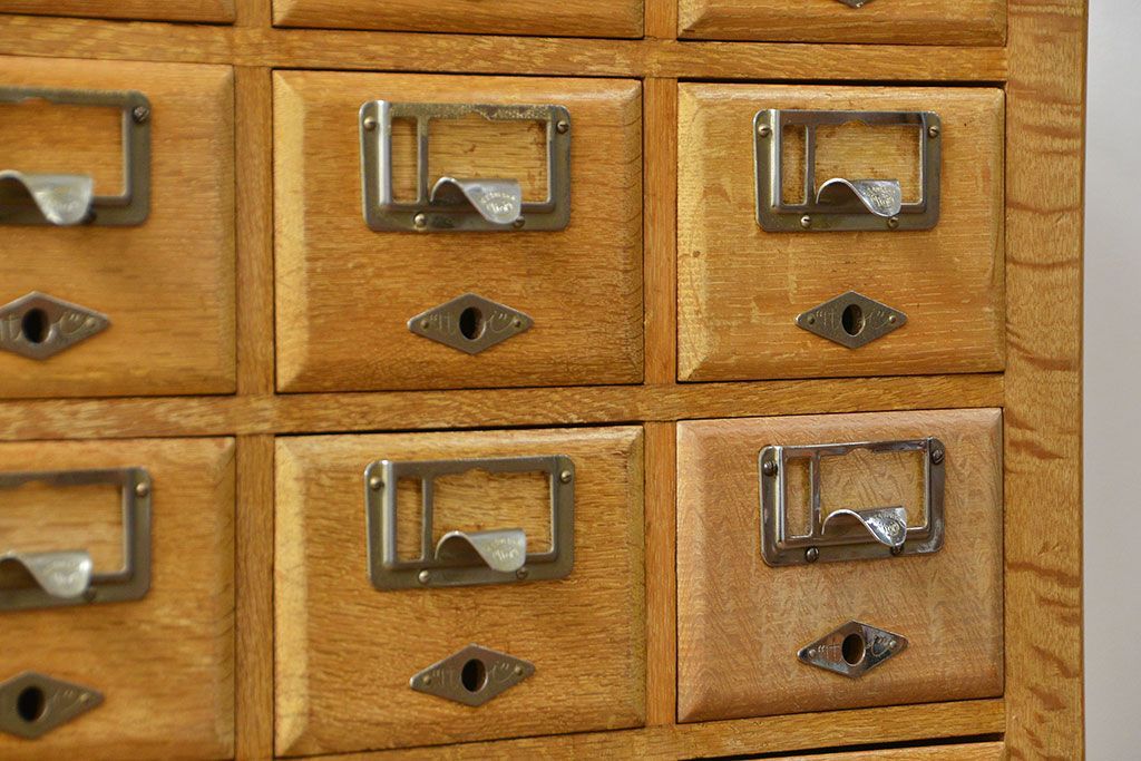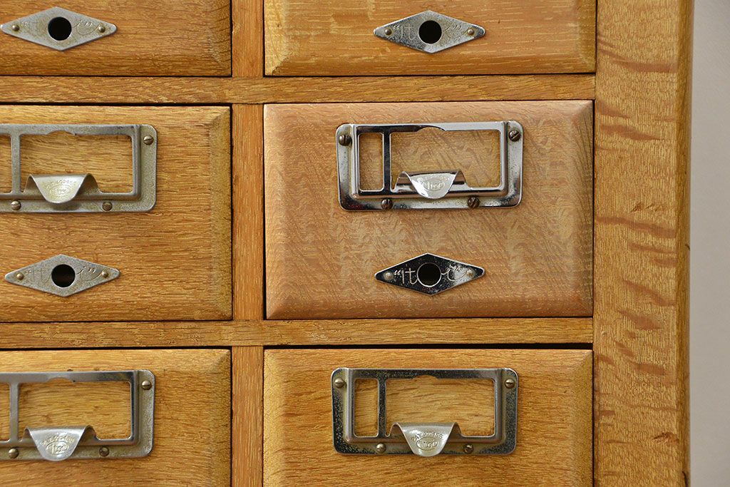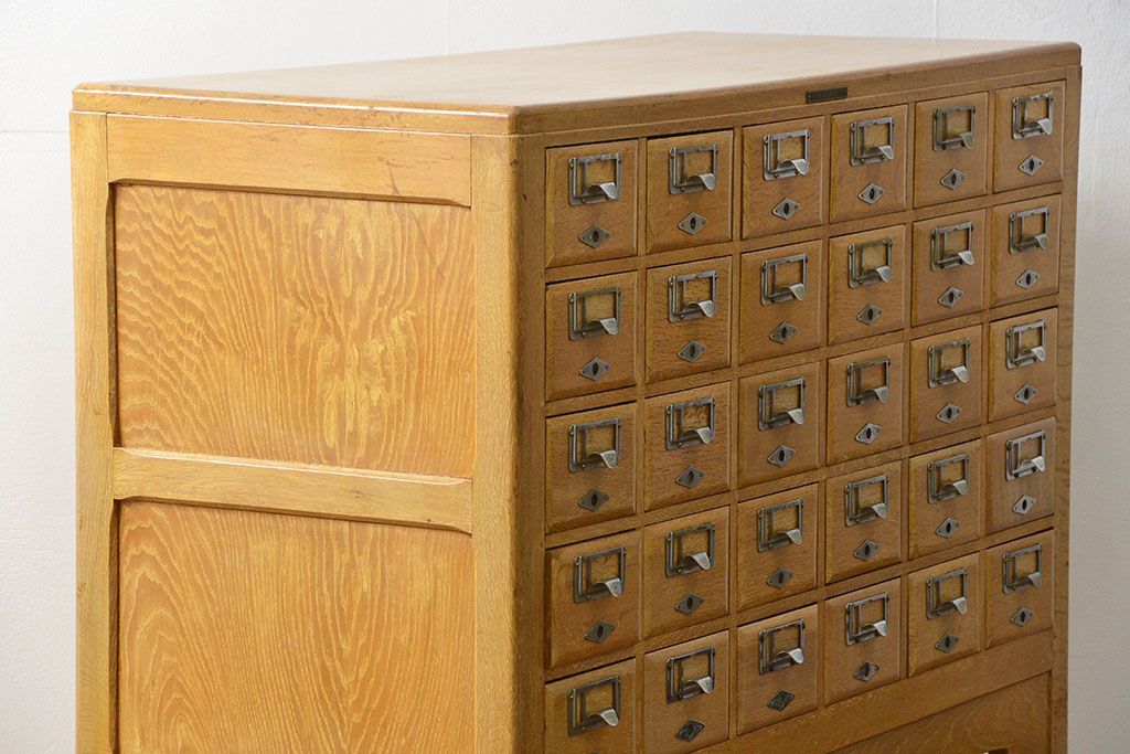 レトロ家具 昭和レトロ 重厚でかわいい脚付きナラ材カードケース(小引き出し、チェスト、ドロワー、図書館、図書室)