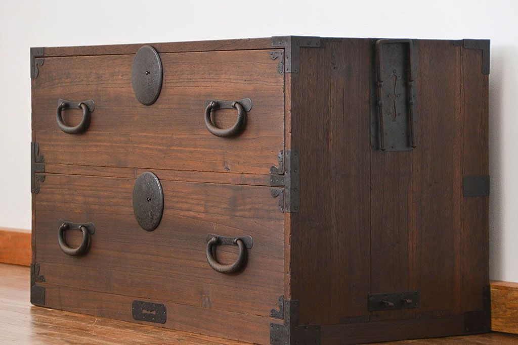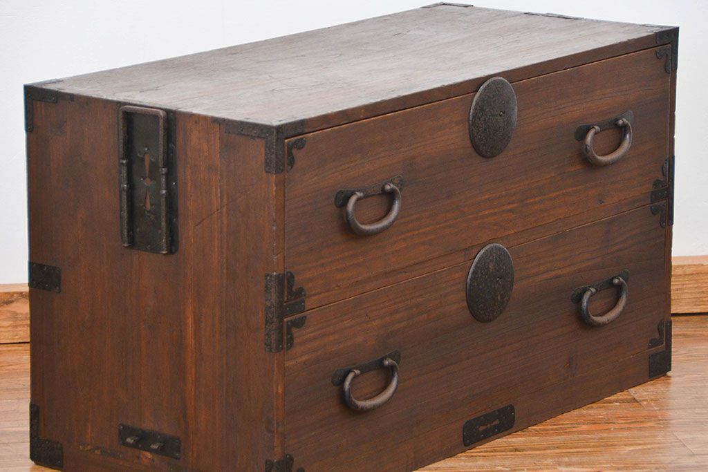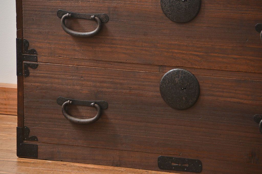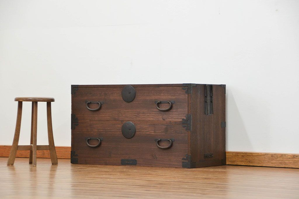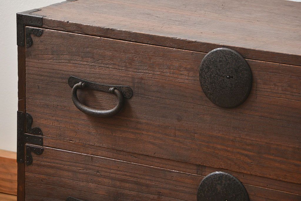和箪笥> 衣装箪笥 > アンティーク家具 古民具・骨董 丸金具のシンプルな時代箪笥ローボード(ローチェスト)