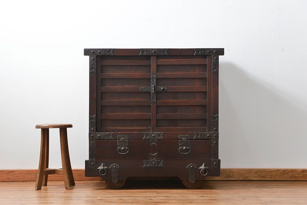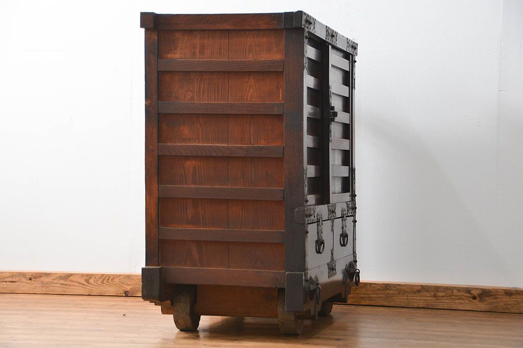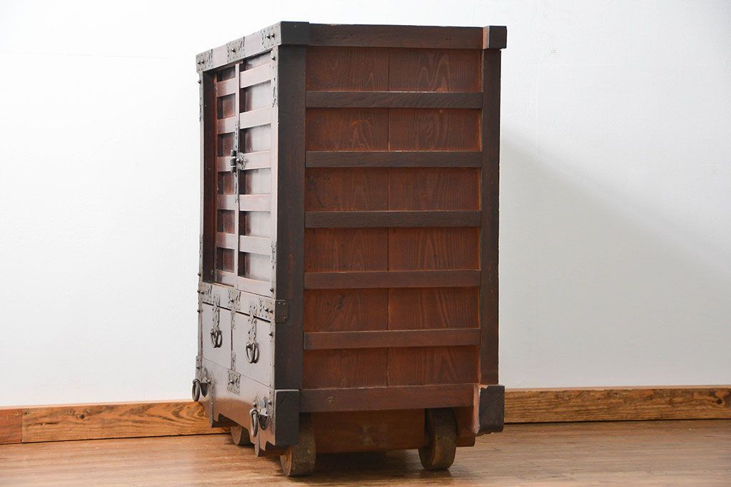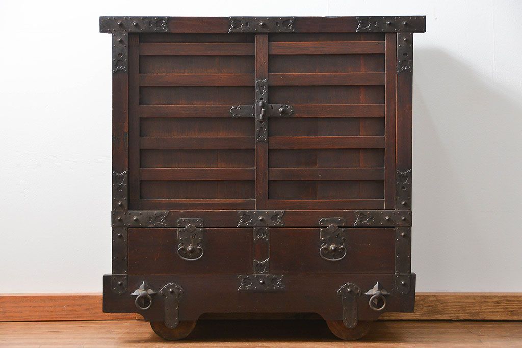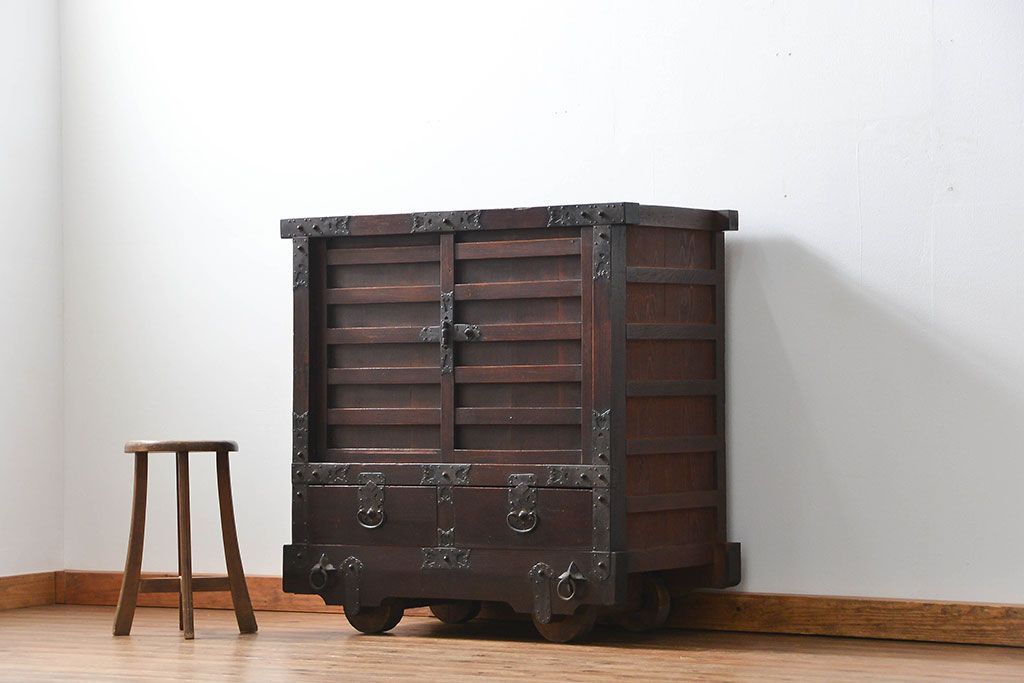 和箪笥> 船箪笥 > アンティーク家具 古民具・骨董 江戸〜明治期 前面栗材 米沢車箪笥(船箪笥、帳場箪笥)