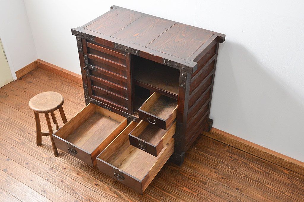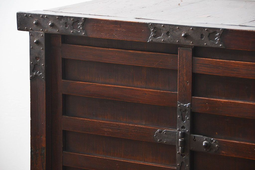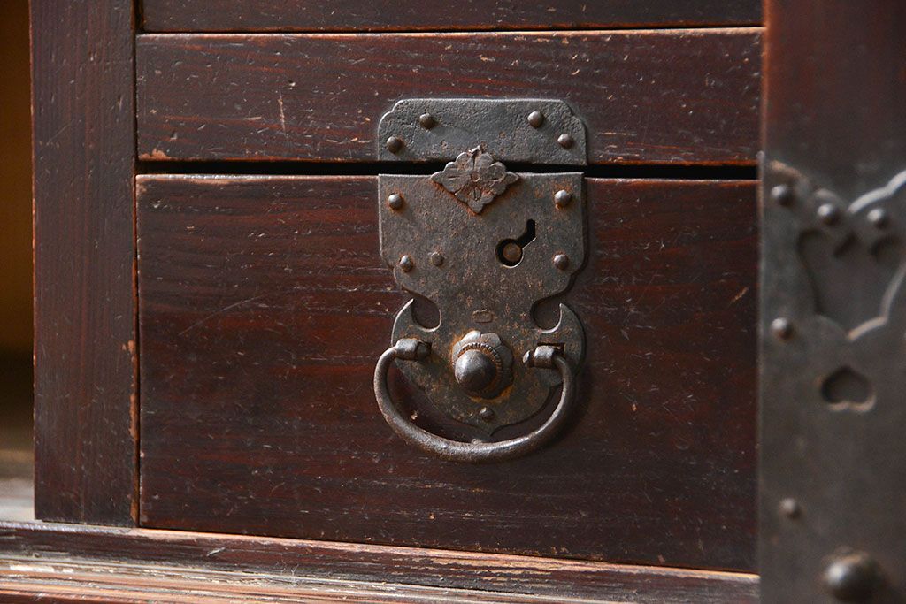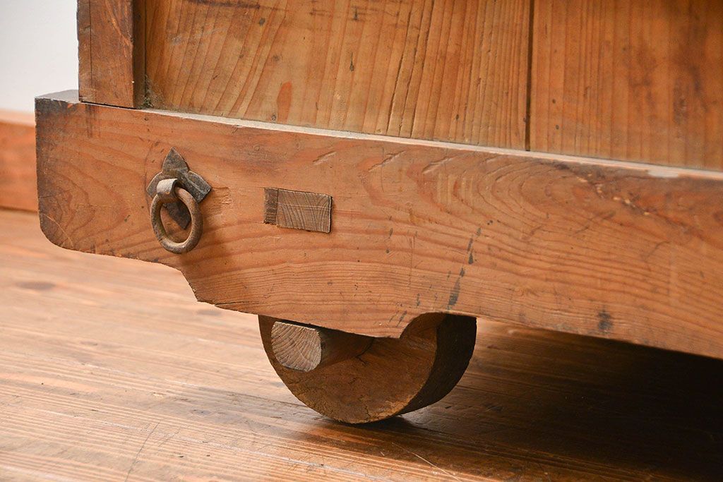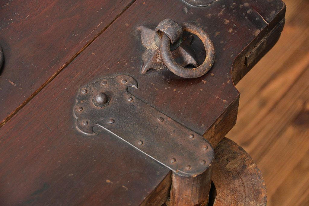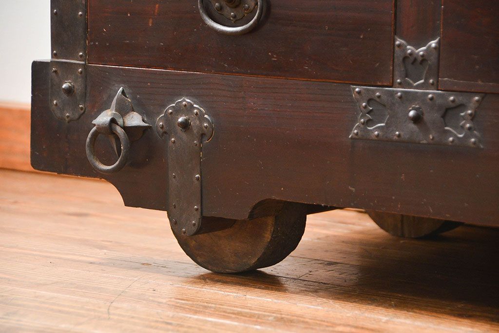 和箪笥> 帳場箪笥 > アンティーク家具 古民具・骨董 江戸〜明治期 前面栗材 米沢車箪笥(船箪笥、帳場箪笥)