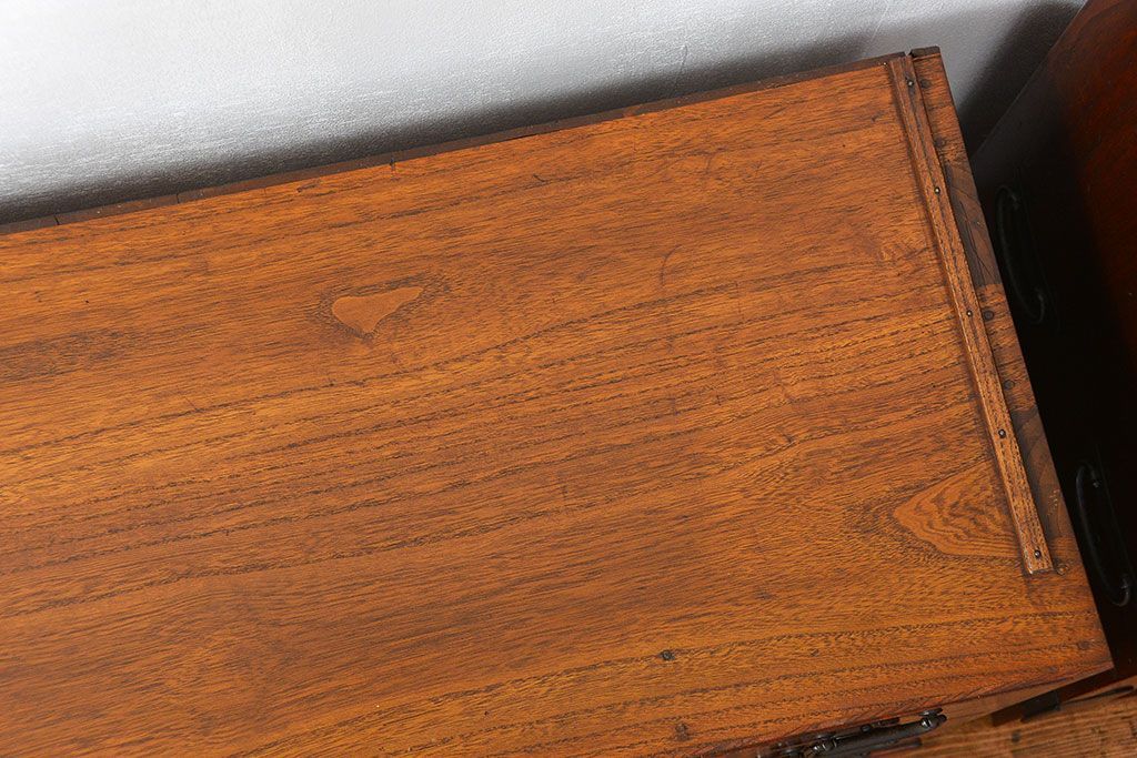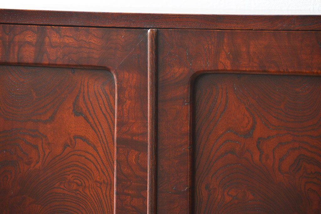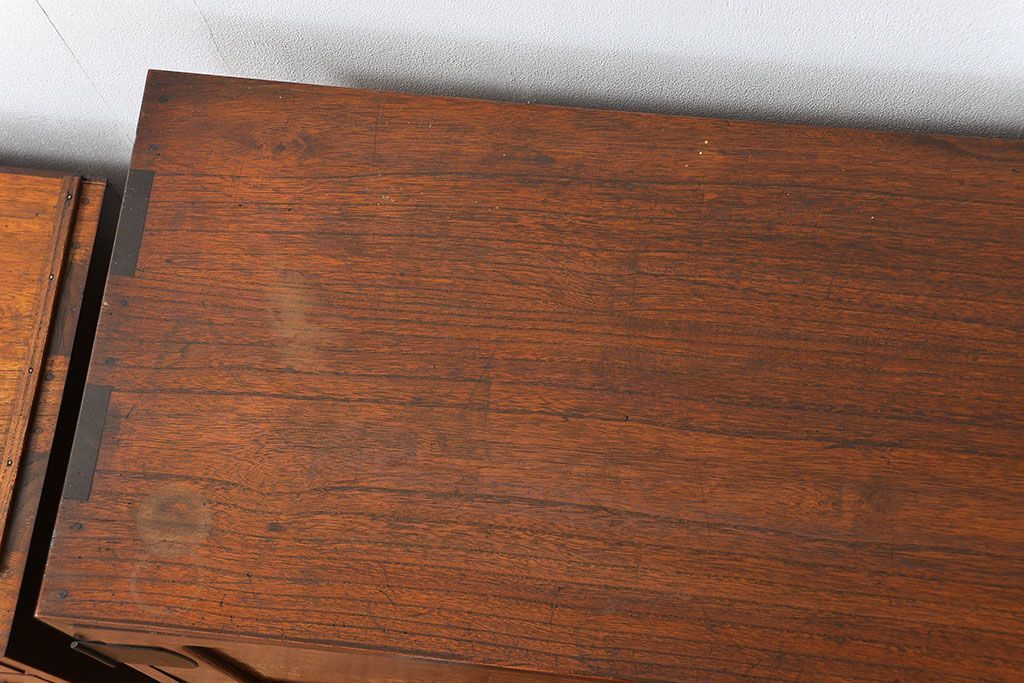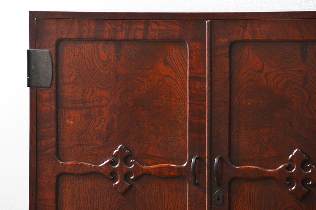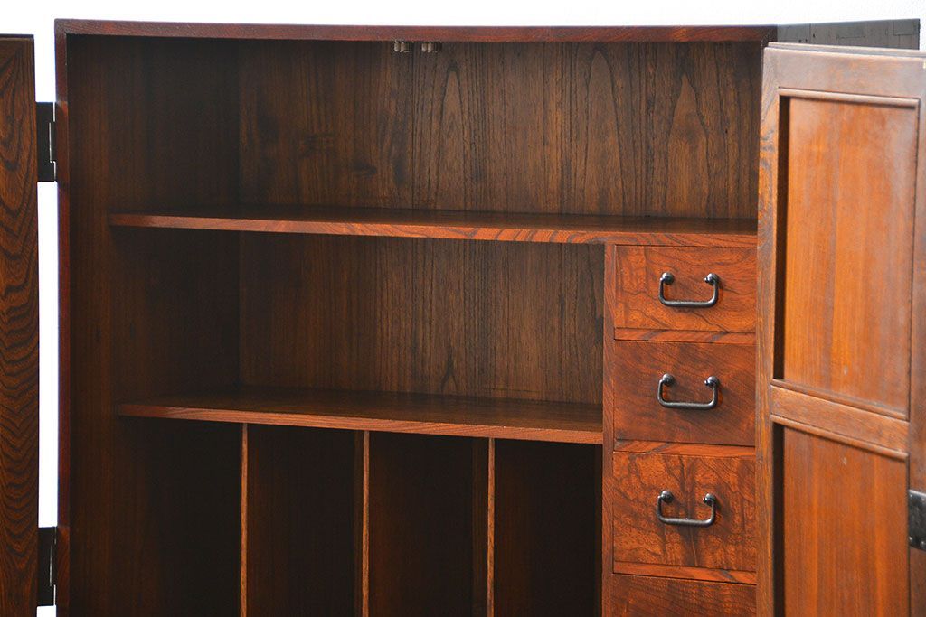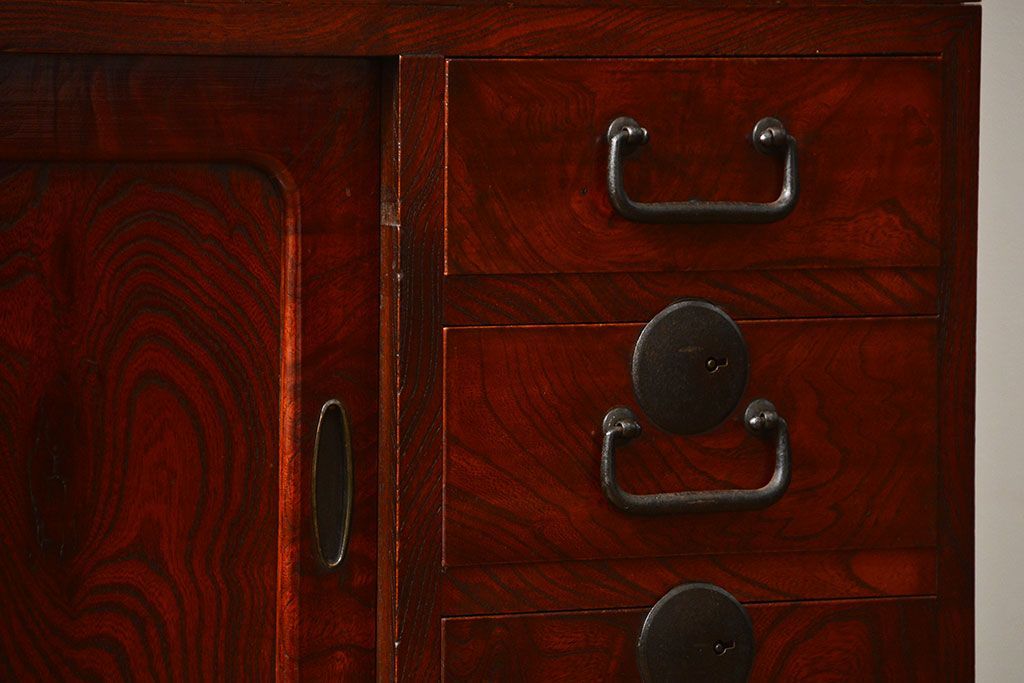 - 踏まえて見てみると、この箪笥も当時の高級品だったことが伺えますよね。前面は欅材でできており、はっきりとした独特の杢目が美しく、印象的な存在感を放ちます。ボリュームのある意匠も目を引き、高級感を感じます。また、その他は調湿性に優れた桐材が使用されております。紙や衣服などを湿気から守り、見た目にも、機能性にも配慮が行き届いた一品です。