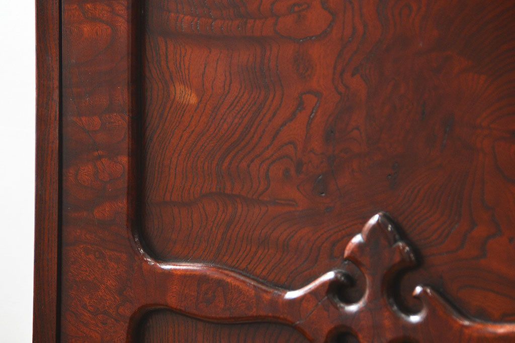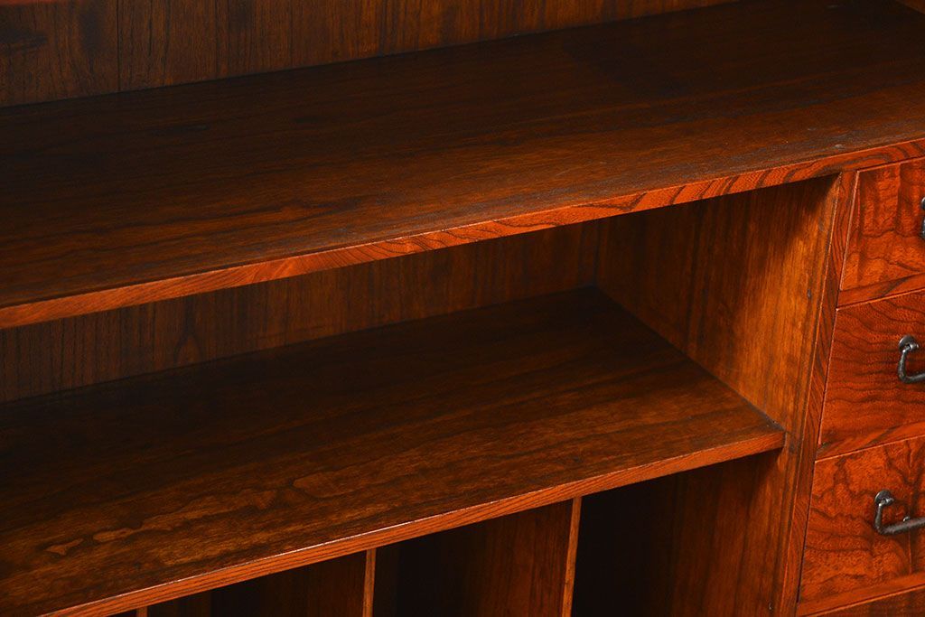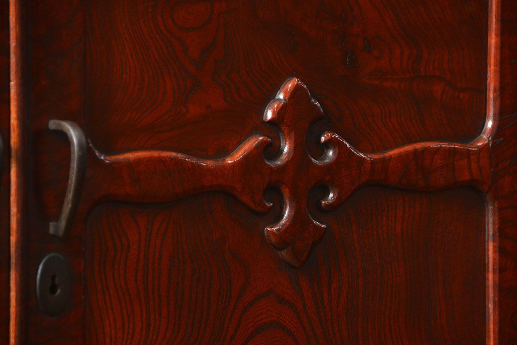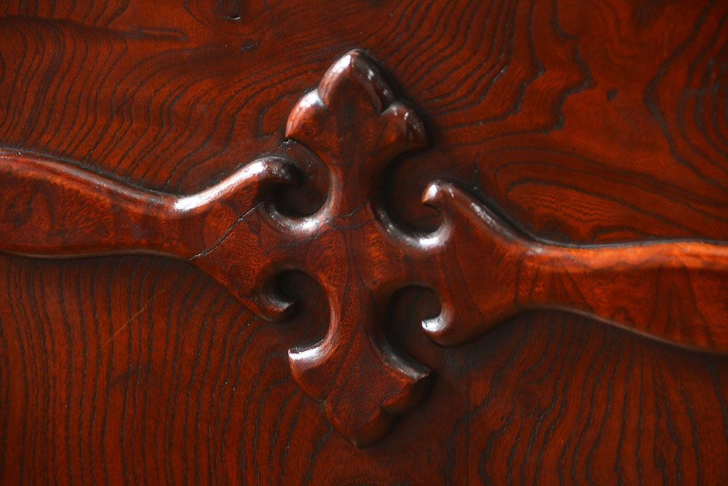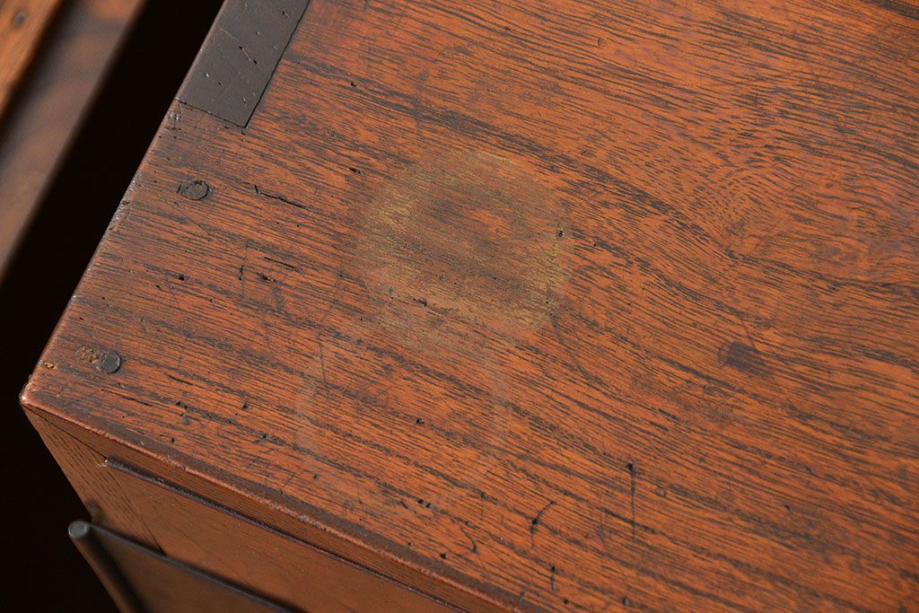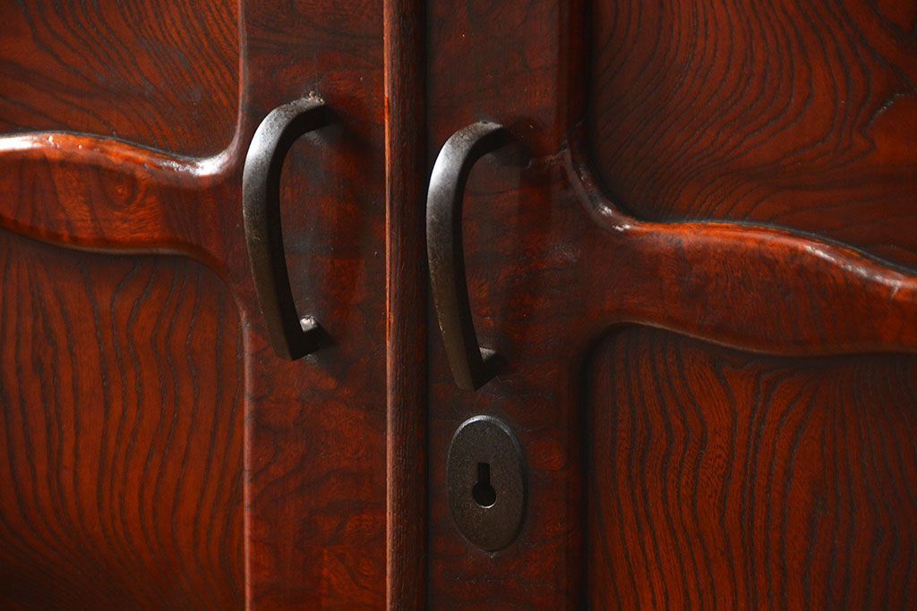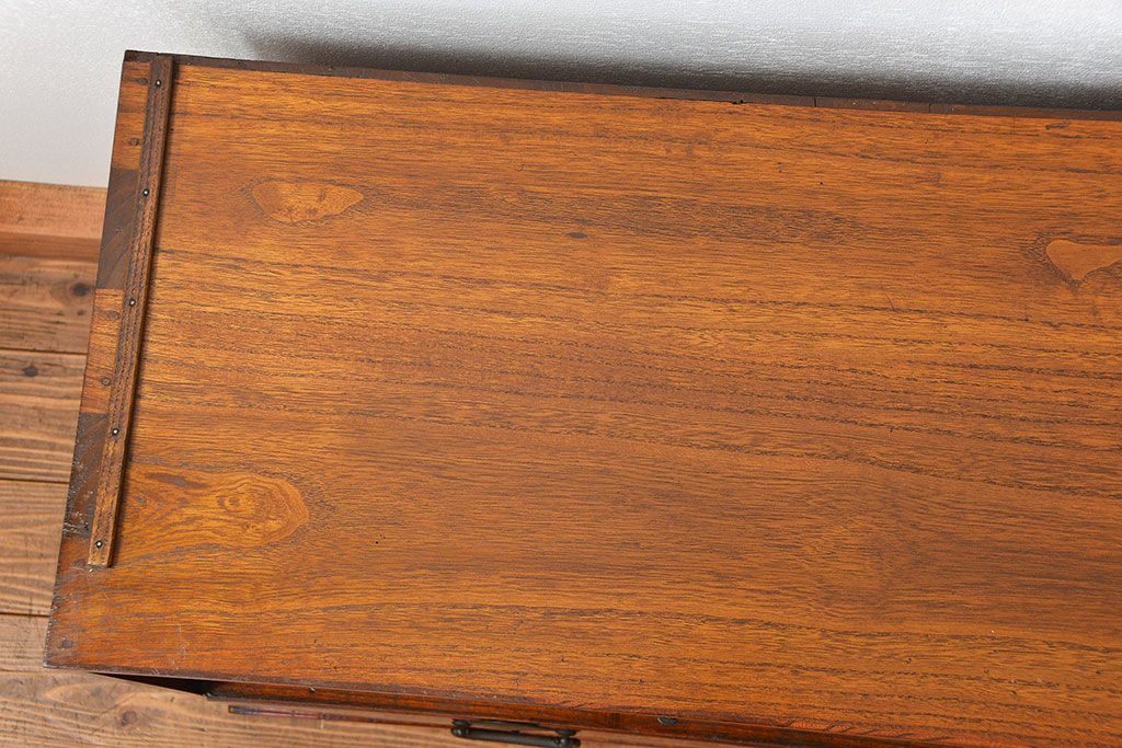 - 踏まえて見てみると、この箪笥も当時の高級品だったことが伺えますよね。前面は欅材でできており、はっきりとした独特の杢目が美しく、印象的な存在感を放ちます。ボリュームのある意匠も目を引き、高級感を感じます。また、その他は調湿性に優れた桐材が使用されております。紙や衣服などを湿気から守り、見た目にも、機能性にも配慮が行き届いた一品です。