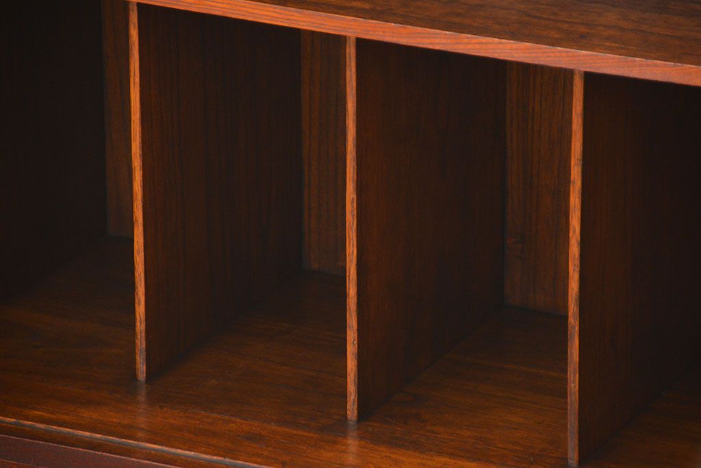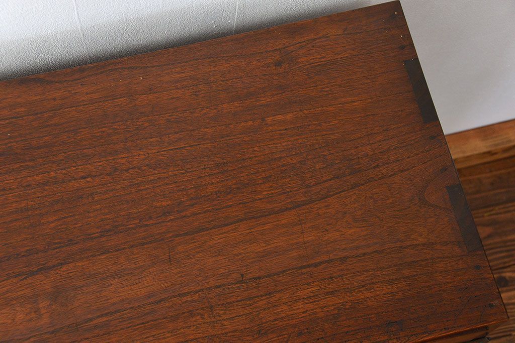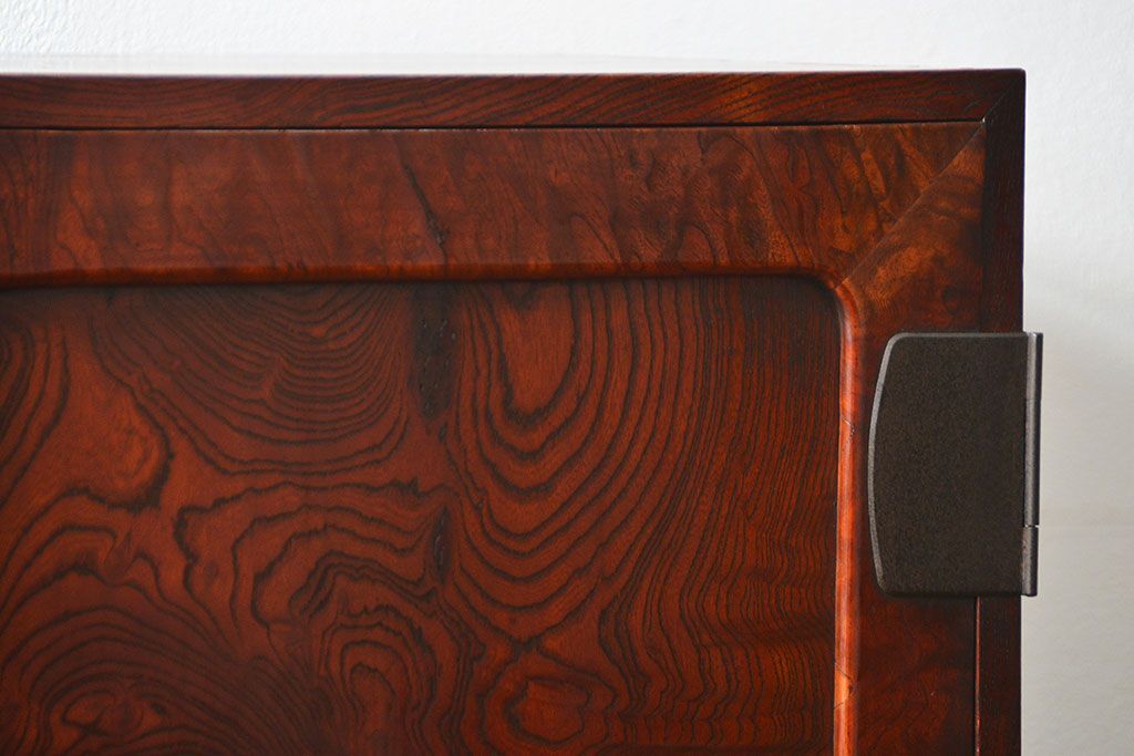 - 杢目と意匠が引き立つようなすっきりとしたデザイン。当時の漆塗りもきれいに残っており、艶やかな風合いがさらに魅力を増幅させます。控えめにつけられた金具も上品さを際立たせますよ。