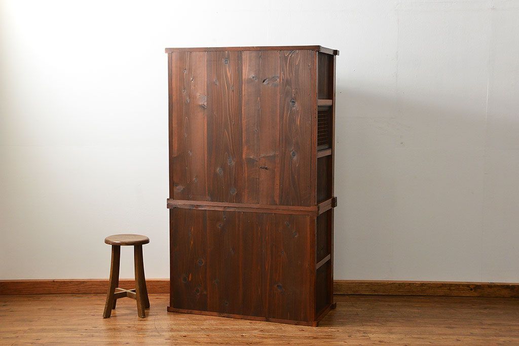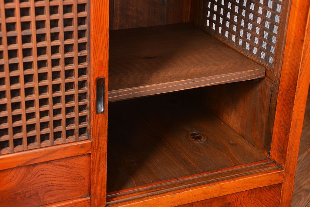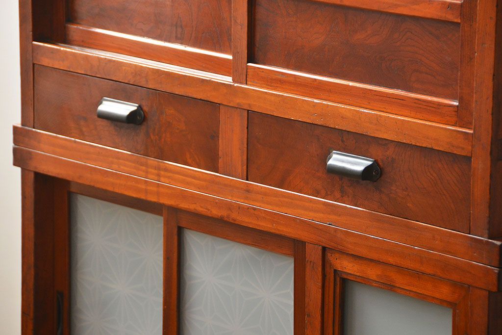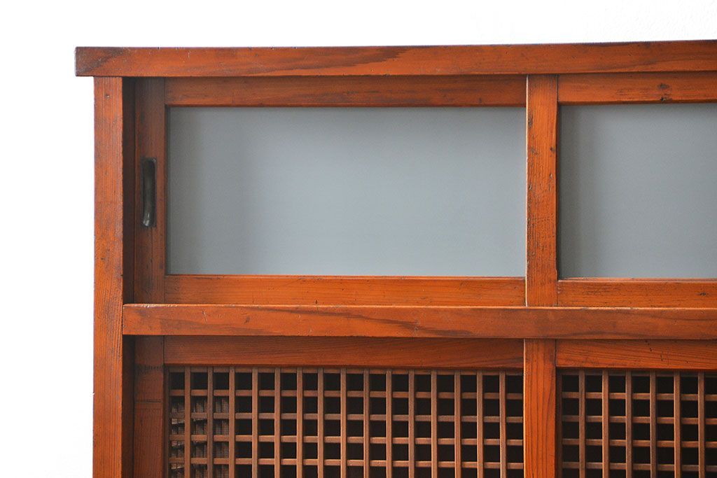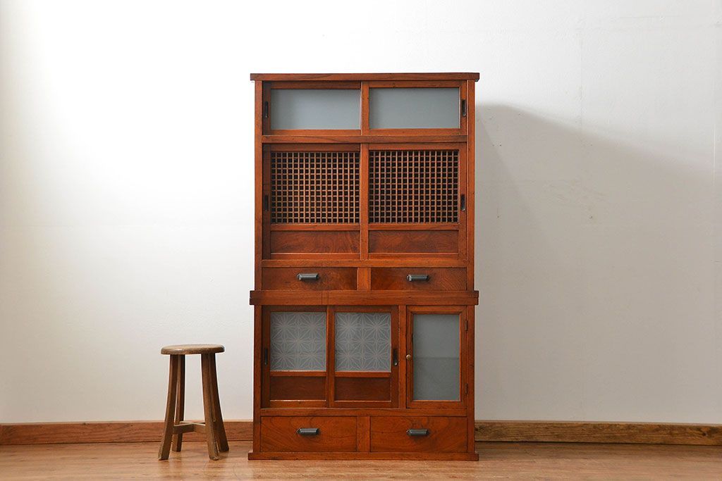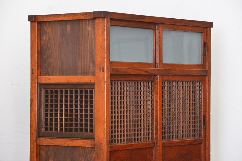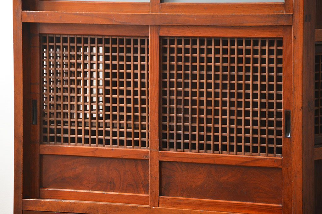 アンティーク家具 古民具・骨董 格子引き戸二段重ね茶箪笥(水屋箪笥、収納棚)