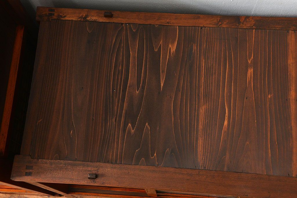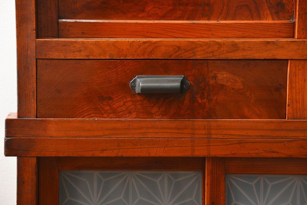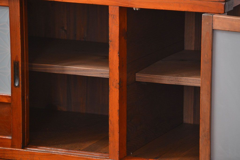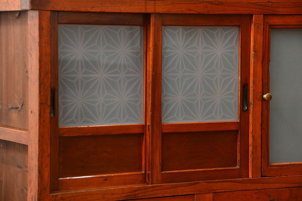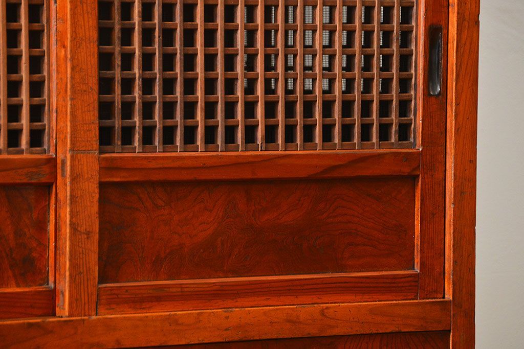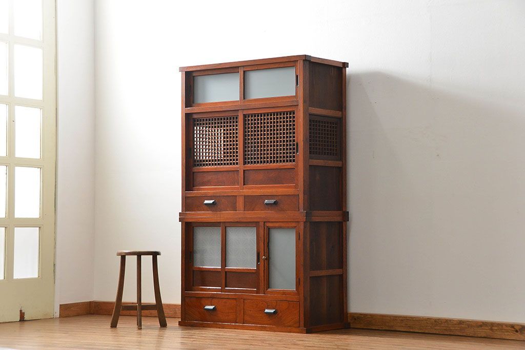 アンティーク家具 古民具・骨董 格子引き戸二段重ね茶箪笥(水屋箪笥、収納棚)