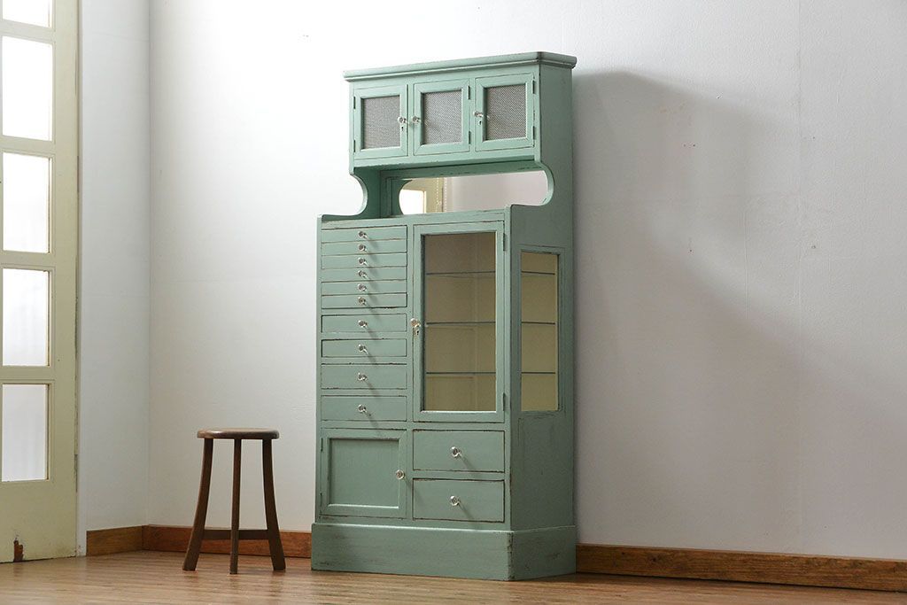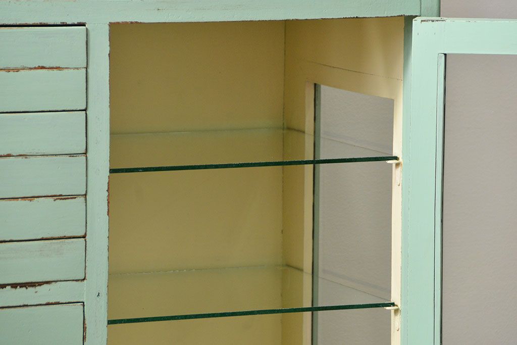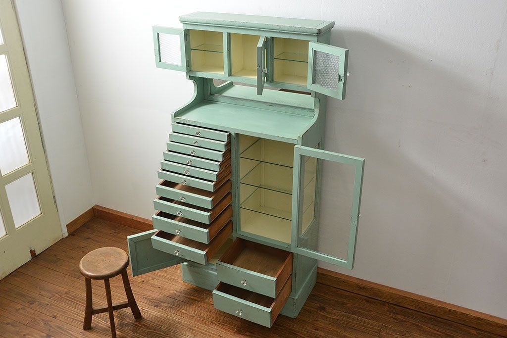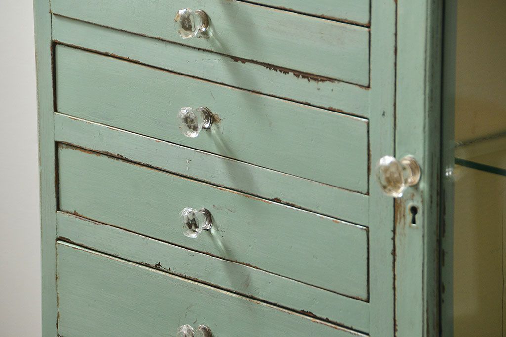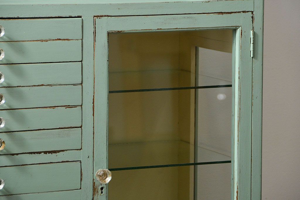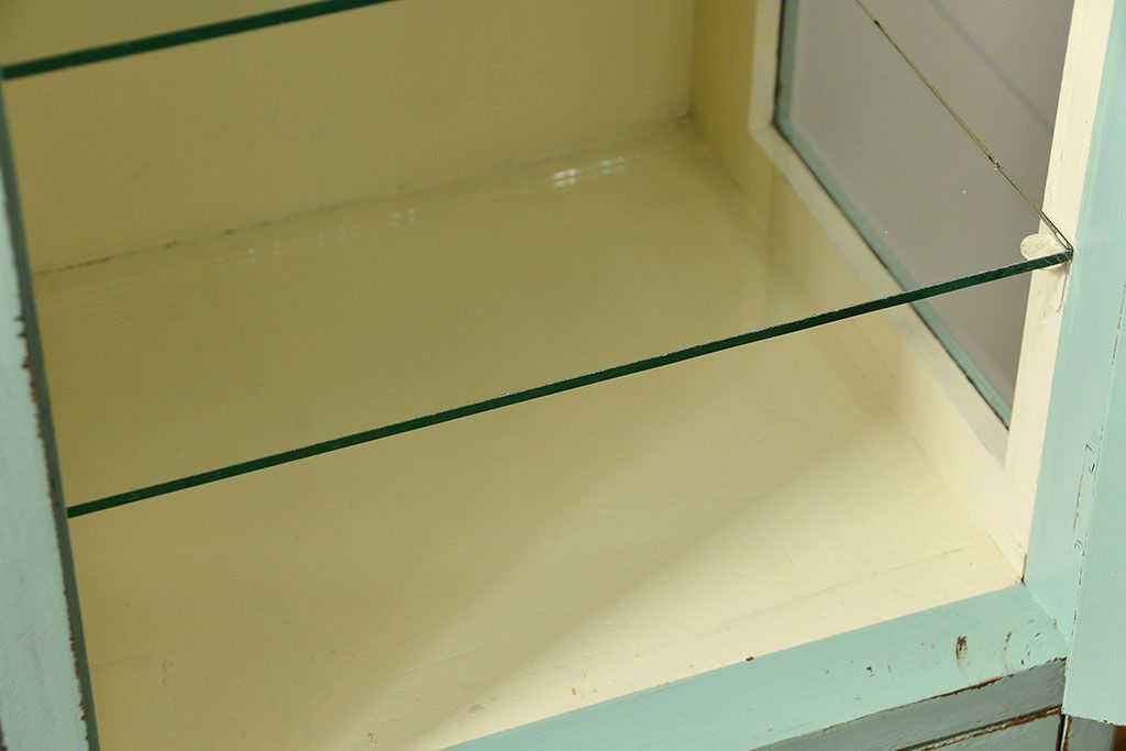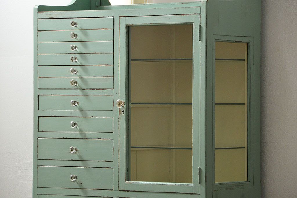 アンティークペイント ガラスの取っ手のデンタルキャビネット(デンタルケース、ケビント、ガラスケース)です。