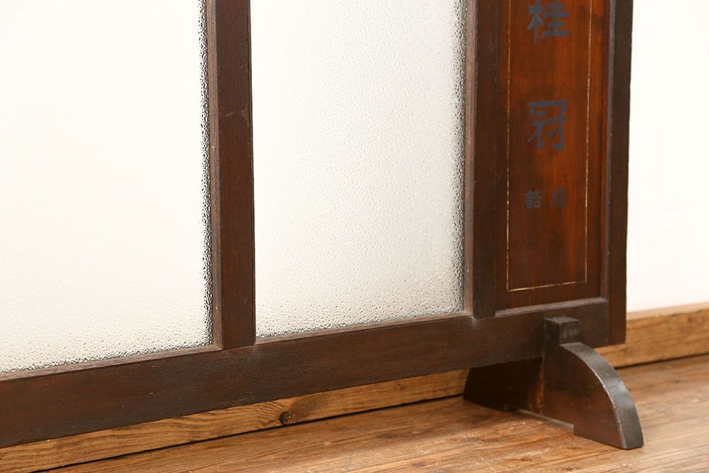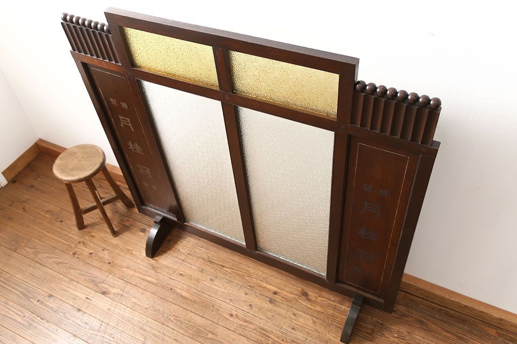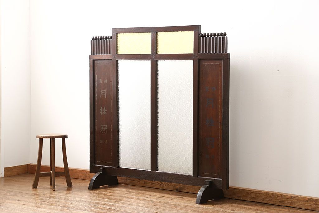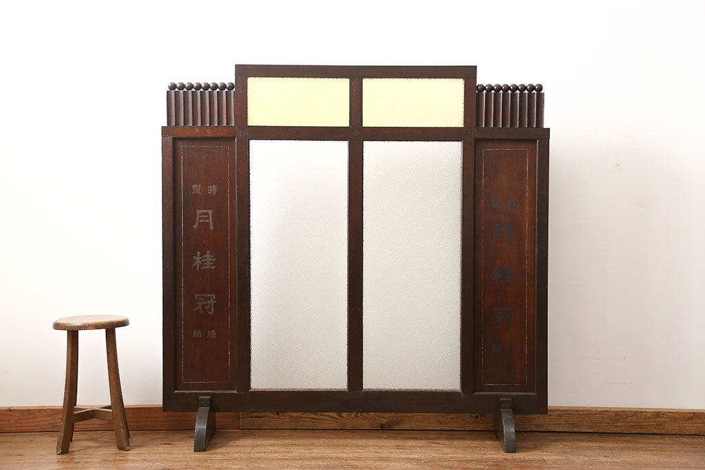 ラフジュ工房> 衝立・パーテーション > アンティーク雑貨 古い酒屋の色ガラス入りアンティーク衝立て(看板付き、ノベルティー、キリンビール)