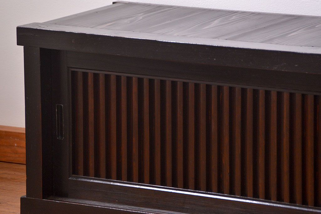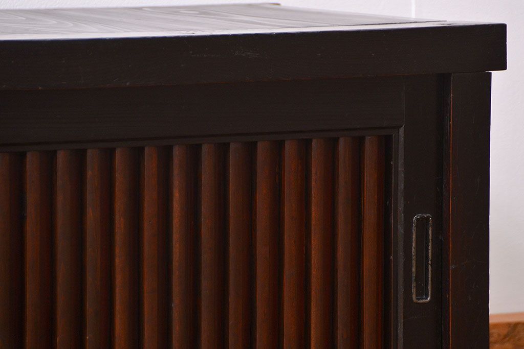 アンティーク シックな縦桟引き戸の収納箪笥ローボード (水屋箪笥、テレビボード、テレビ台、キャビネット、収納棚)です。