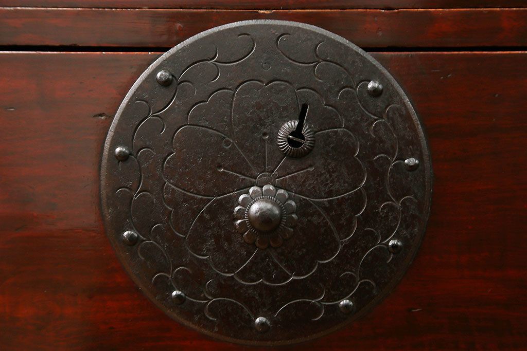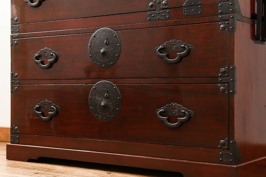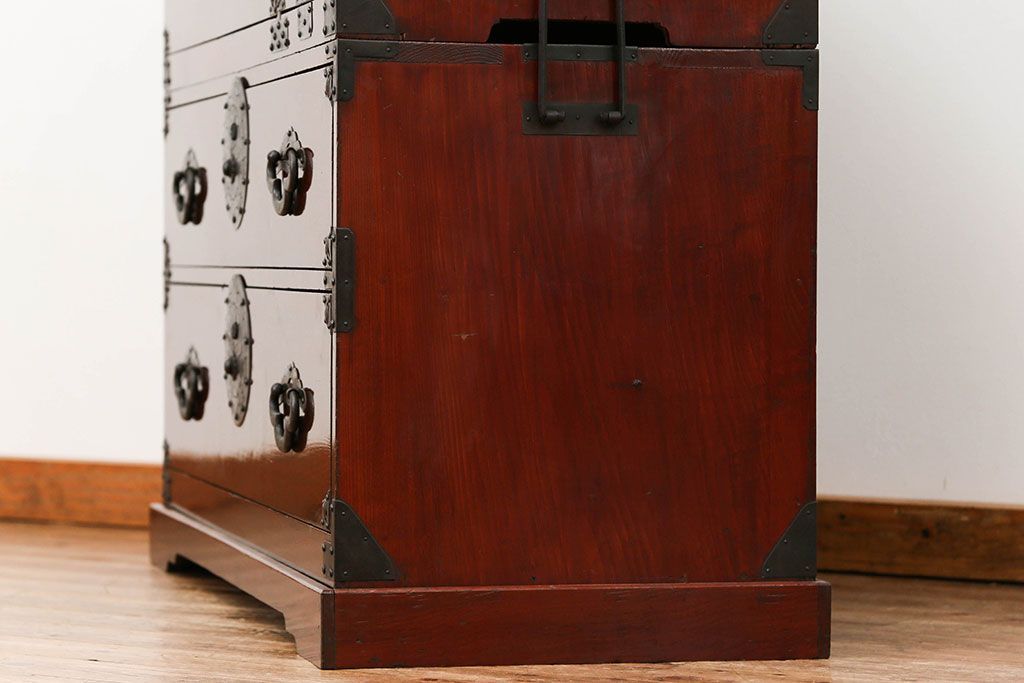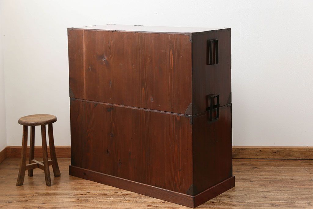 和箪笥> 衣装箪笥 > アンティーク家具 古民具・骨董 前面栗材の漆のキレイな二段重ね米沢箪笥(時代箪笥)