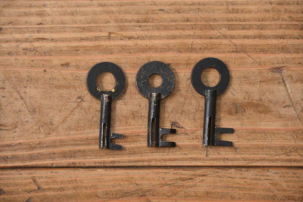 鍵は付属します。画像にありますように、袋に入れお付けします。スムーズに動くように調整していますが、あくまでも古いものや中古品ですので、長期の使用保証は出来かねます。ご購入後不具合が発生した場合は、当店でサポートさせていただきますので、お気軽にご相談くださいませ。