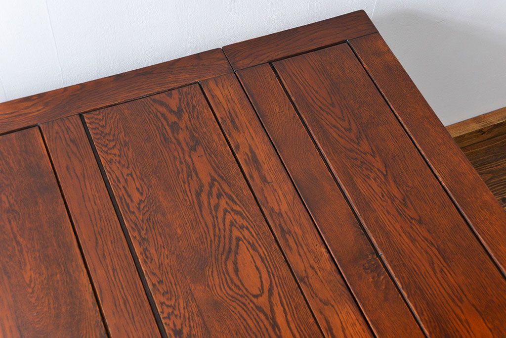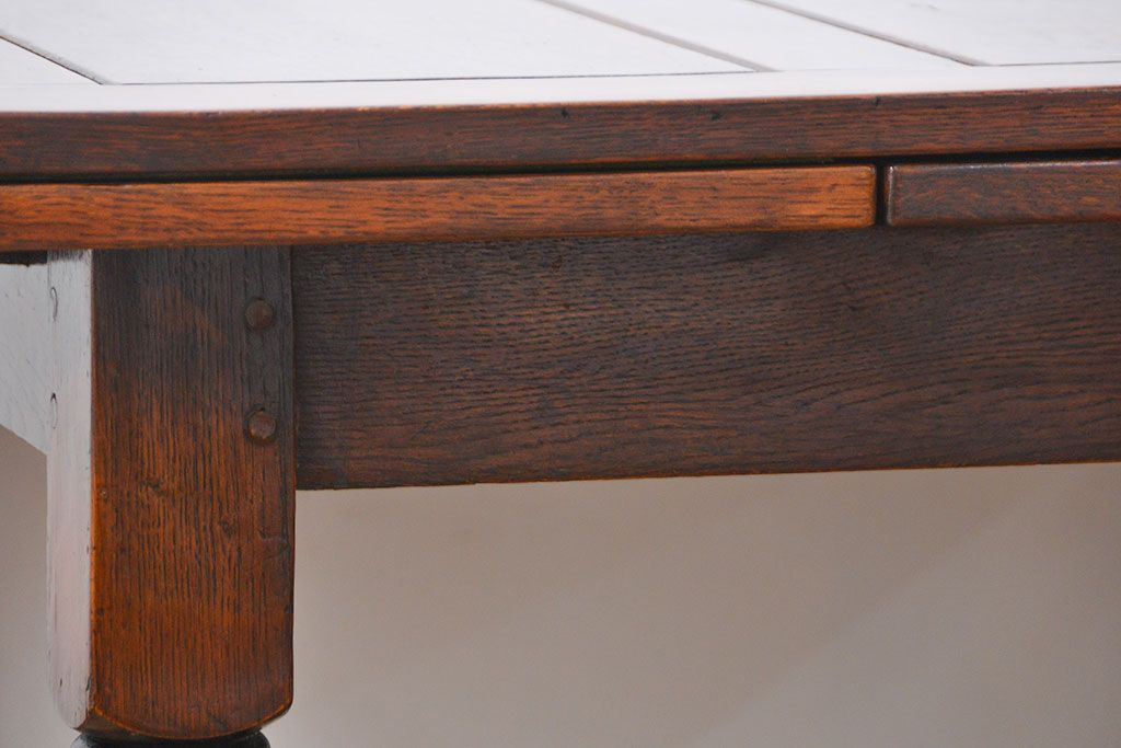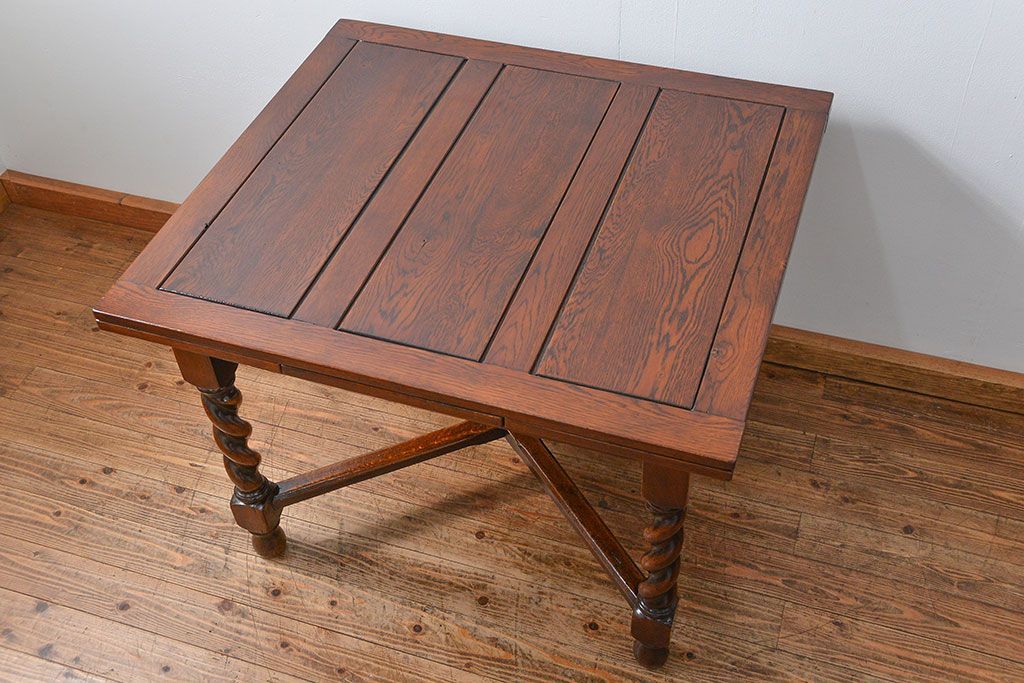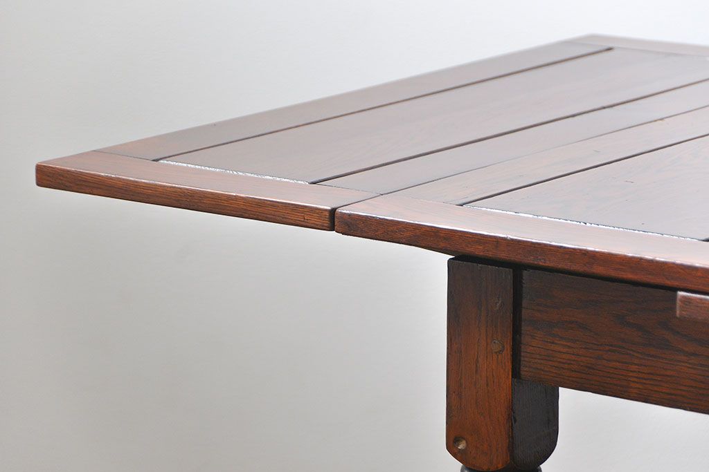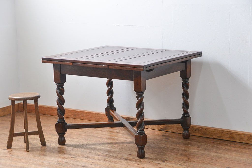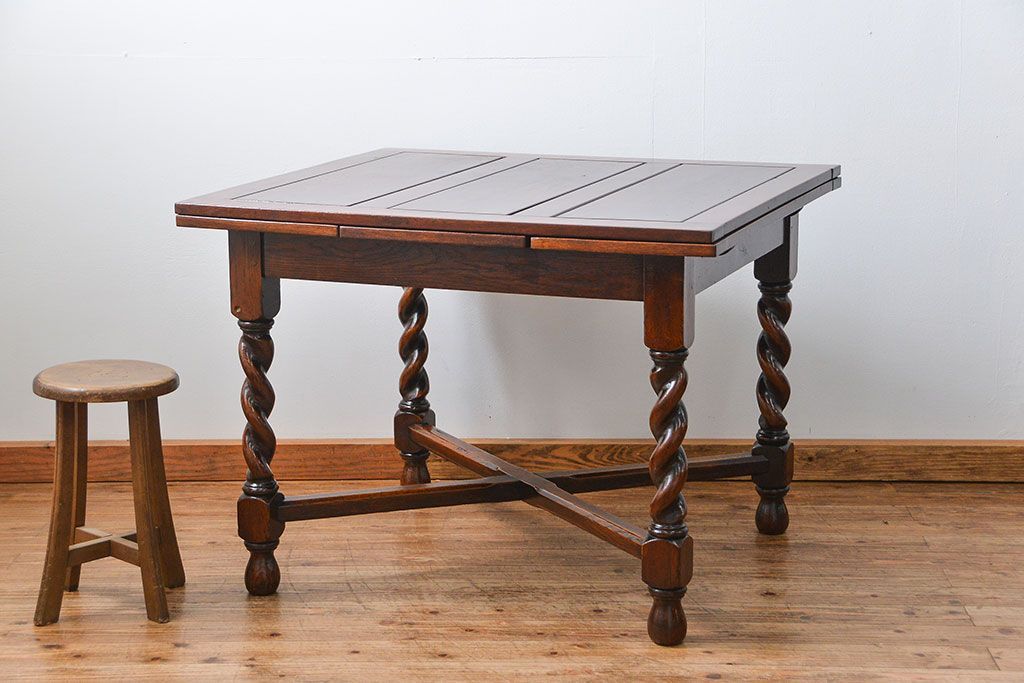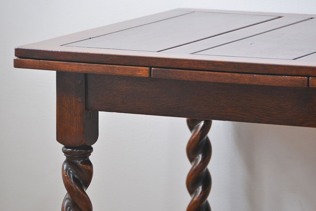 イギリスアンティーク ツイストレッグ オーク材 味わい深いドローリーフテーブル(エクステンションテーブル)です。