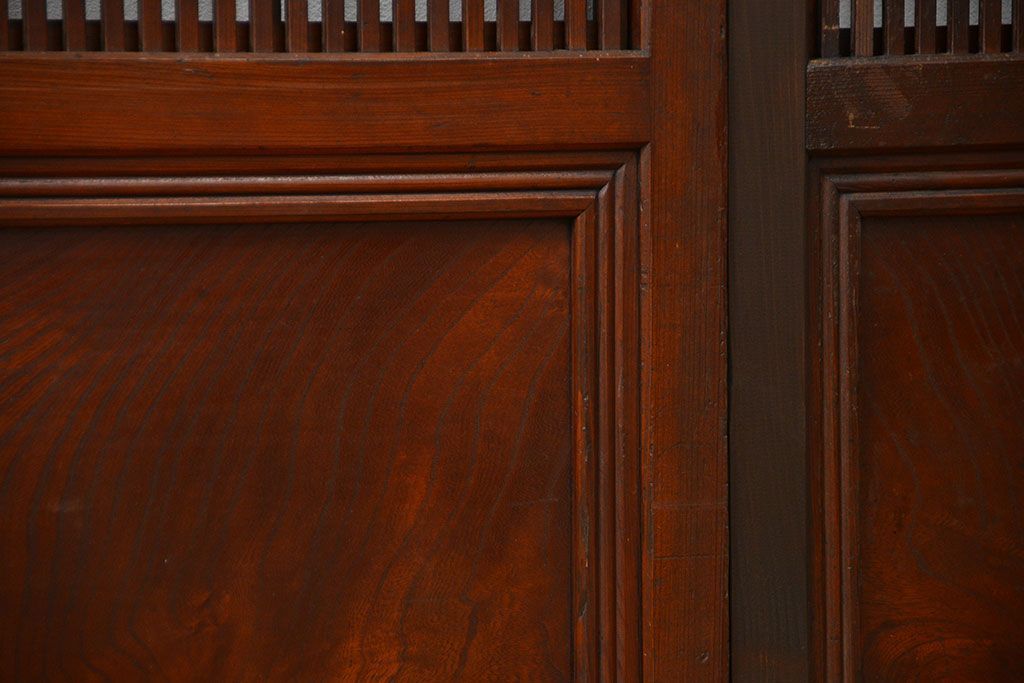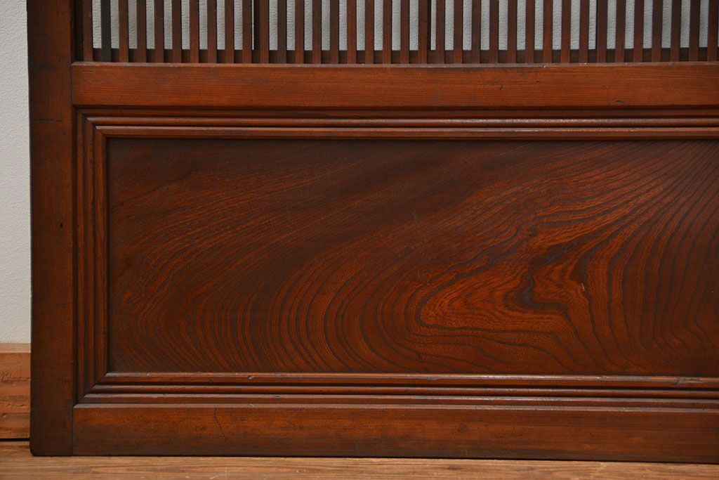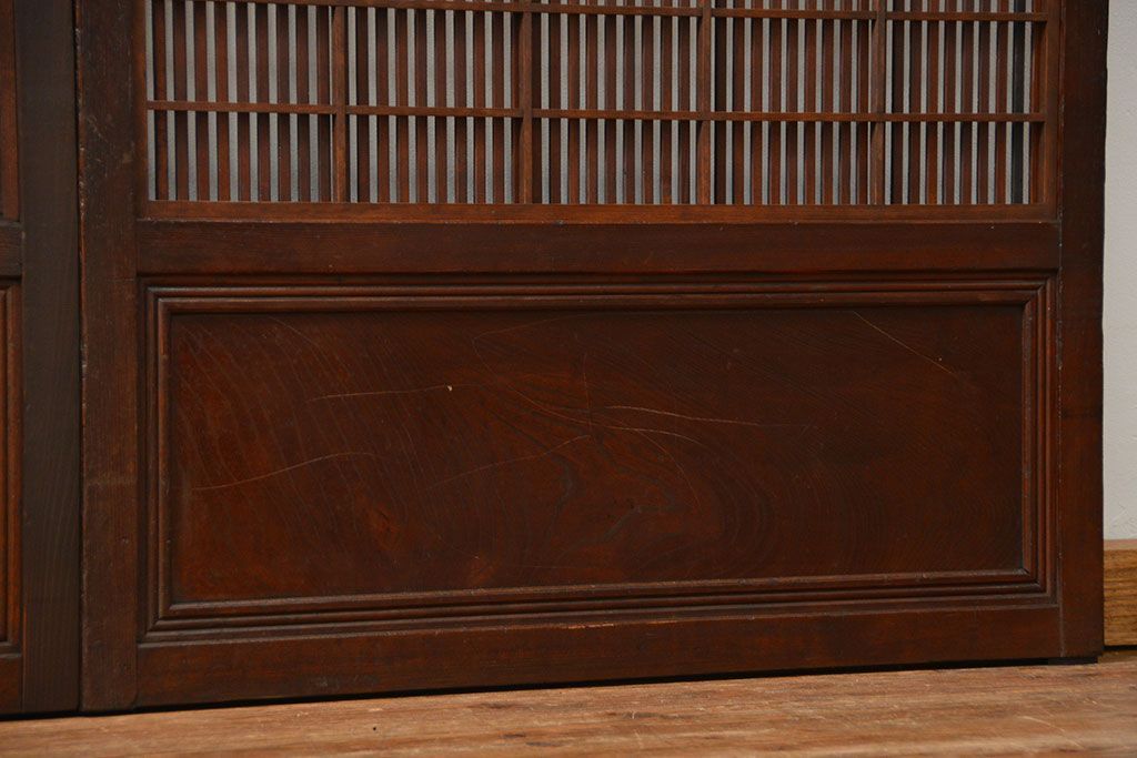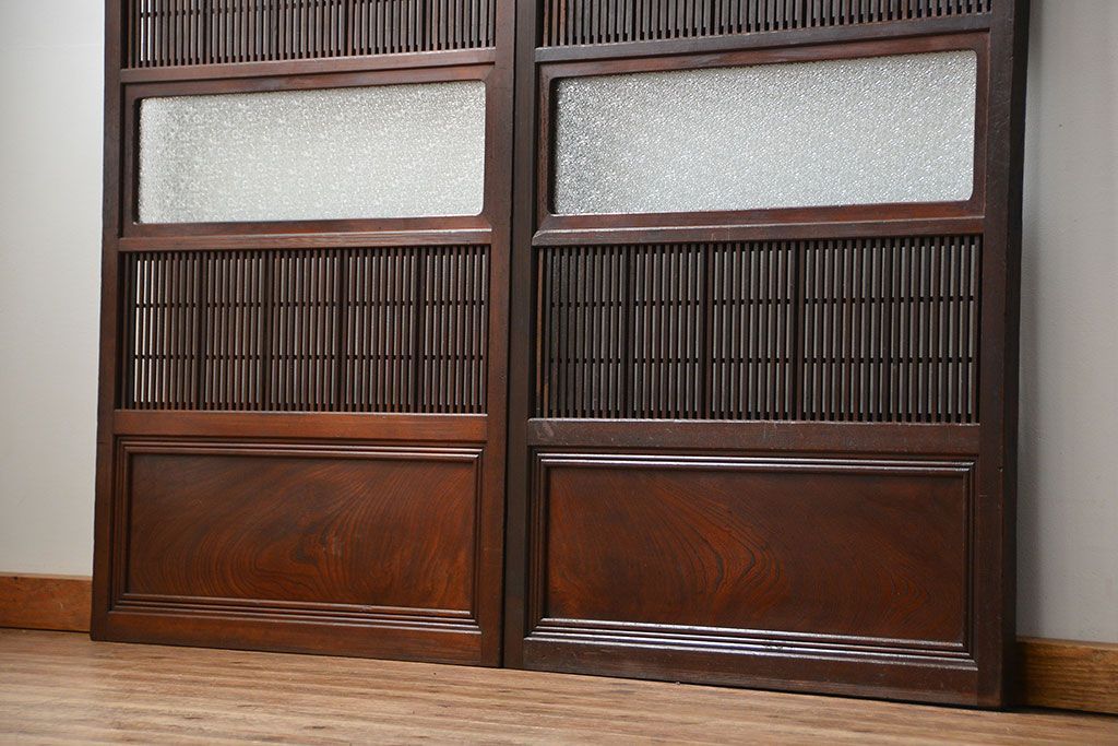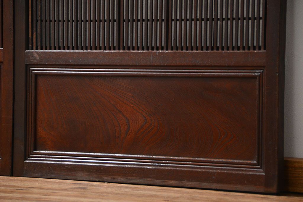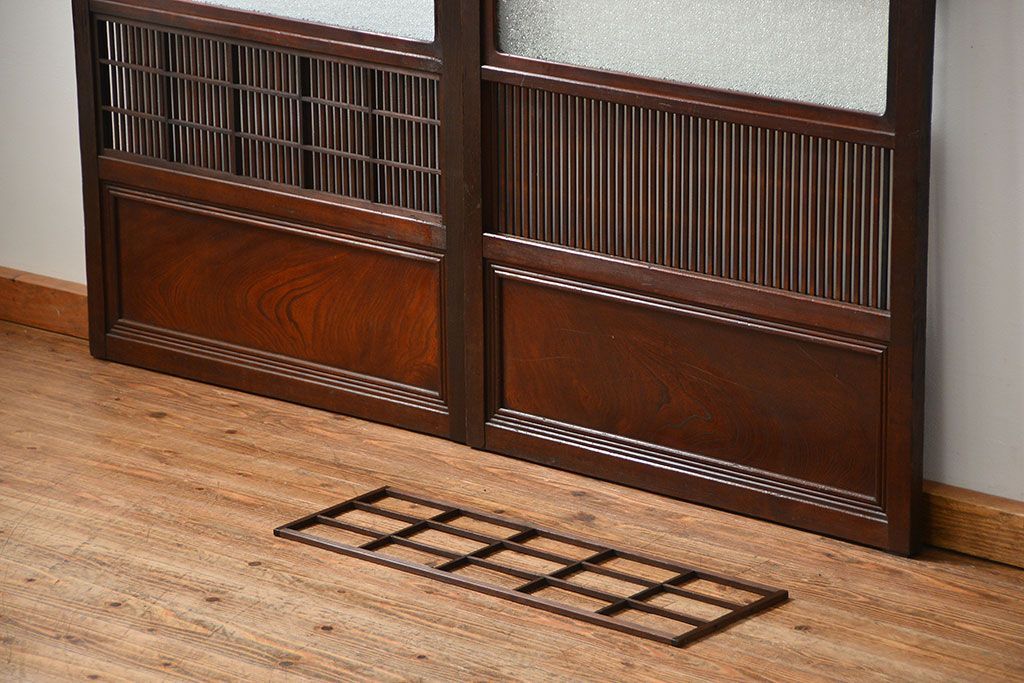 アンティーク 腰板欅材の上質な裏障子付き格子戸 2枚セット (和風建具、引き戸)
