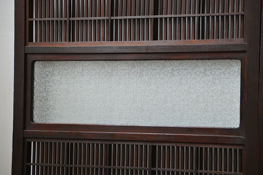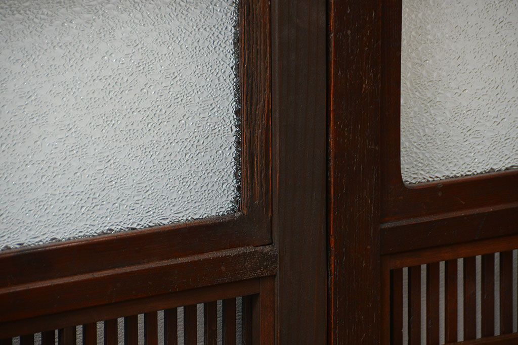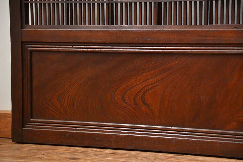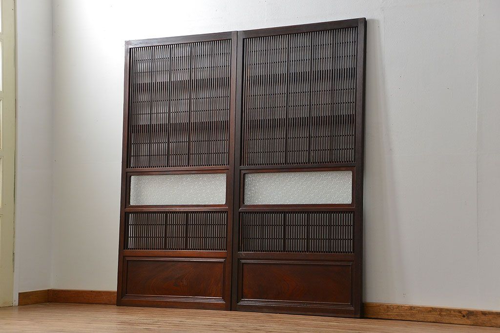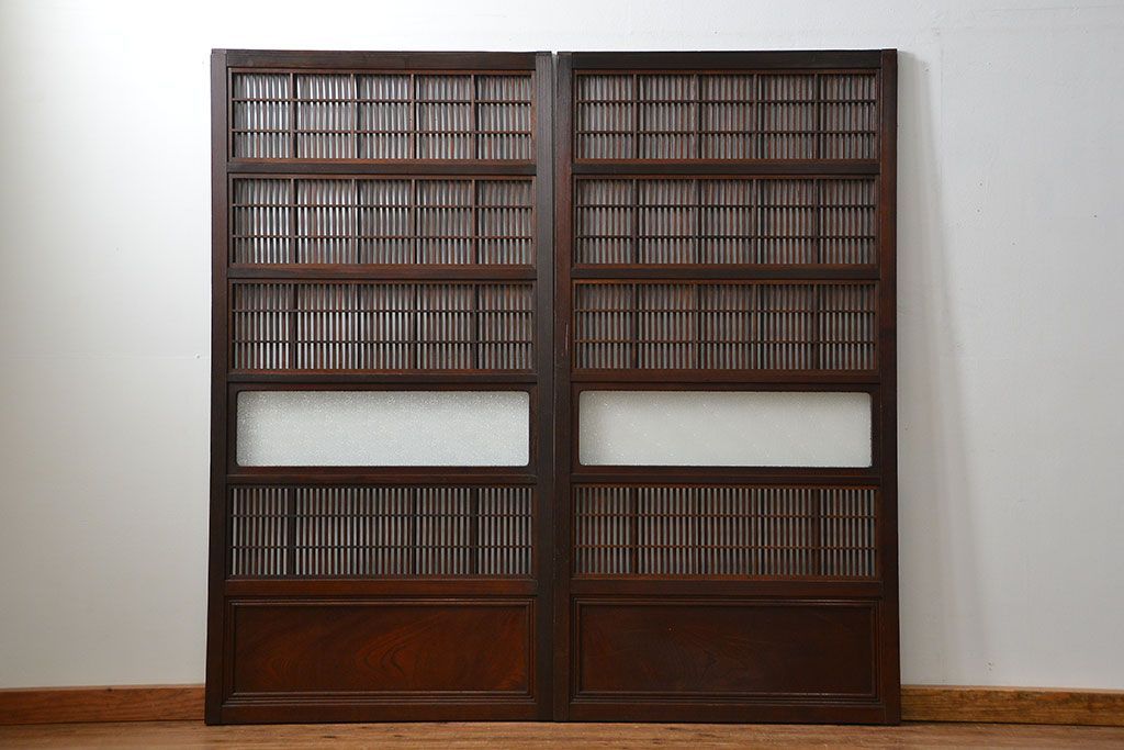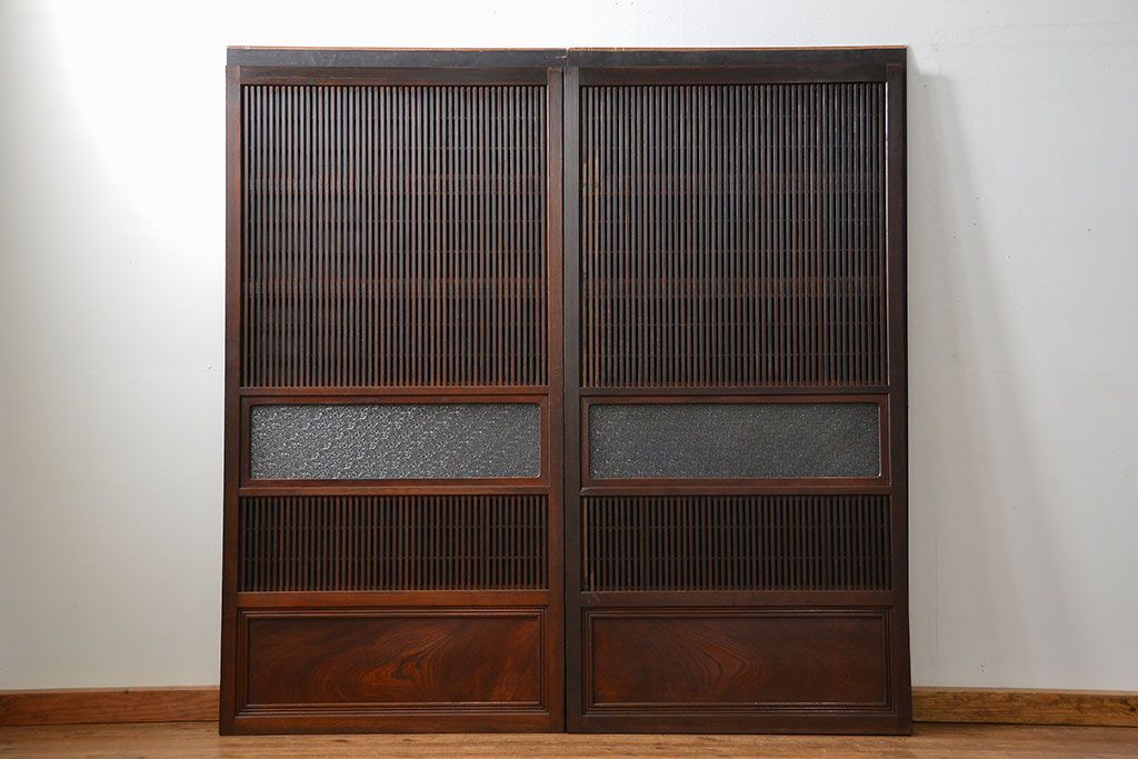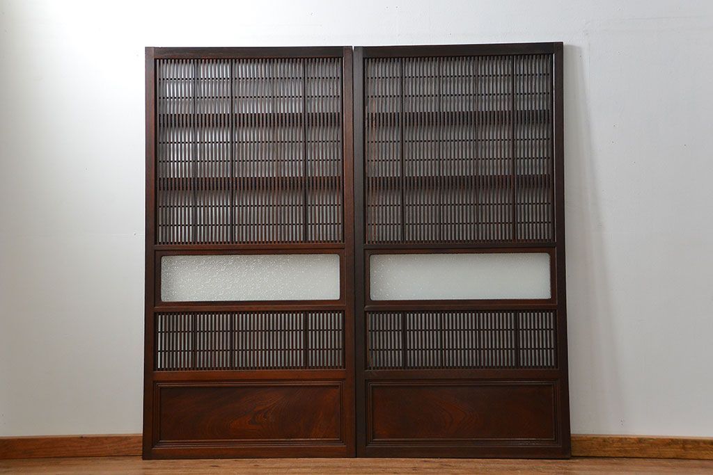アンティーク 腰板欅材の上質な裏障子付き格子戸 2枚セット (和風建具、引き戸)