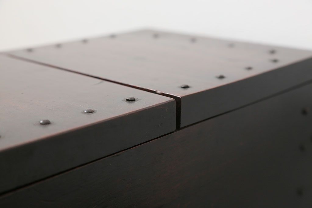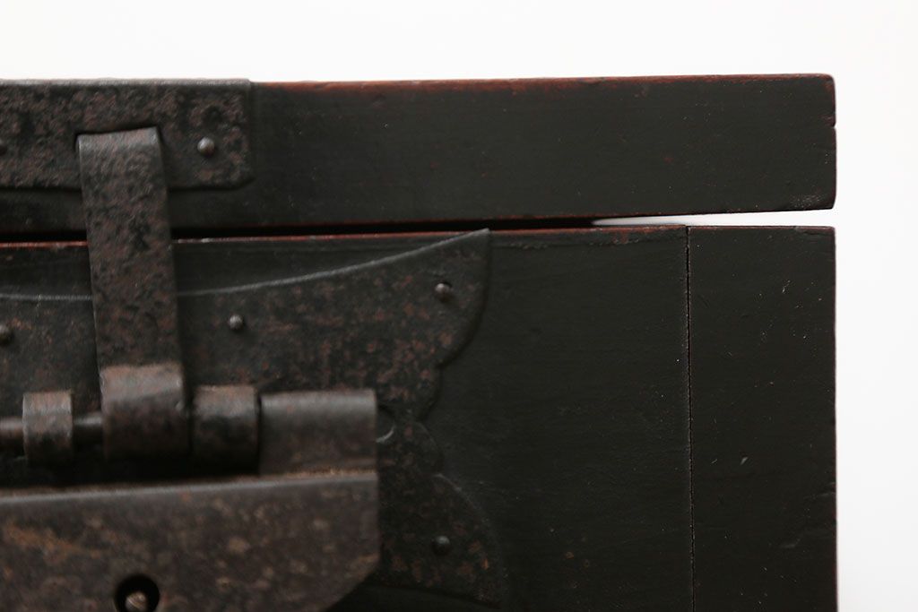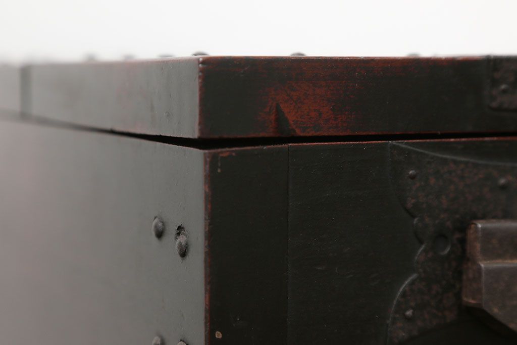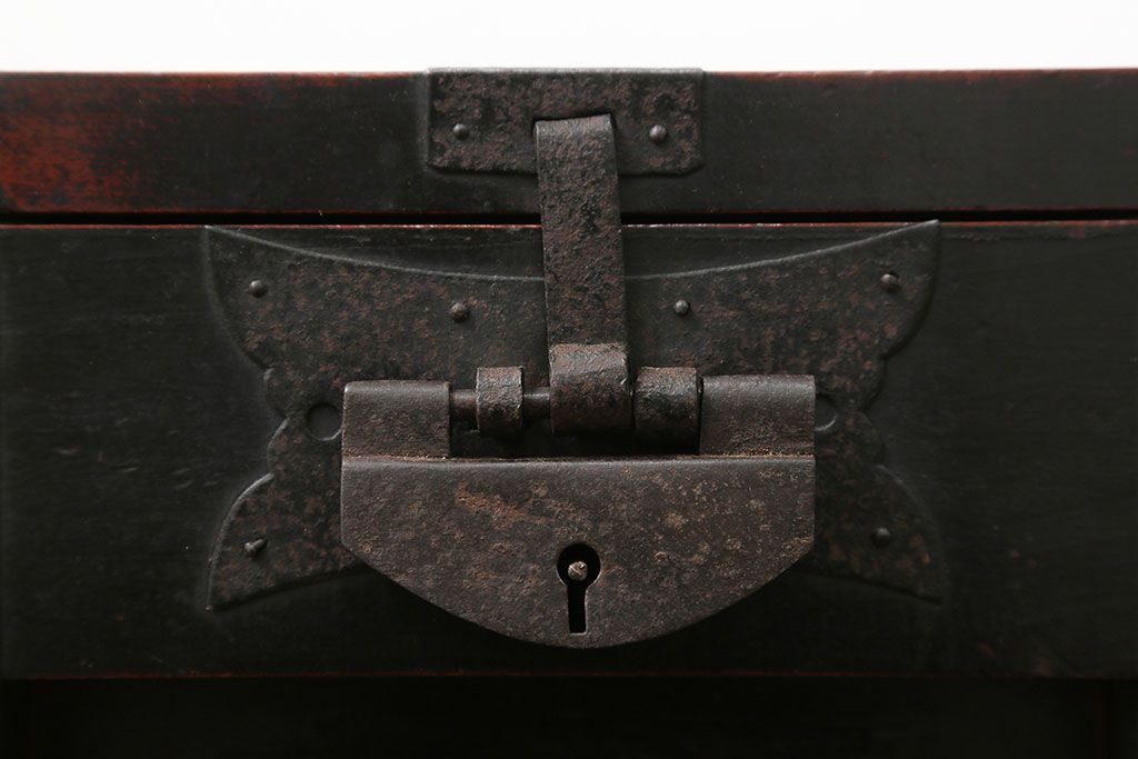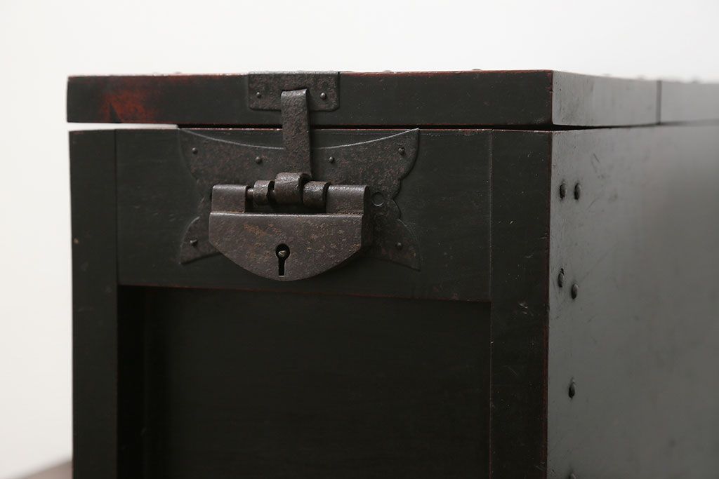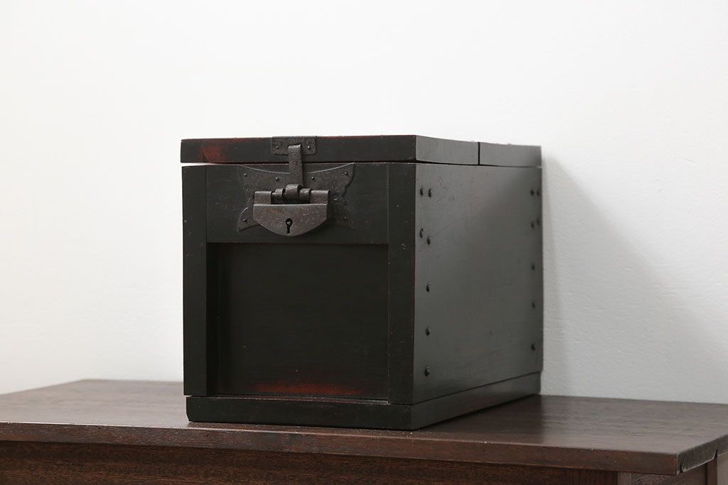 古民具・骨董 錠前付きの古い桜材の重厚な銭箱(銭函)です。