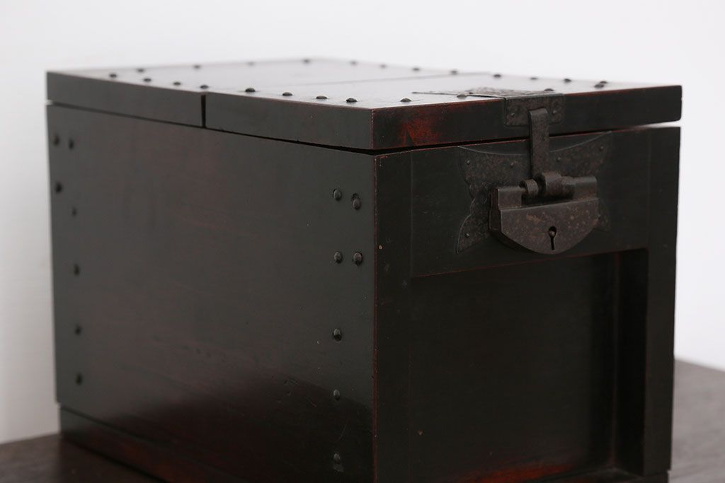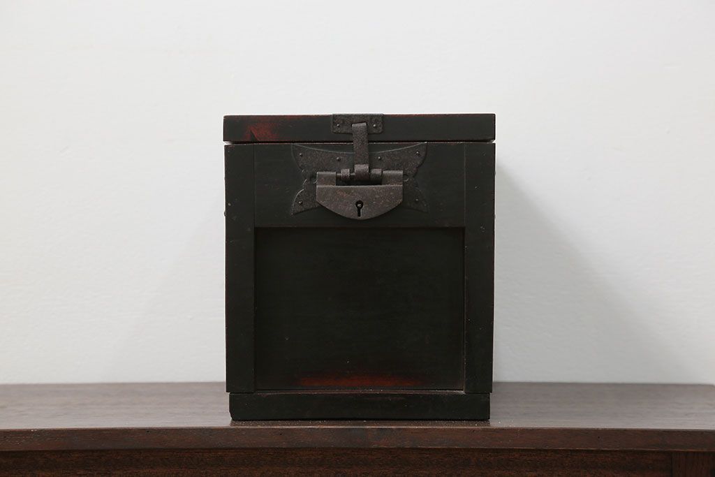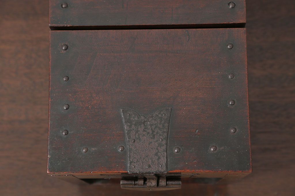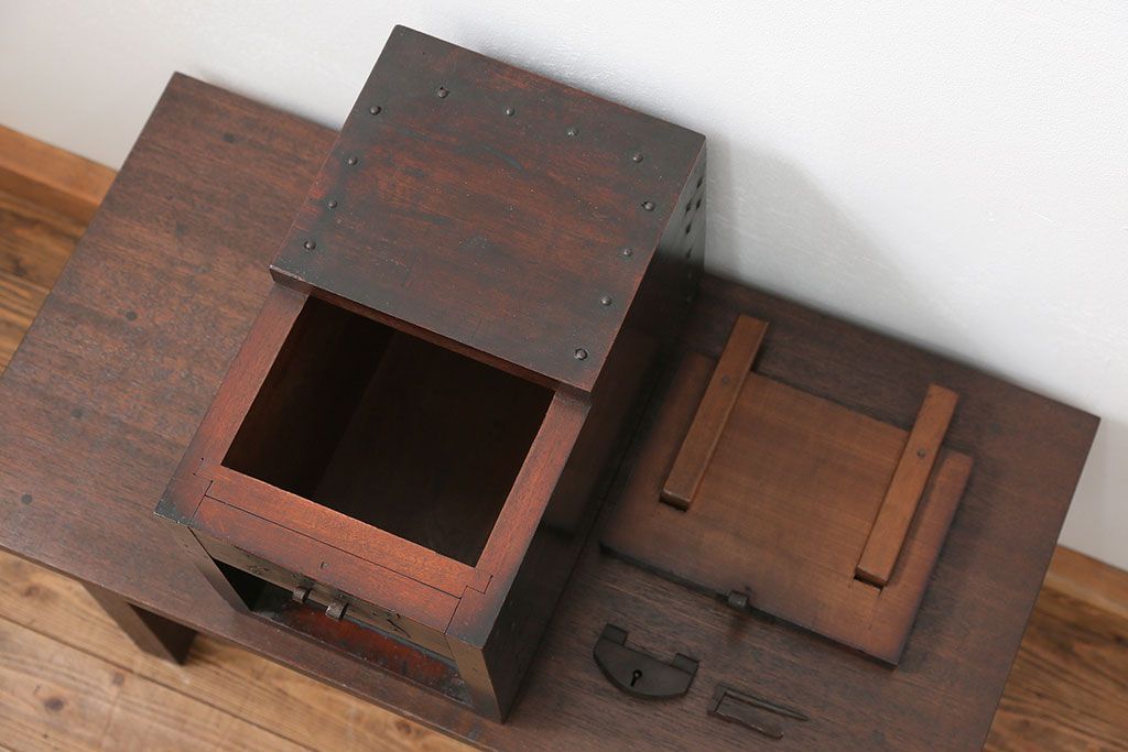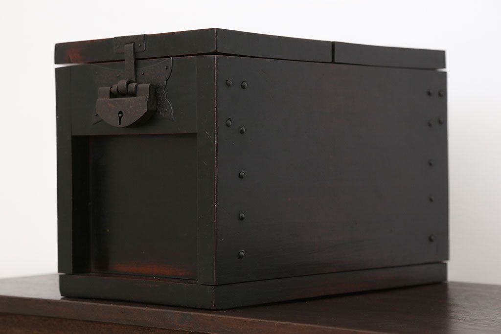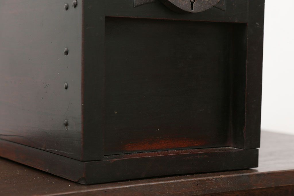 アンティーク雑貨 古民具・骨董 錠前付きの古い桜材の重厚な銭箱(銭函)