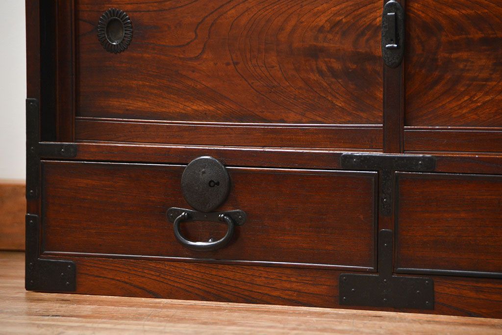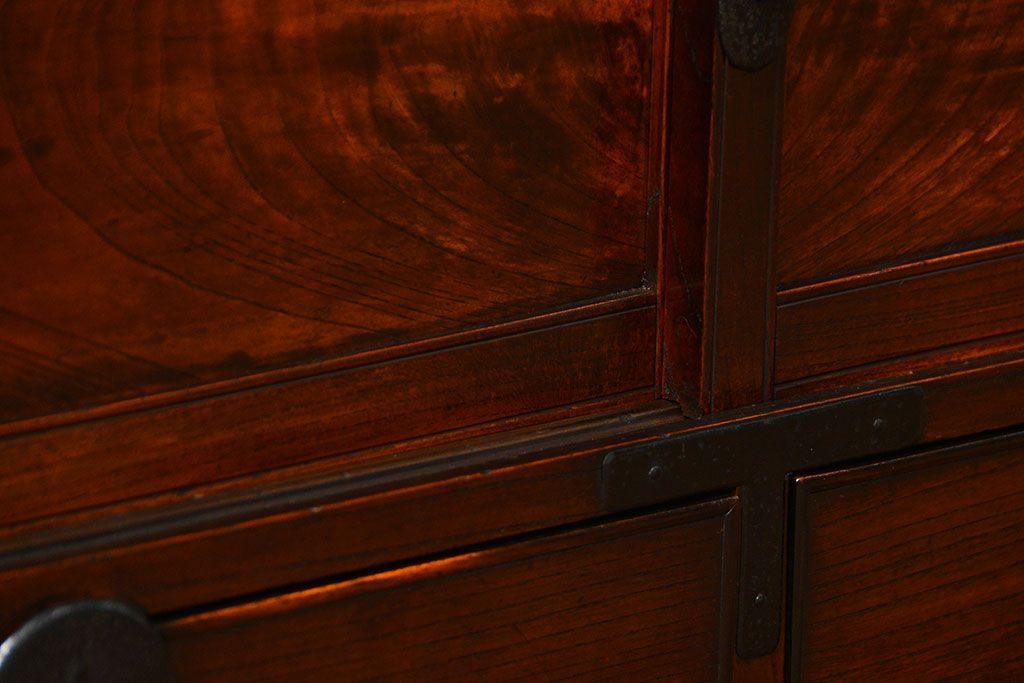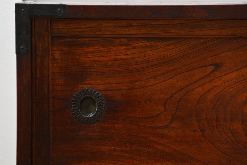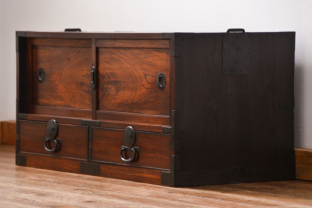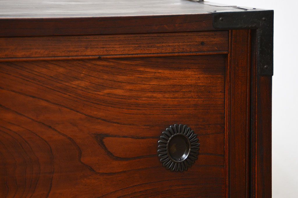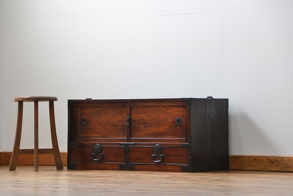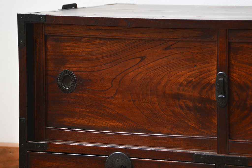 ラフジュ工房> 和箪笥 > アンティーク家具 古民具・骨董 前面欅材の黒柿枠引き出し時代箪笥ローボード(ローチェスト)