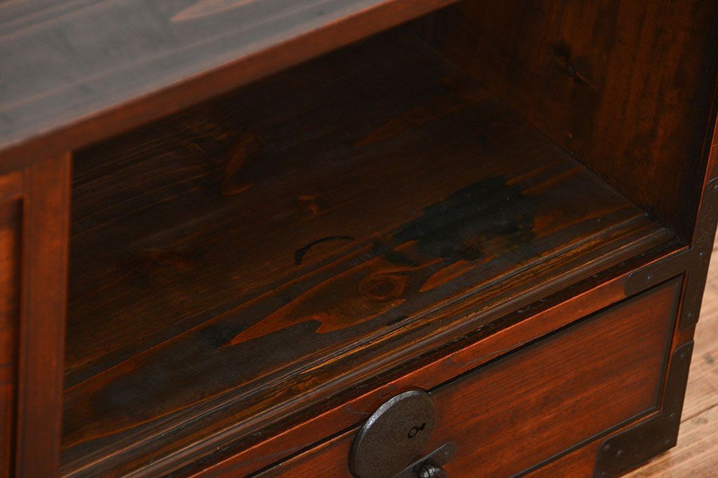 ラフジュ工房> キャビネット・戸棚> テレビ台・ローボード > アンティーク家具 古民具・骨董 前面欅材の黒柿枠引き出し時代箪笥ローボード(ローチェスト)