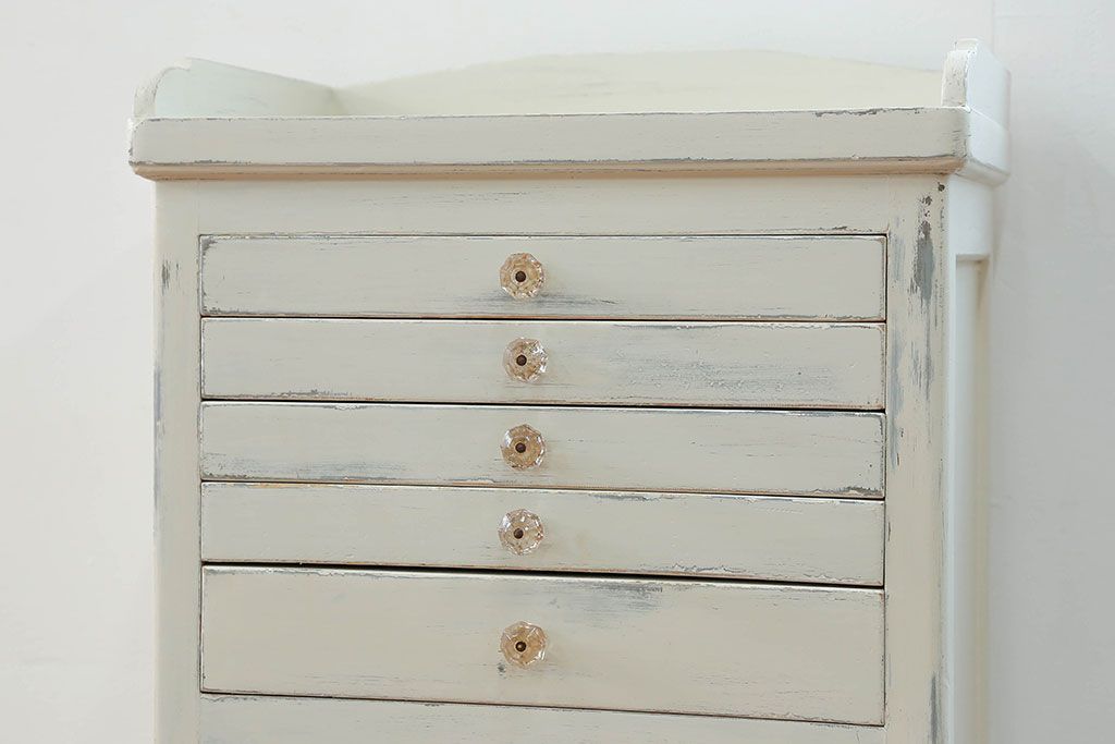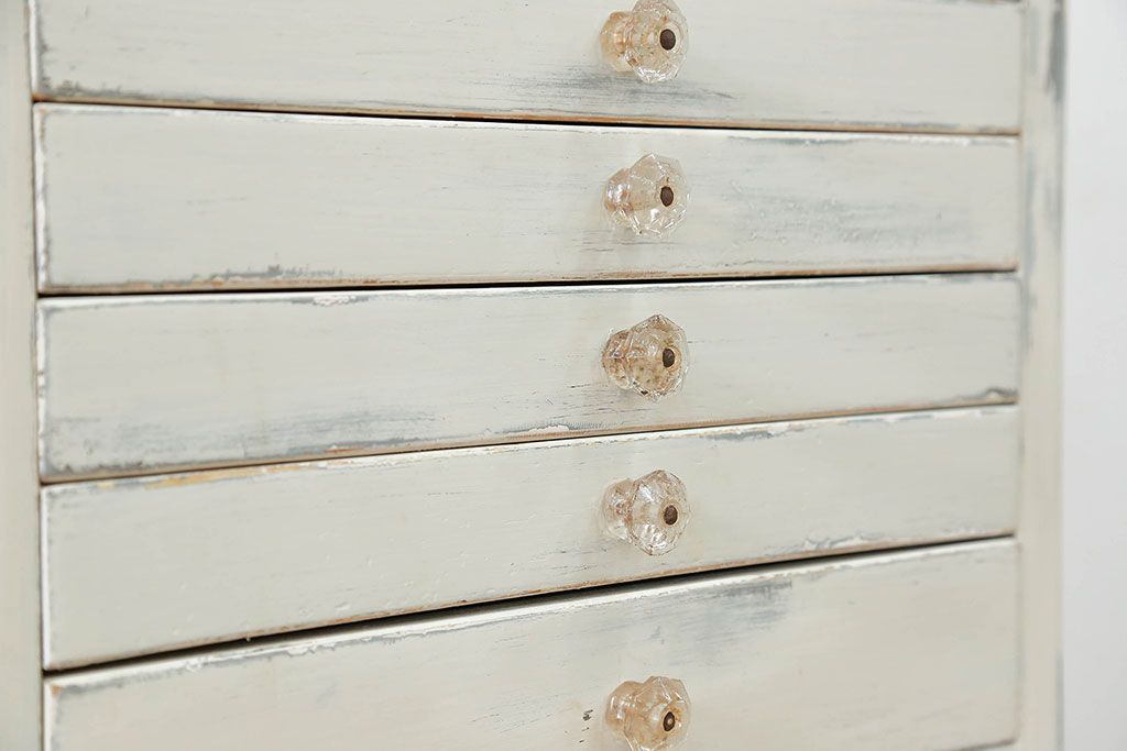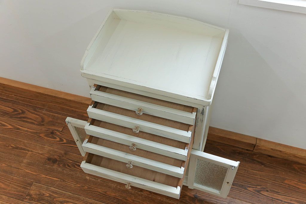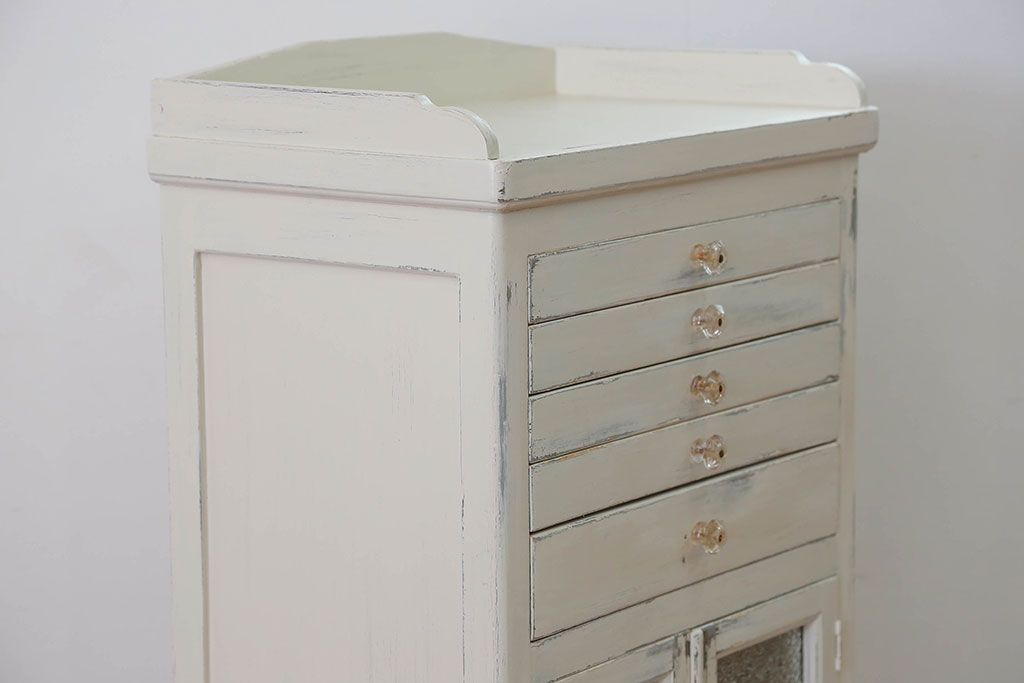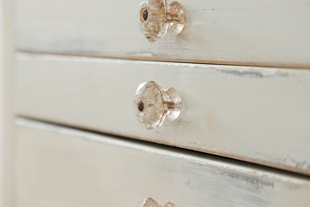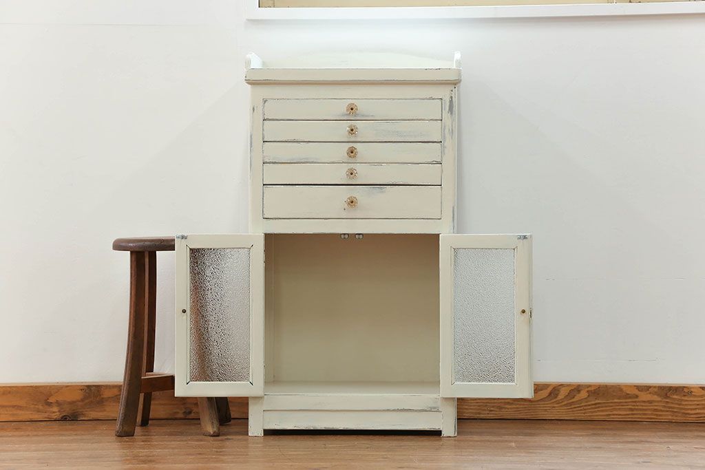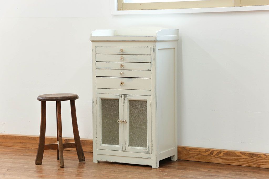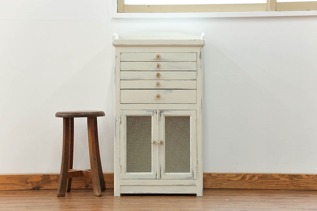 ラフジュ工房> キャビネット・戸棚> 医療用キャビネット・ケビント > アンティーク家具 アンティークペイント ガラスの取っ手付き ダイヤガラスデンタルキャビネット(1)(収納棚、ケビント)