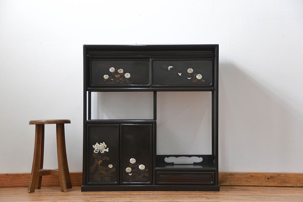 古民具・骨董 唐木製の蒔絵と螺鈿細工の飾り棚(茶棚)です。