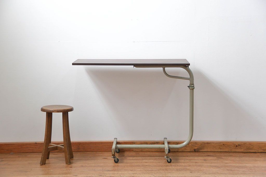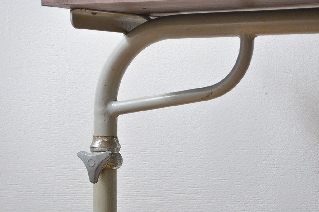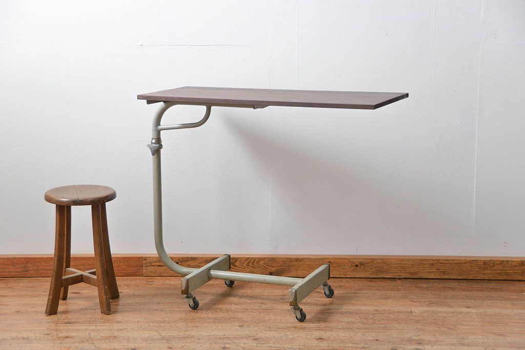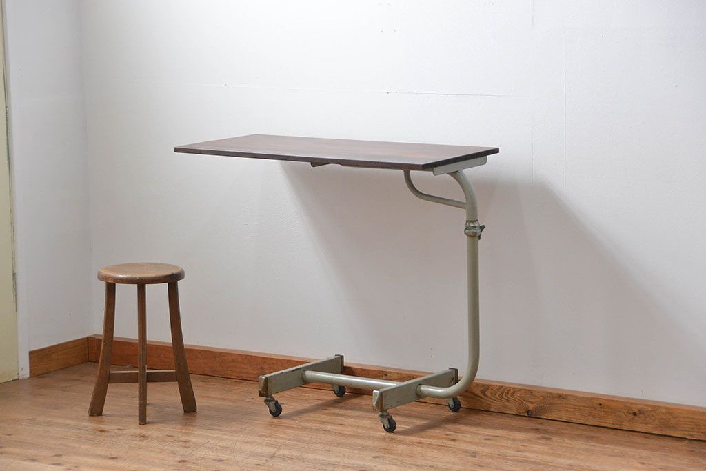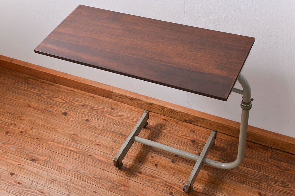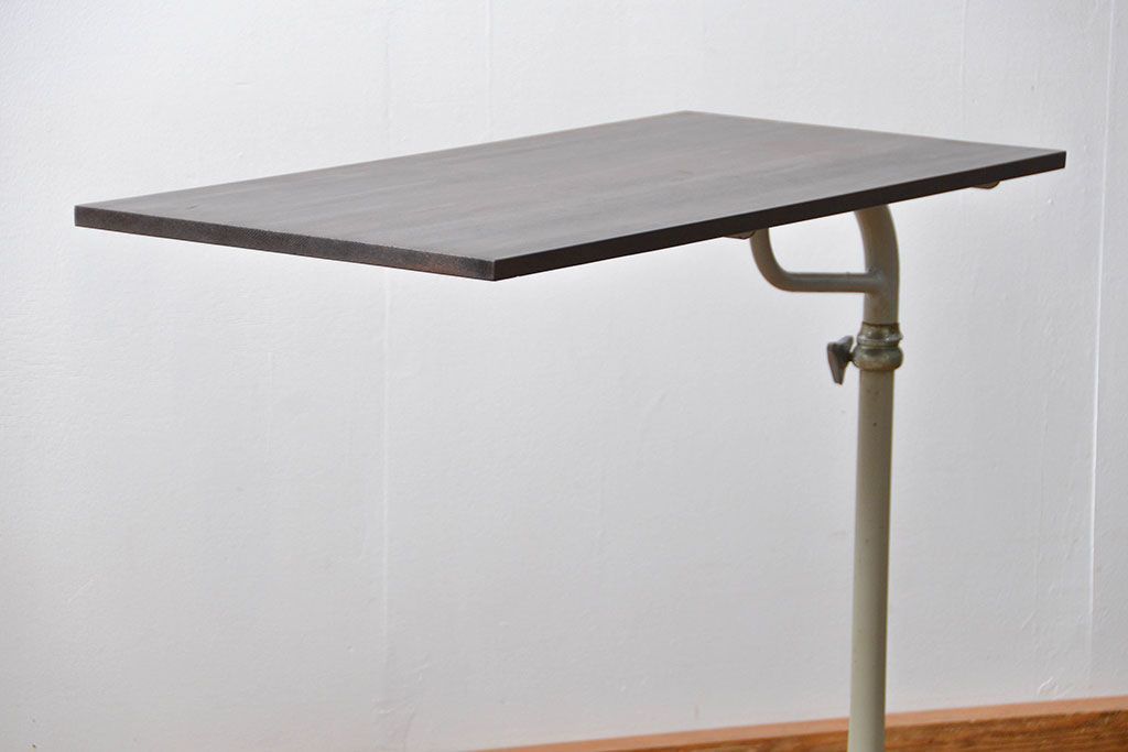 アンティーク家具 古い病院の天板無垢材の伸縮鉄脚テーブル2(作業台/キャスター付き)(サイドテーブル)