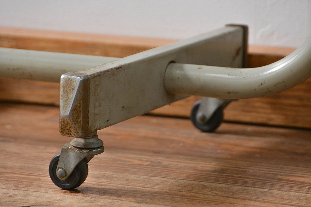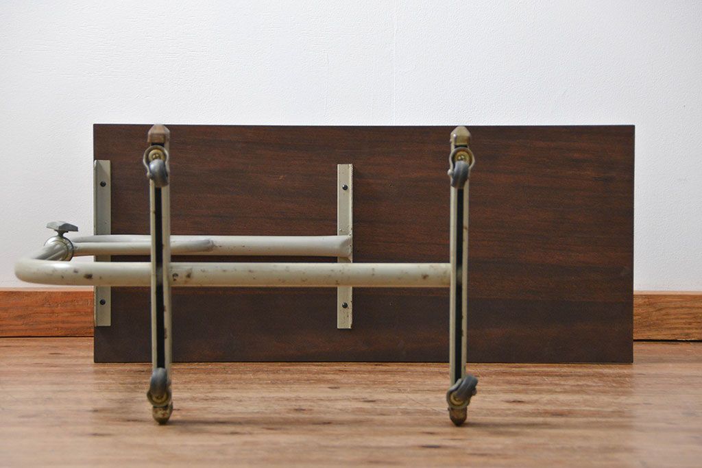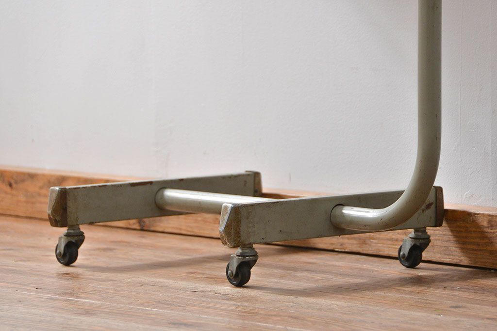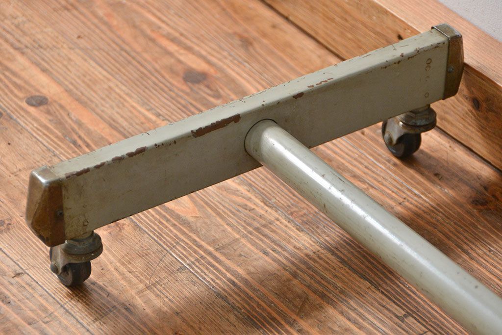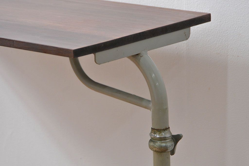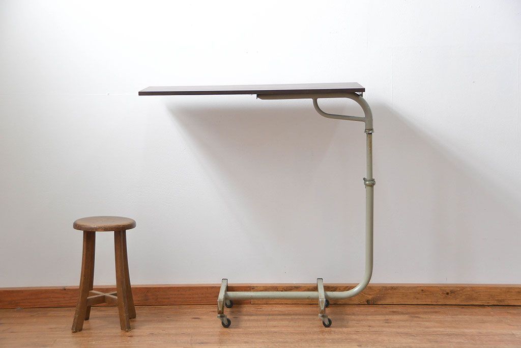 アンティーク家具 古い病院の天板無垢材の伸縮鉄脚テーブル2(作業台/キャスター付き)(サイドテーブル)