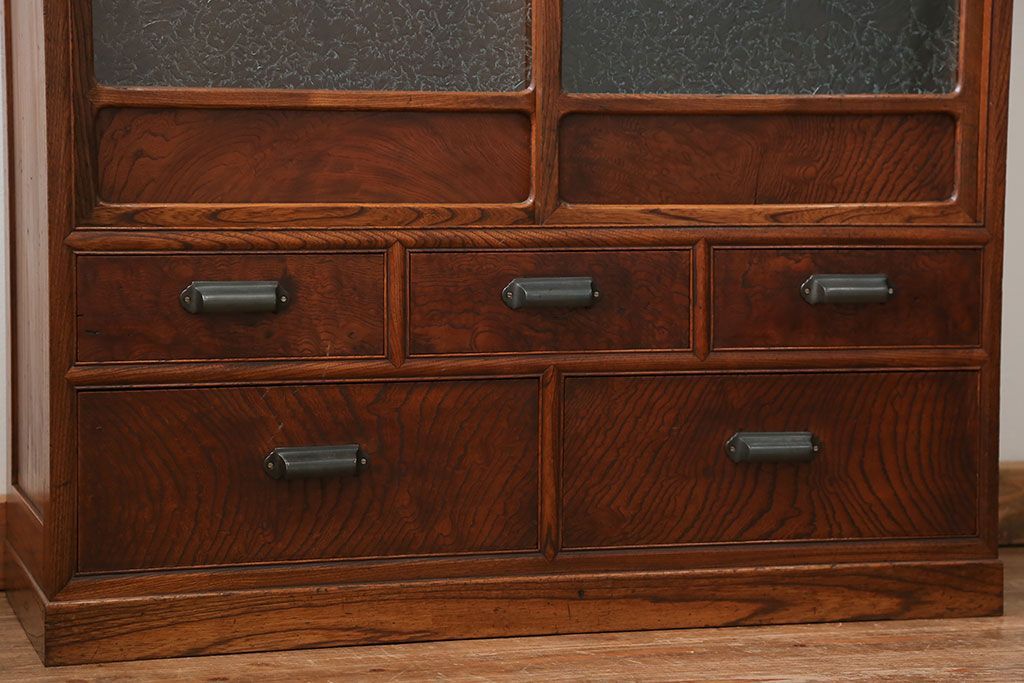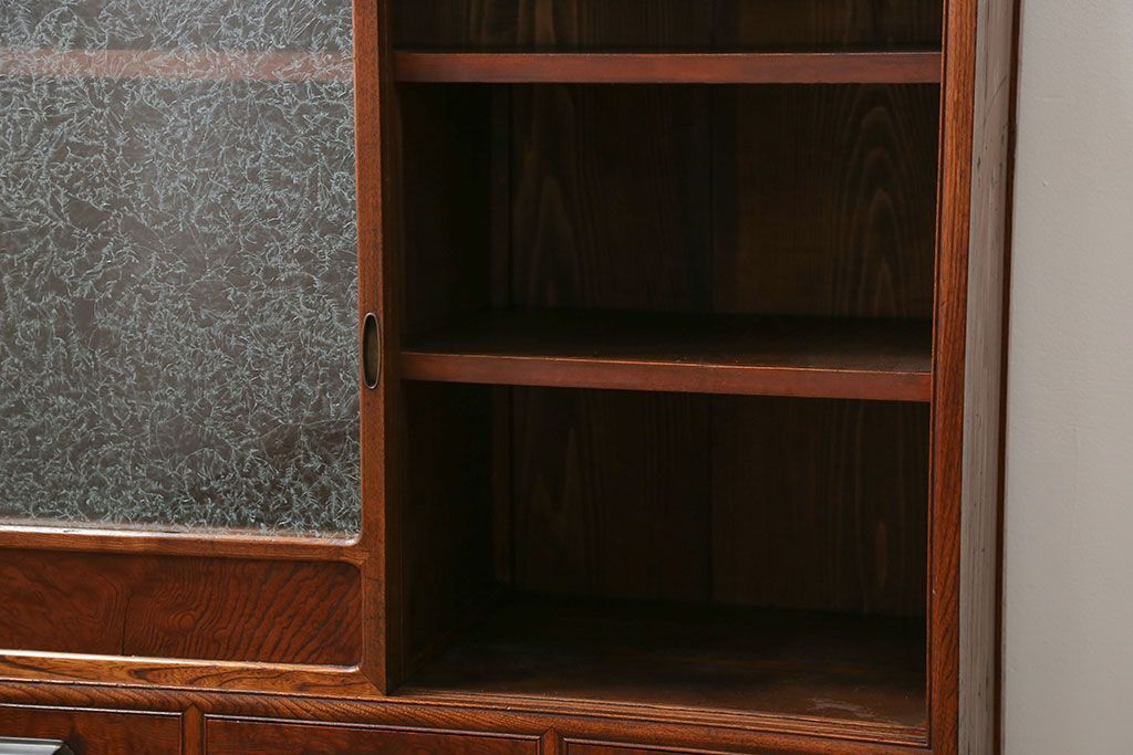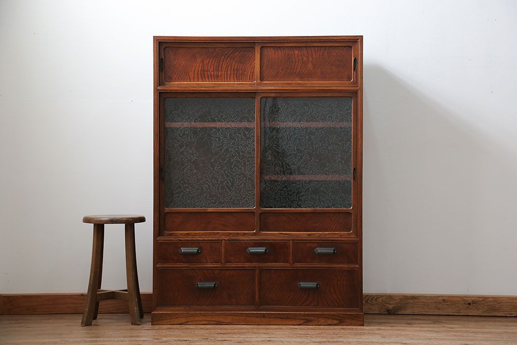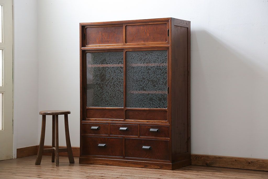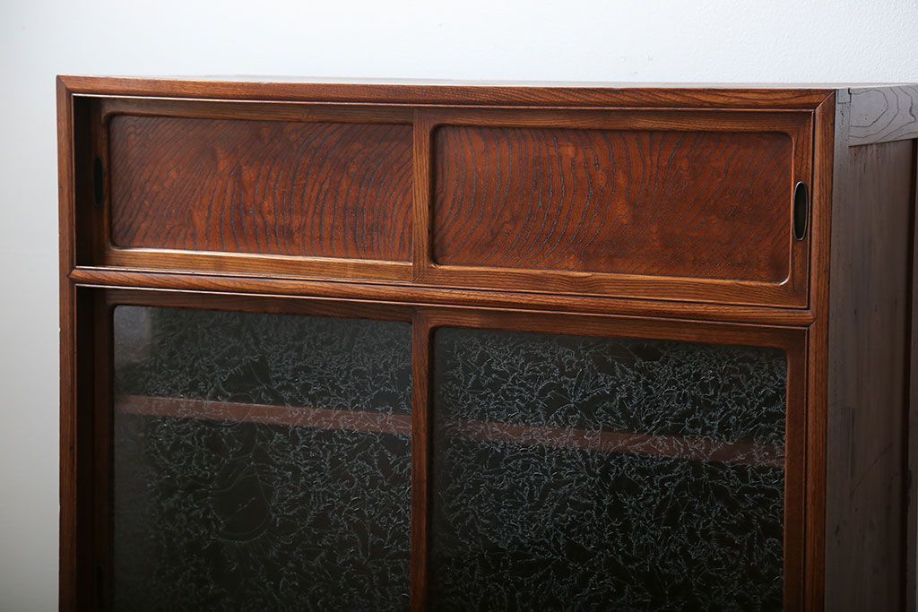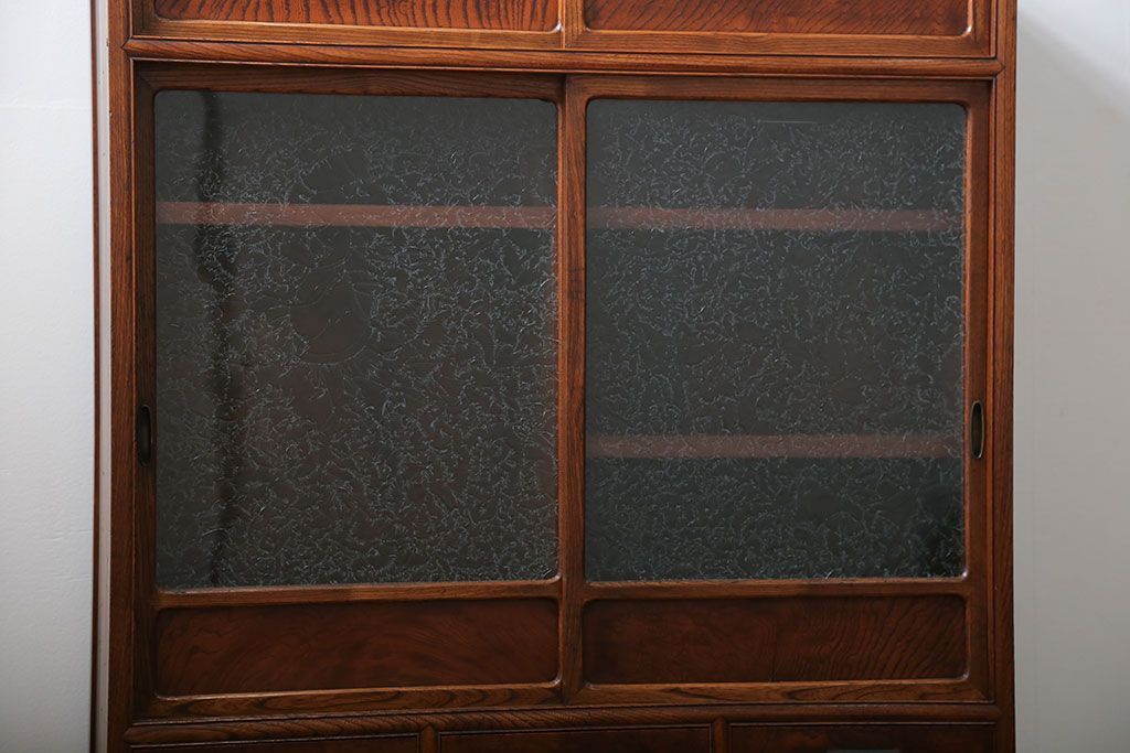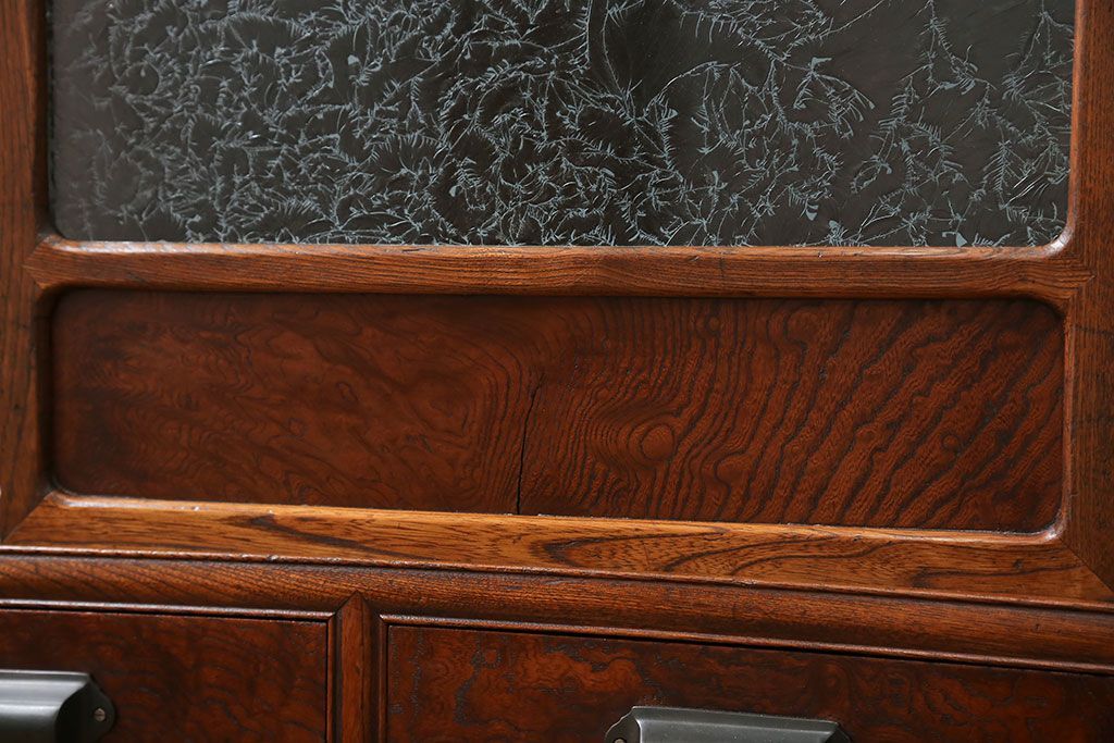 アンティーク家具 古民具・骨董 前面欅材の結霜ガラス茶箪笥(収納棚)