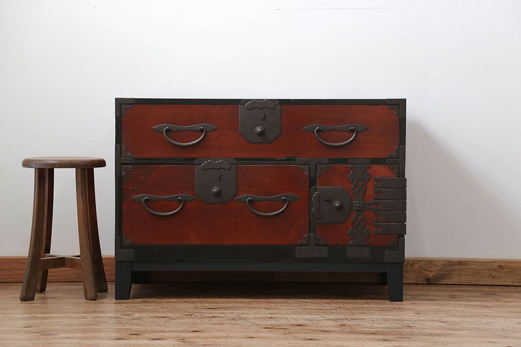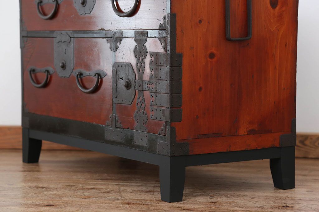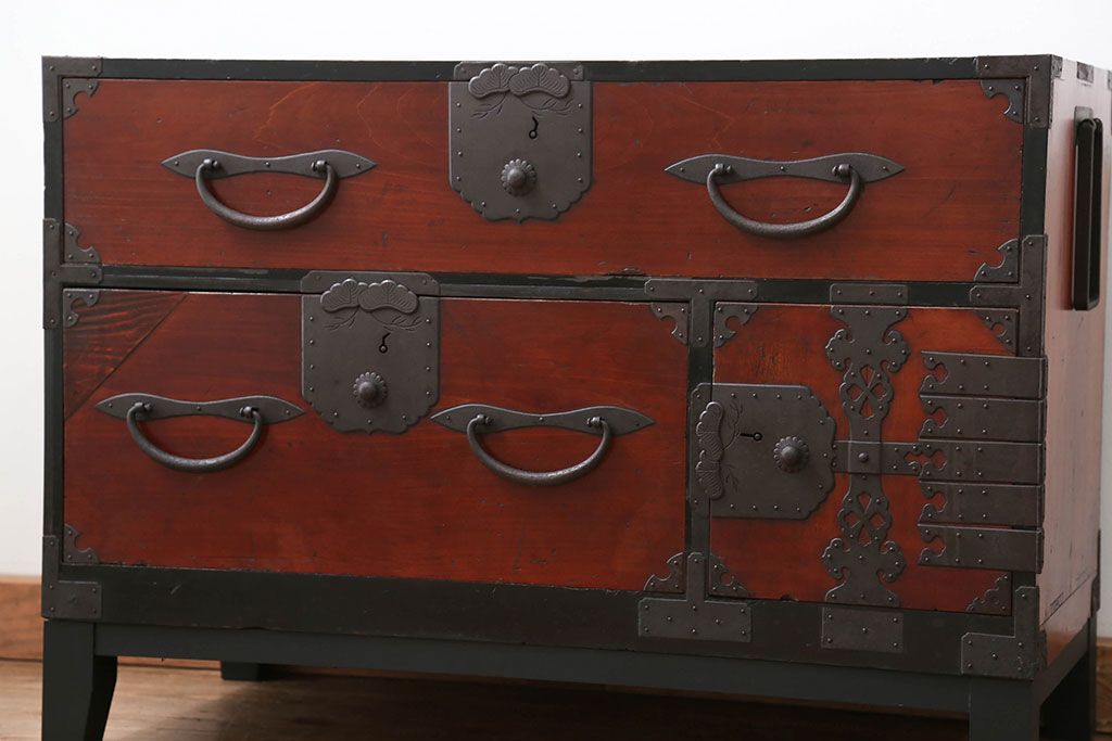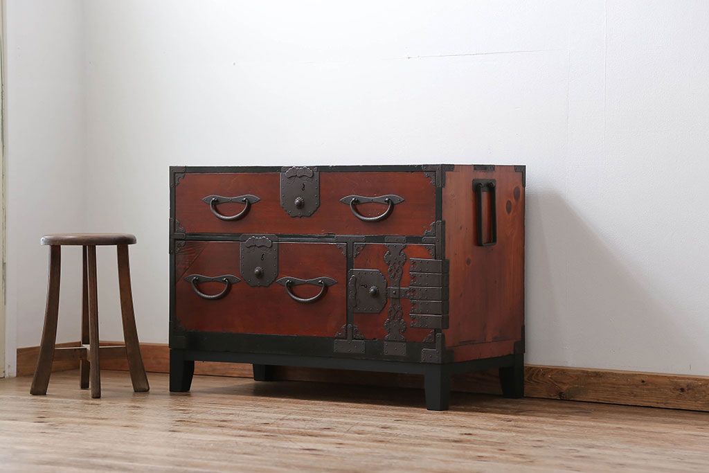 和箪笥> 衣装箪笥 > アンティーク家具 古民具・骨董 脚付き二本松箪笥ローチェスト(2)(時代箪笥ローボード)