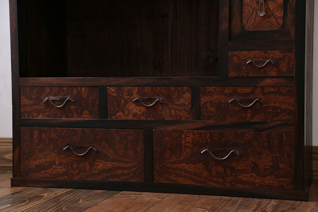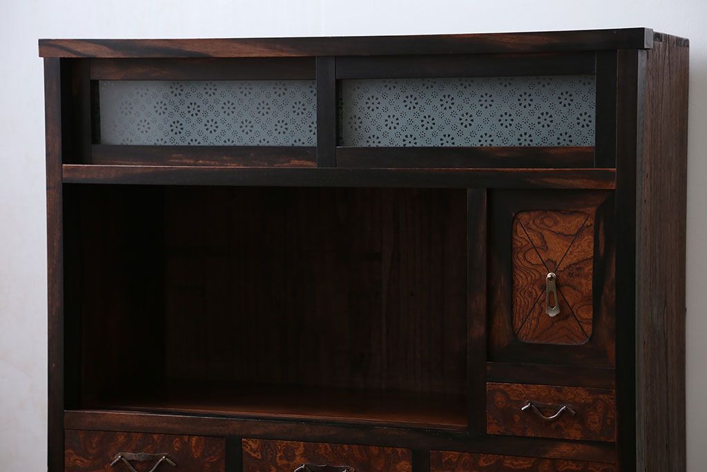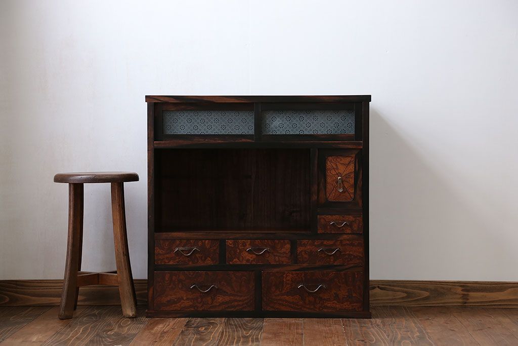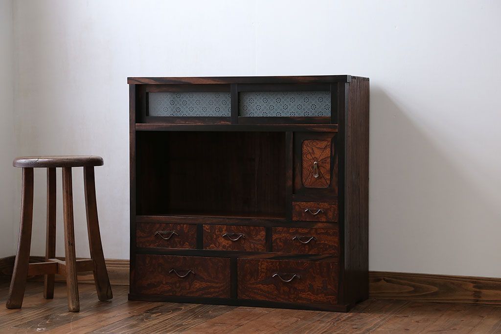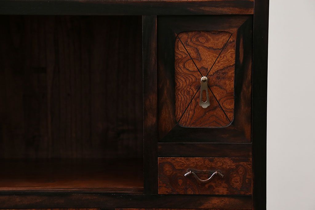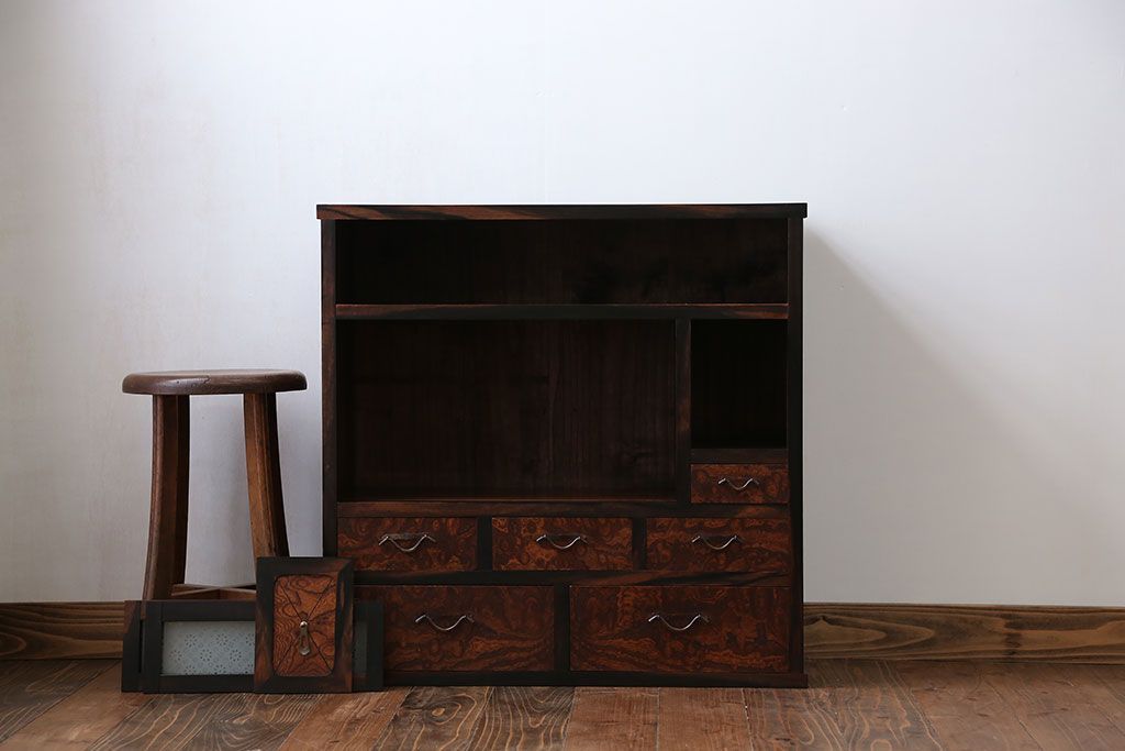 アンティーク家具 アンティーク 前面欅材と黒柿無垢材の小さな茶箪笥(茶棚、飾り棚)