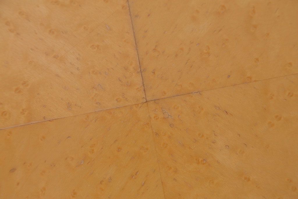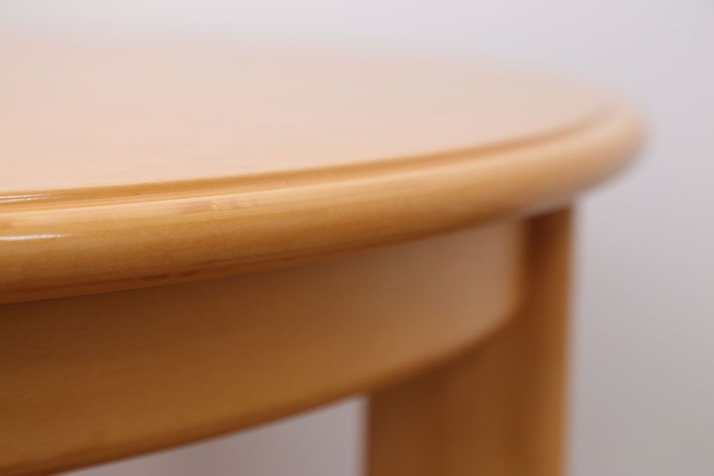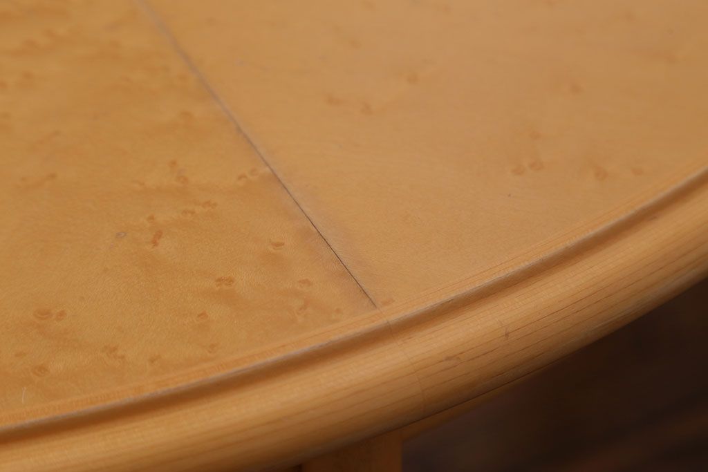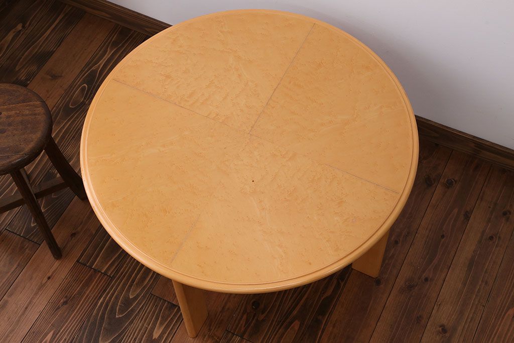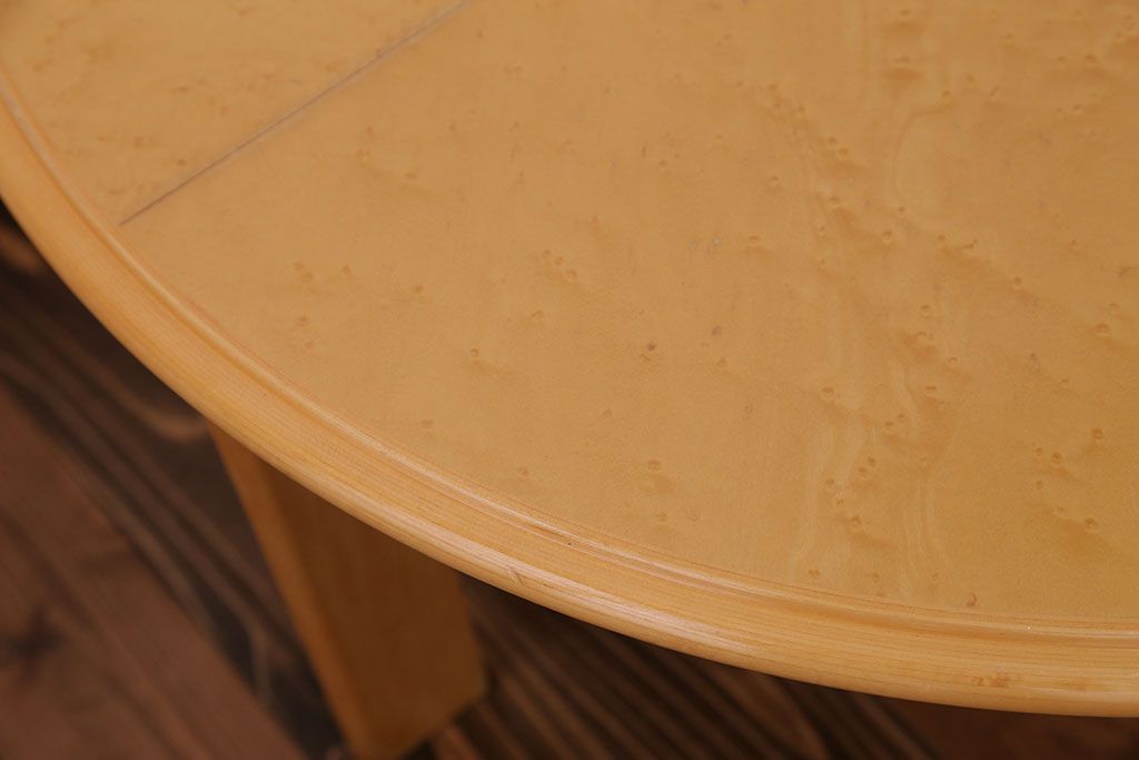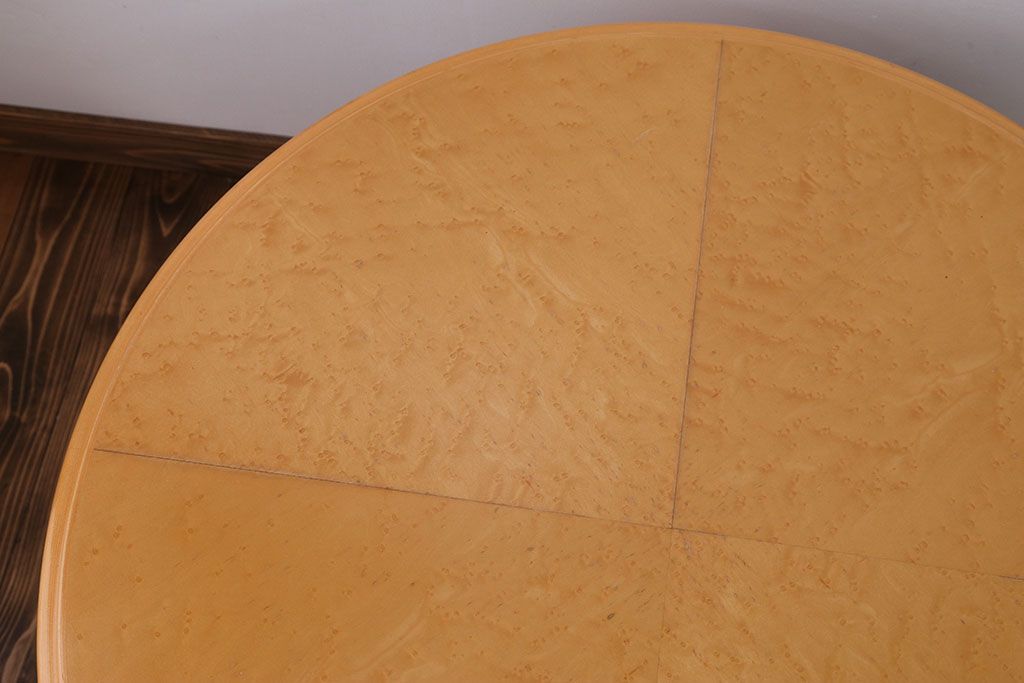 天板の杢目が鳥眼杢(バーズアイ)になっている、美しい丸テーブルです。